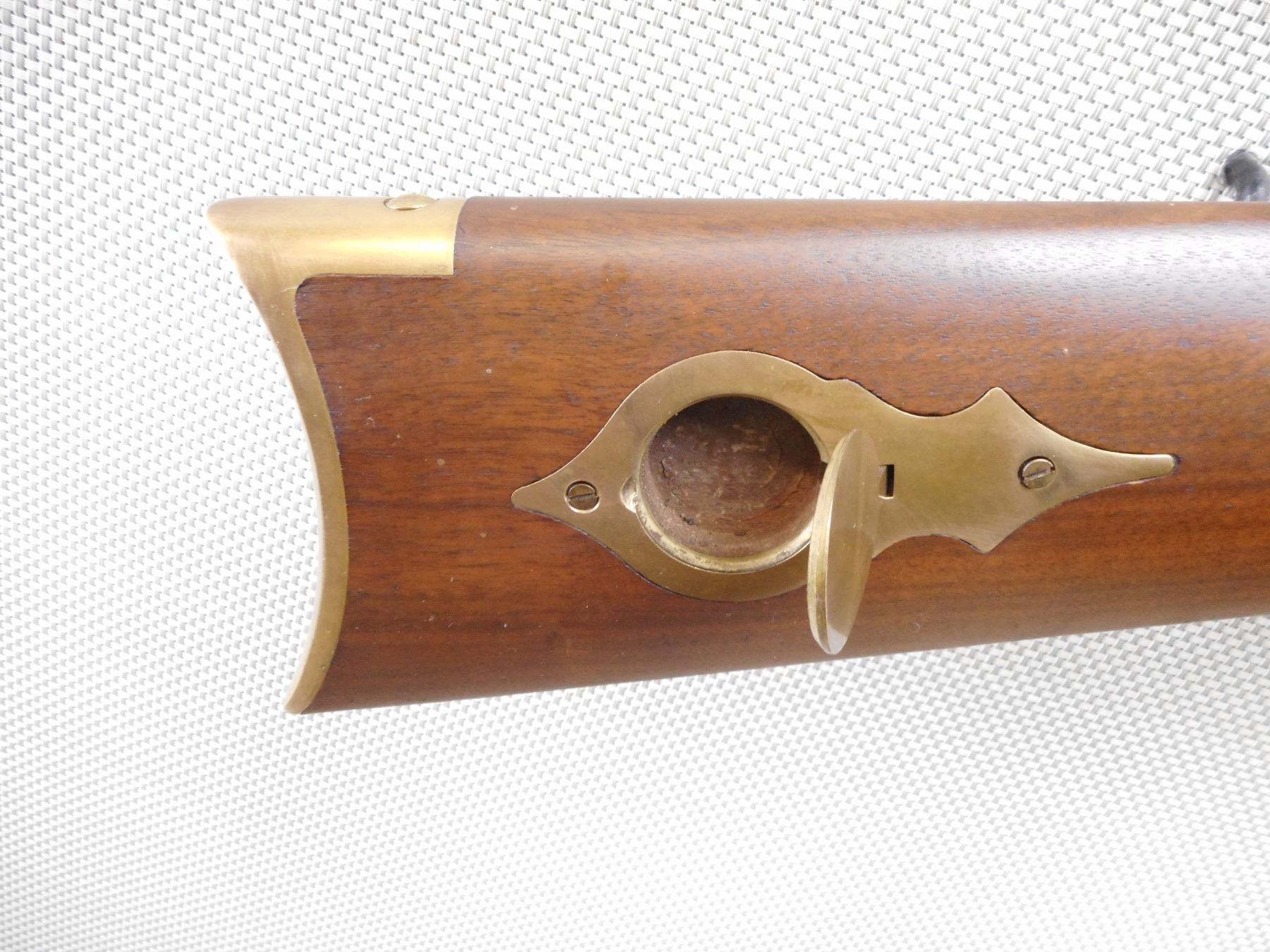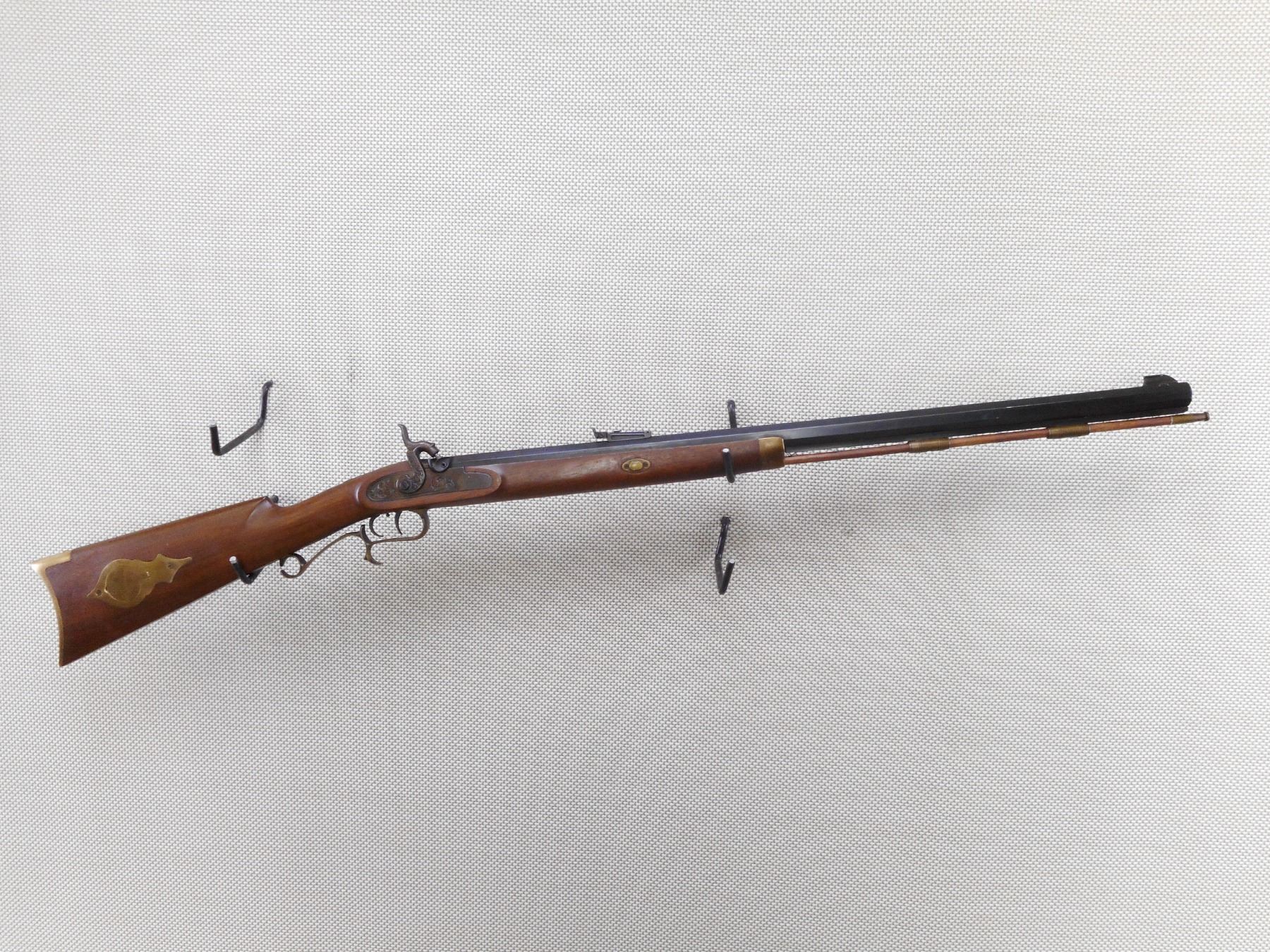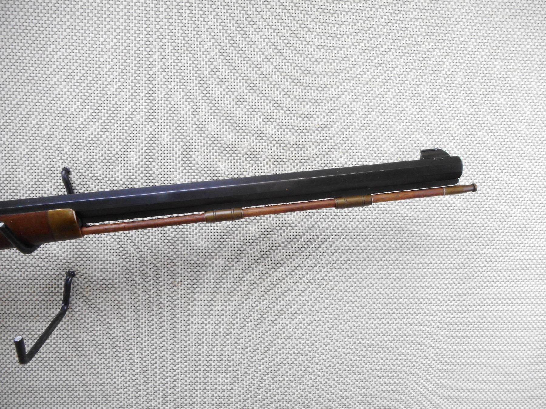 THOMPSON CENTER ARMS , MODEL: HAWKEN STYLE , CALIBER: 50 CAL PERC , BORE IS VERY GOOD. HAS A WOOD RAM ROD WITH BRASS TIP. BLADE FRONT SIGHT AND ADJUSTABLE REAR SIGHT. BRASS FOREND, TRIGGER GUARD, BUTT PLATE AND PATCH BOX. SHOWS VERY LITTLE HANDLING MARKS. ACTION: MUZZLE LOADER , BARREL LENGTH: 27 1/2" , SERIAL # 57753 , CONDITION: 7/10 , CLASS: CANADIAN NON RESTRICTED CLASS
