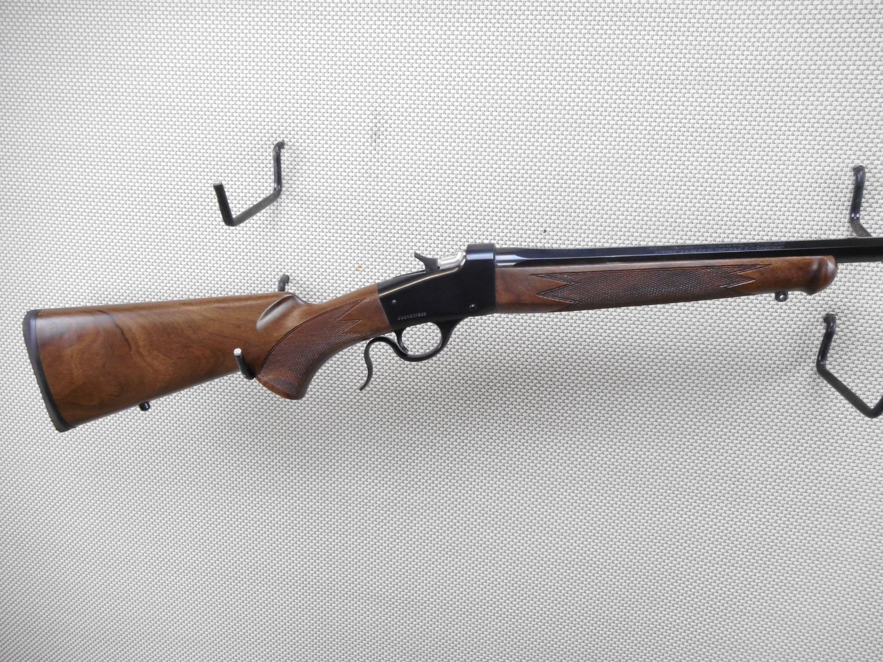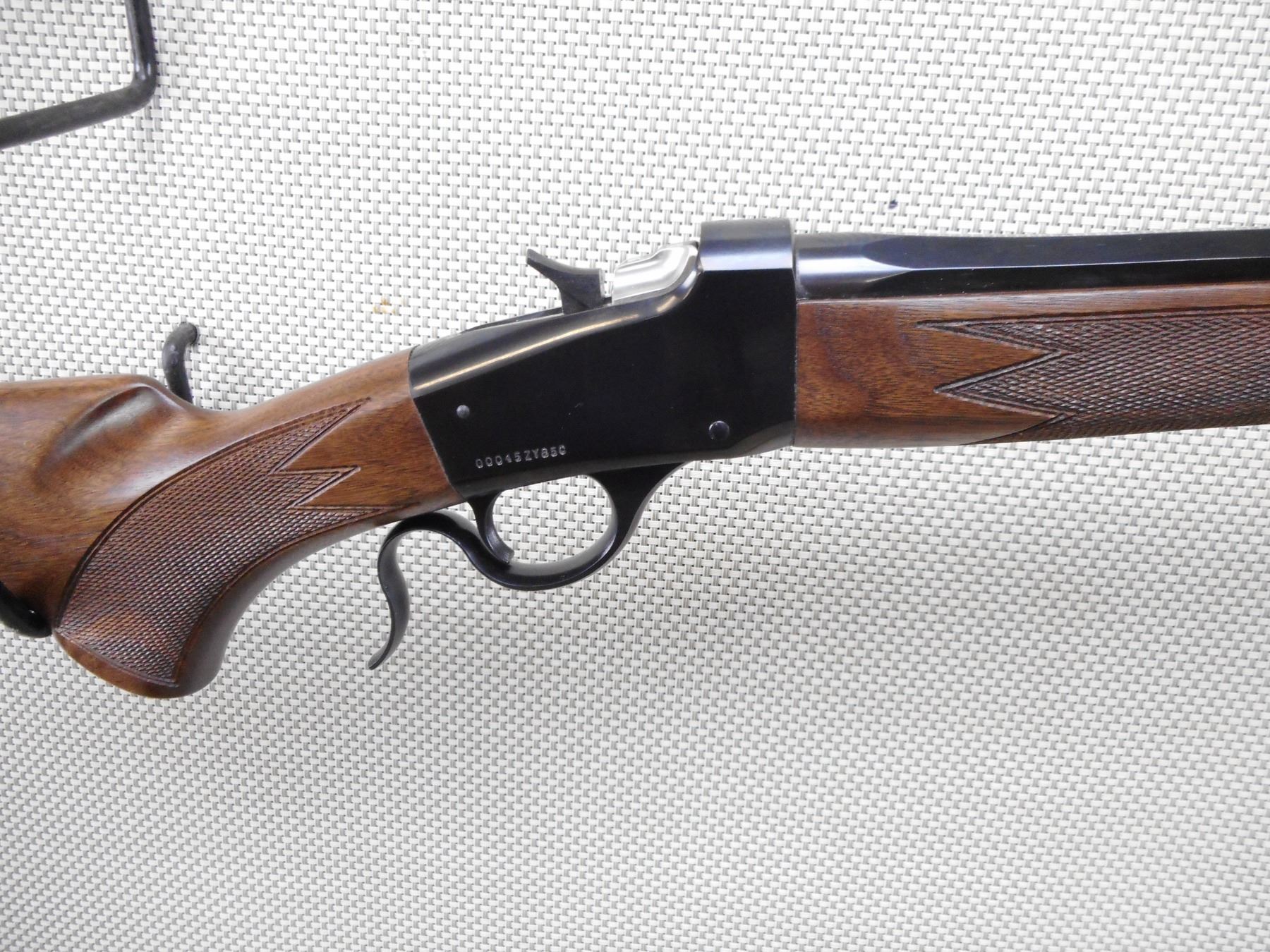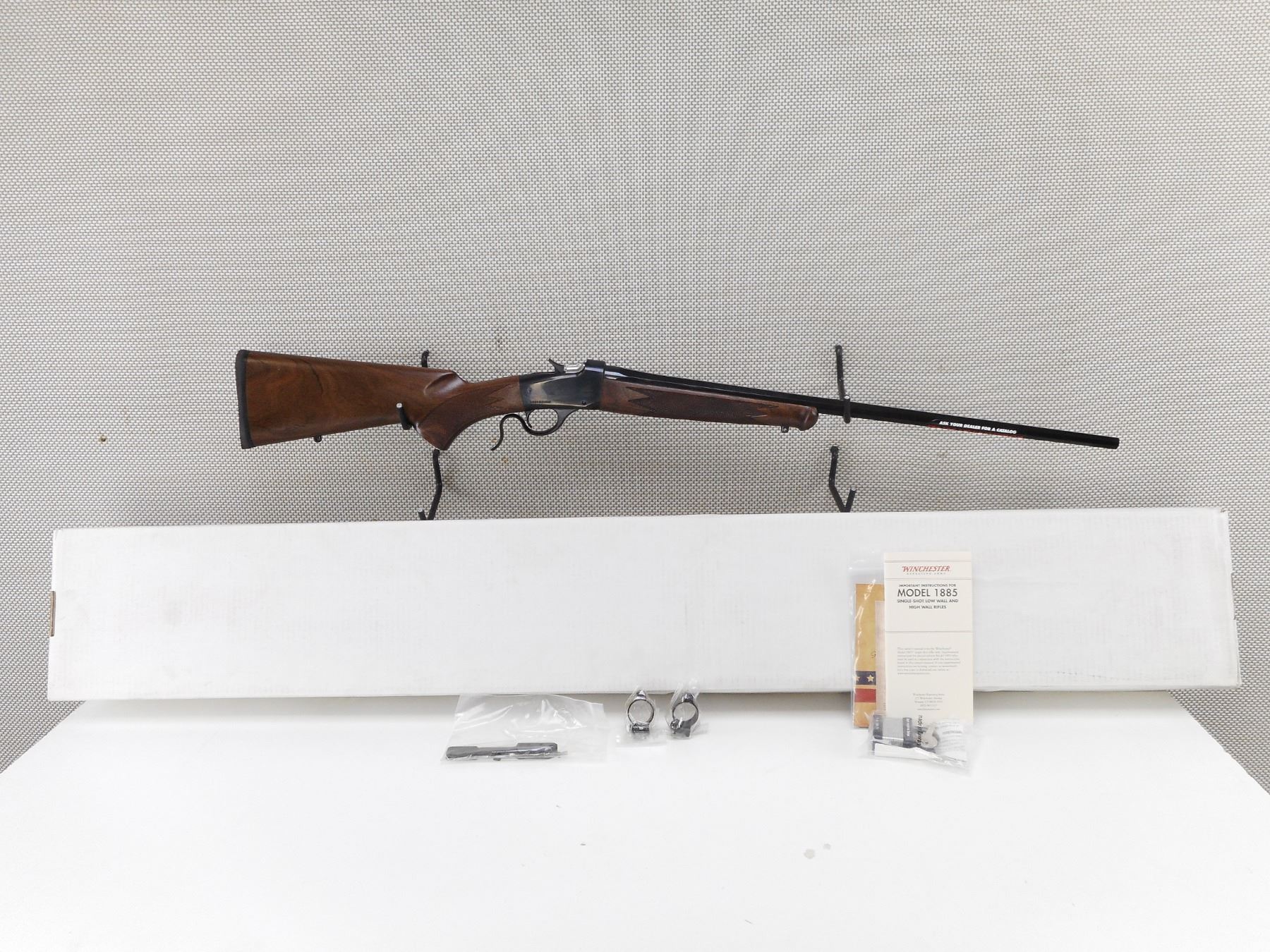 WINCHESTER , MODEL: 1885 LO WALL , CALIBER: 243 WIN , COMES WITH BOX, SCOPE BASE AND RINGS, MANUAL AND LEVER LOCK. BORE IS EXCELLENT. APPEARS AS NEW MAY HAVE BEEN TEST FIRED. CHECKERED TWO PIECE HARDWOOD STOCK WITH RUBBER RECOIL PAD. SLING SWIVEL STUDS. OCTAGONAL BARREL. SHOWS VIRTUALLY NO HANDLING MARKS.ACTION: FALLING BLOCK RIFLE , BARREL LENGTH: 24" , SERIAL # 00045ZY85C , CONDITION: AS NEW IN BOX , CLASS: CANADIAN NON RESTRICTED CLASS