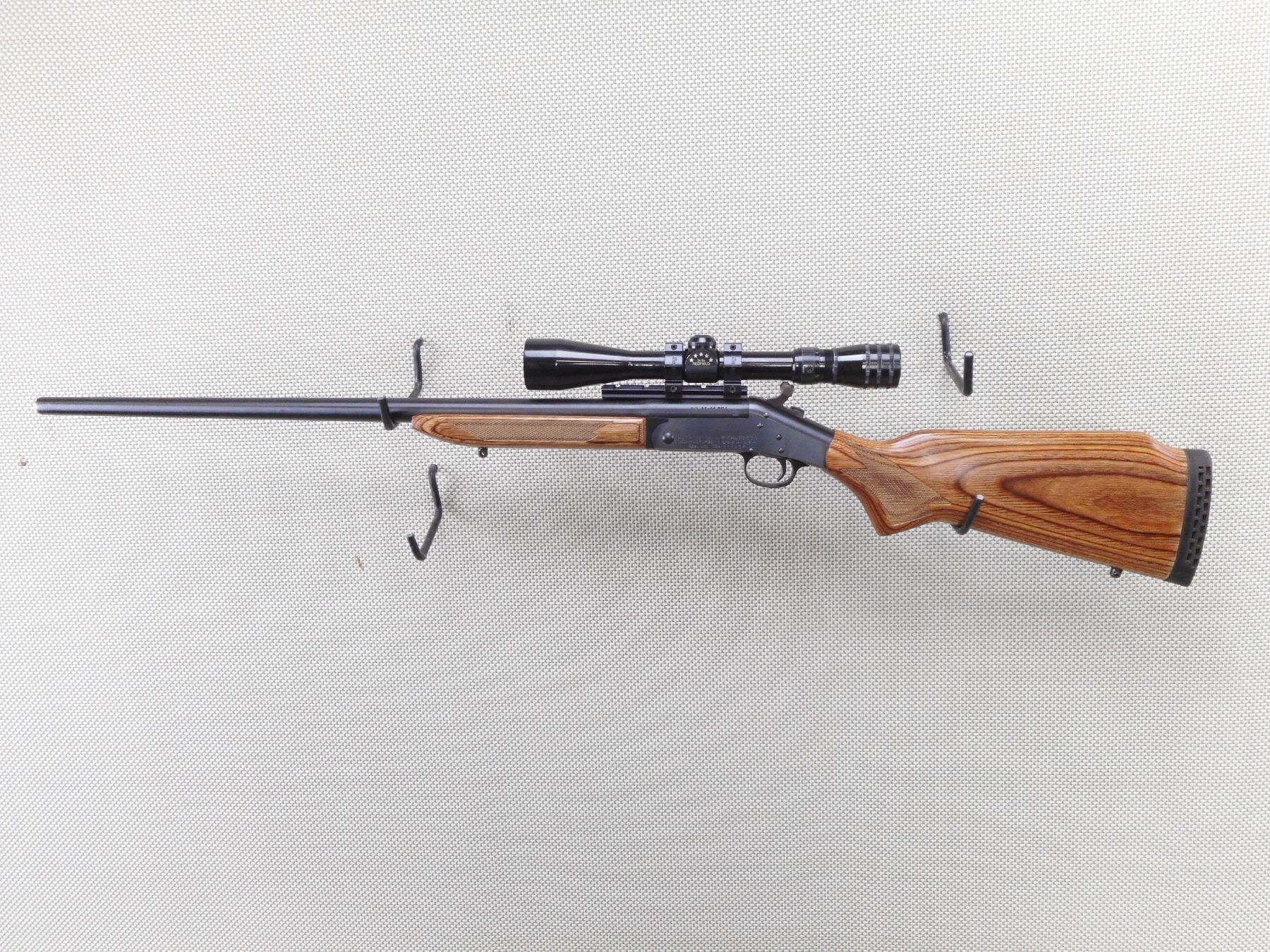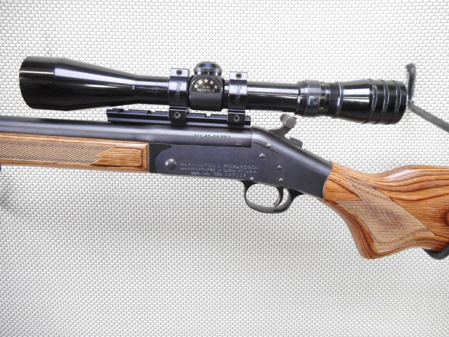 HARRINGTON & RICHARDSON , MODEL: HANDY RIFLE , CALIBER: 25-06 REM , BORE IS EXCELLENT. NO SIGHTS. FEATURES A REDFIELD 3 - 9 SCOPE. CHECKERED LAMINATED HARDWOOD STOCK WITH VENTED RUBBER RECOIL PAD. SLING SWIVEL STUDS. SHOWS VERY LITTLE HANDLING MARKS. ACTION: BREAK ACTION SINGLE SHOT RIFLE , BARREL LENGTH: 26" , SERIAL # 085119 , CONDITION: 9/10 , CLASS: CANADIAN NON RESTRICTED CLASS
