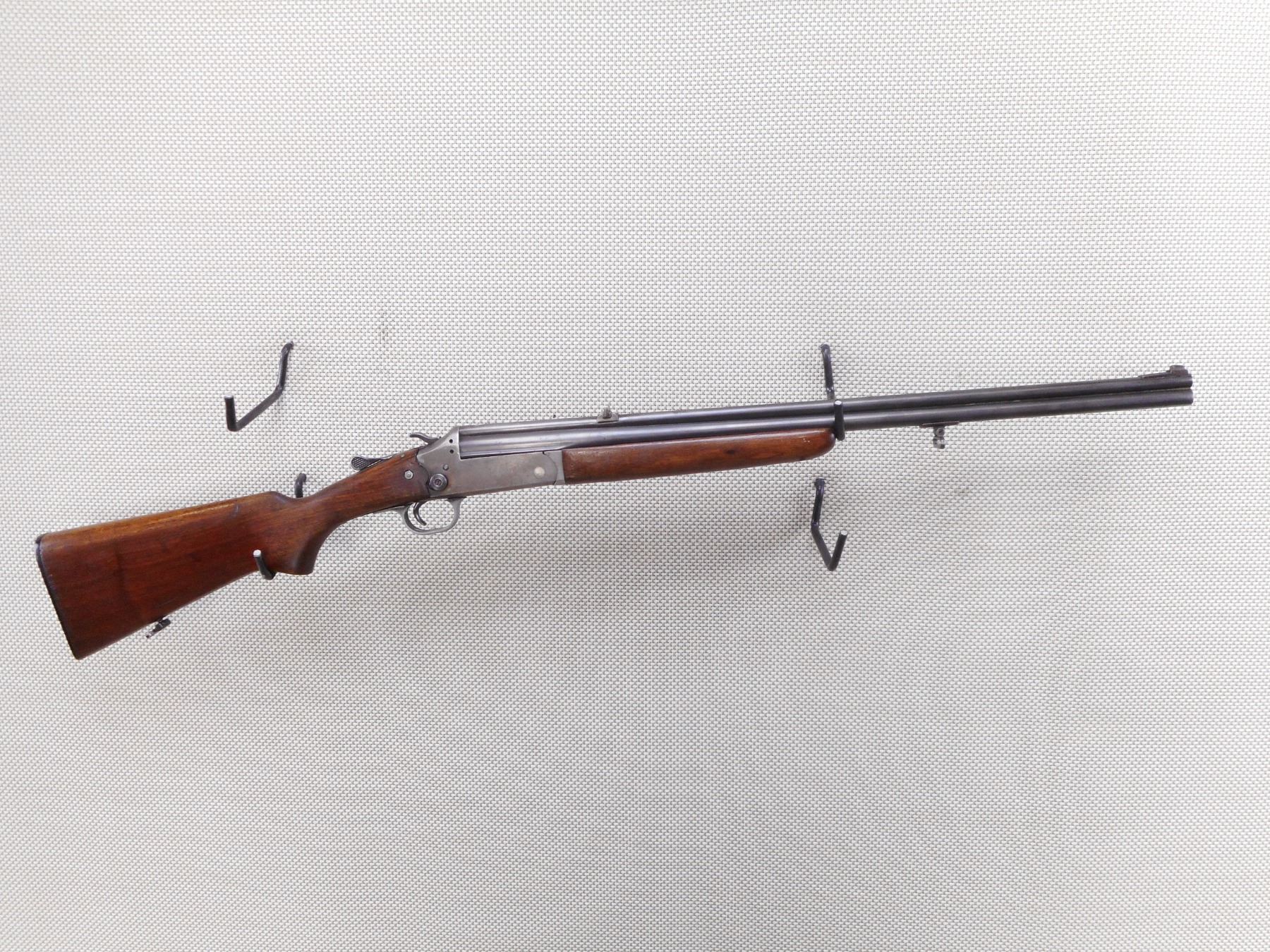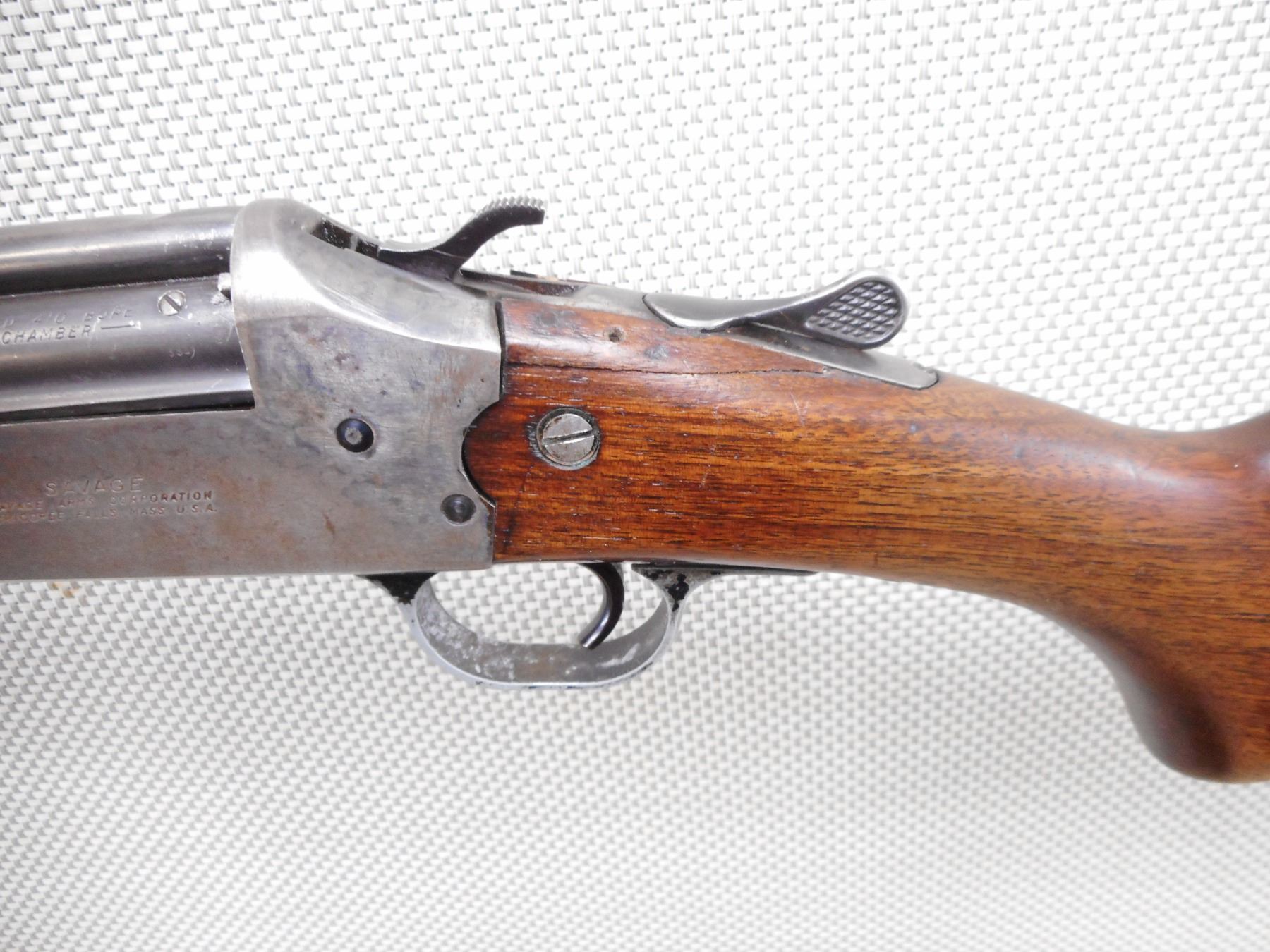 SAVAGE , MODEL: 24 COMBINATION GUN , CALIBER: 22 LR / 410GA X 3" , BORES ARE DARK. FIXED FULL CHOKE. BLADE FRONT AND FIXED REAR SIGHTS. TWO PIECE HARDWOOD STOCK THAT IS CRACKED, CHIPPED AND REPAIRED AT THE WRIST. SLING SWIVEL LOOPS. PLASTIC BUTT PLATE. SHOWS SOME HANDLING MARKS. RECEIVER IS DRILLED FOR A TANG SIGHT. SHOWS SOME HANDLING MARKS. ACTION: COMBINATION GUN OVER UNDER , BARREL LENGTH: 24" , SERIAL # 116 , CONDITION: 5/10 , CLASS: CANADIAN NON RESTRICTED CLASS