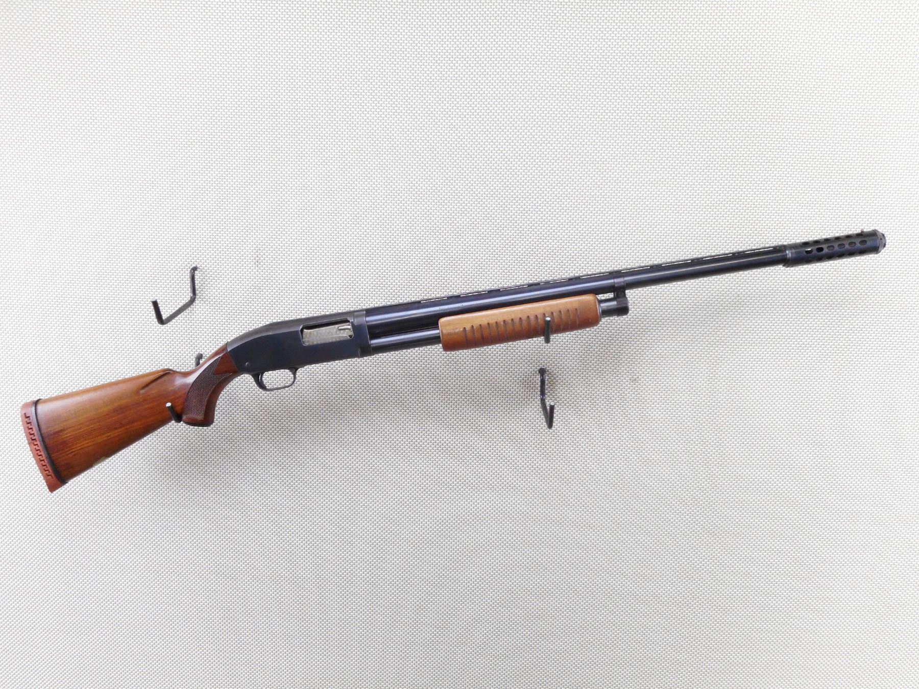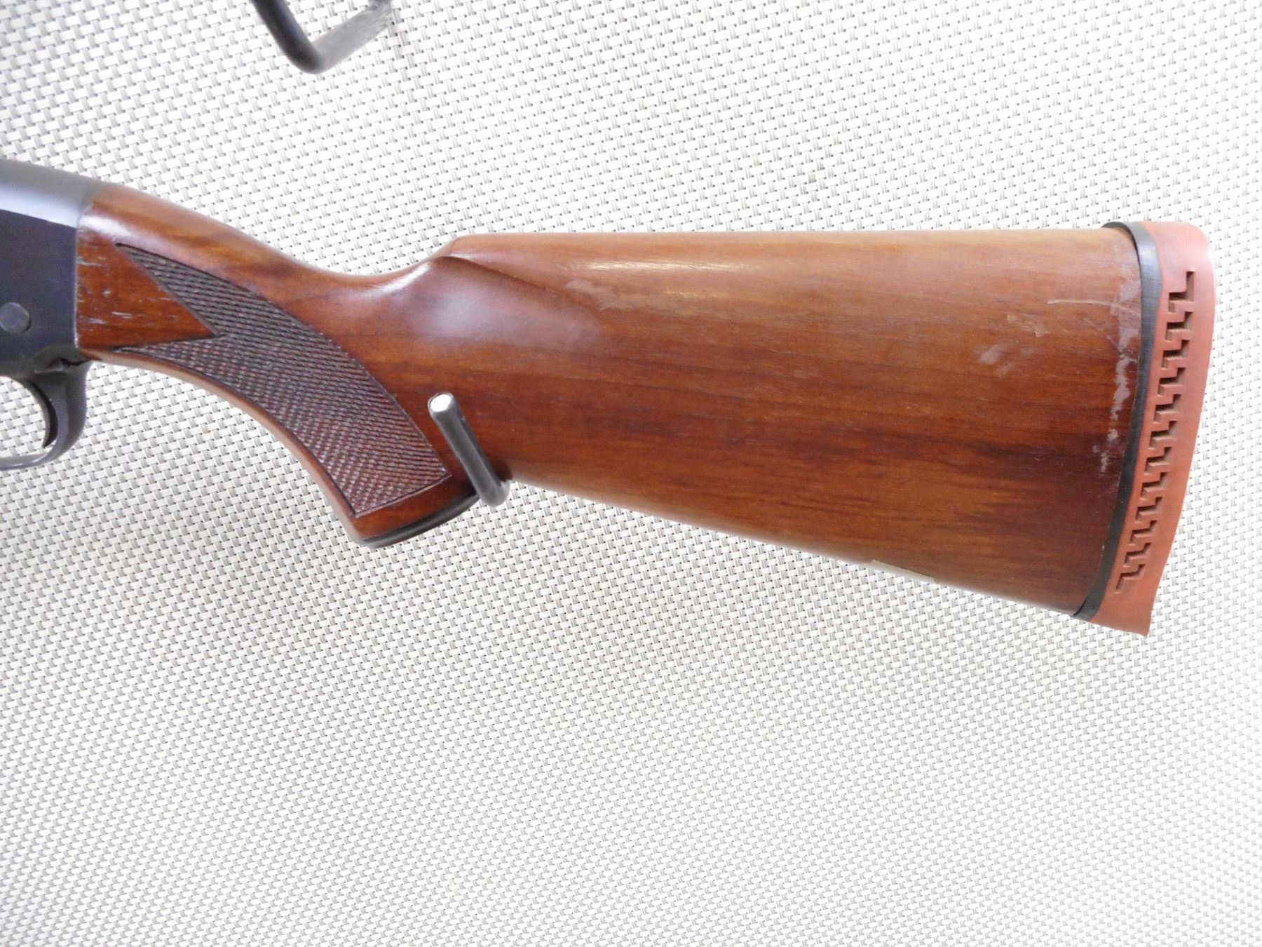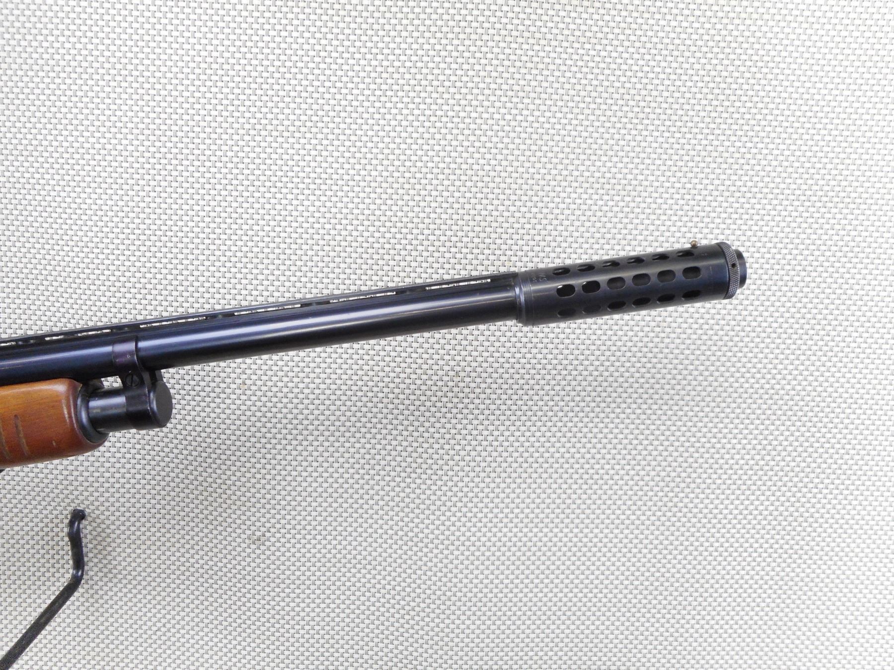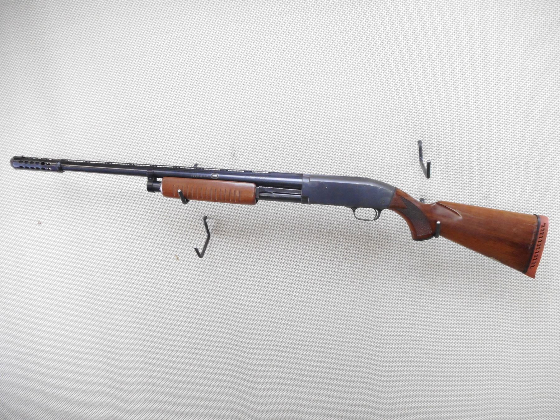 J.C. HIGGINS , MODEL: 20 , CALIBER: 12GA X 2 3/4" , BORE IS VERY GOOD. FIXED IMPROVED CYLINDER CHOKE. MUZZLE BREAK. BEAD FRONT SIGHT ON A VENTED RIB BARREL. TWO PIECE HARDWOOD STOCK WITH SHORTNED BUTT AND OVERSIZED RECOIL PAD. SHOWS SOME HANDLING MARKS. THE SERIAL # HAS BEEN APPLIED AFTER MARKET USING THE FIN STICKER #.ACTION: PUMP ACTION SHOTGUN , BARREL LENGTH: 22 1/2" , SERIAL # 1110802 , CONDITION: 6/10 , CLASS: CANADIAN NON RESTRICTED CLASS