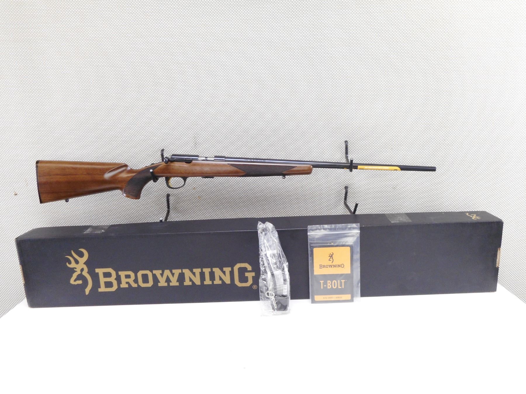 BROWNING , MODEL: T-BOLT , CALIBER: 22 LR , COMES WITH BOX,MAGAZINE, CABLE LOCK, AND MANUAL. BORE IS EXCELLENT, APPEARS AS NEW, MAY HAVE BEEN TEST FIRED. CHECKERED ONE PIECE HARDWOOD STOCK WITH PLASTIC BUTT PLATE. SLING SWIVEL STUDS. GOLD TRIGGER. SHOWS VIRTUALLY NO HANDLING MARKS.ACTION: BOLT ACTION RIFLE , BARREL LENGTH: 22" , SERIAL # 01961MR253 , CONDITION: AS NEW IN BOX , CLASS: CANADIAN NON RESTRICTED CLASS