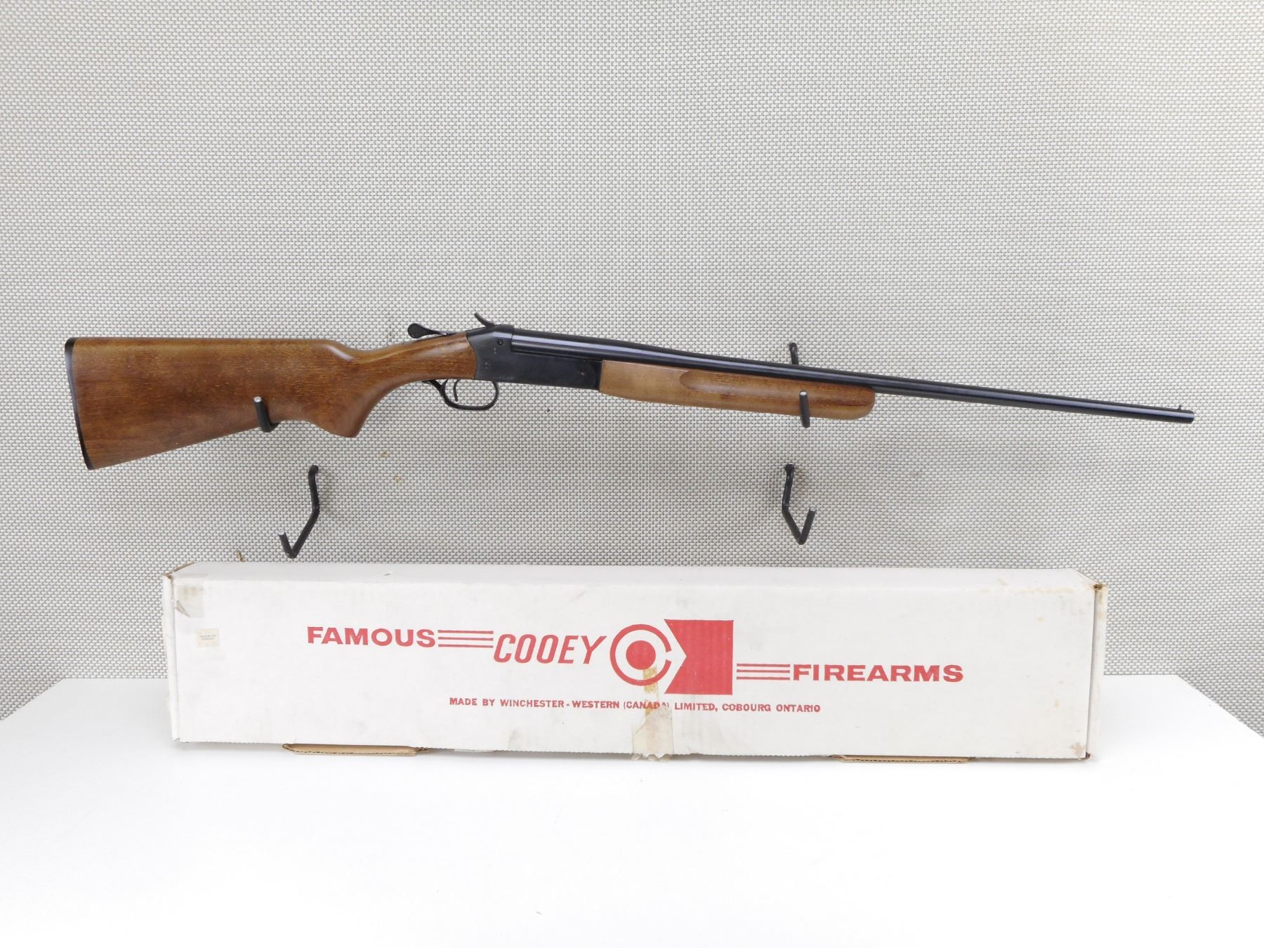 COOEY , MODEL: 840 , CALIBER: 410GA X 3" , COMES WITH BOX. FIXED FULL CHOKE. BORE IS EXCELLENT. APPEARS TO HAVE BEEN TEST FIRED. BEAD FRONT SIGHT. TWO PIECE HARDWOOD STOCK WITH PLASTIC BUTT PLATE. SHOWS SOME MINOR HANDLING MARKSACTION: SINGLE SHOT BREAK ACTION SHOT GUN , BARREL LENGTH: 26" , SERIAL # 1049048 , CONDITION: 8/10 , CLASS: CANADIAN NON RESTRICTED CLASS