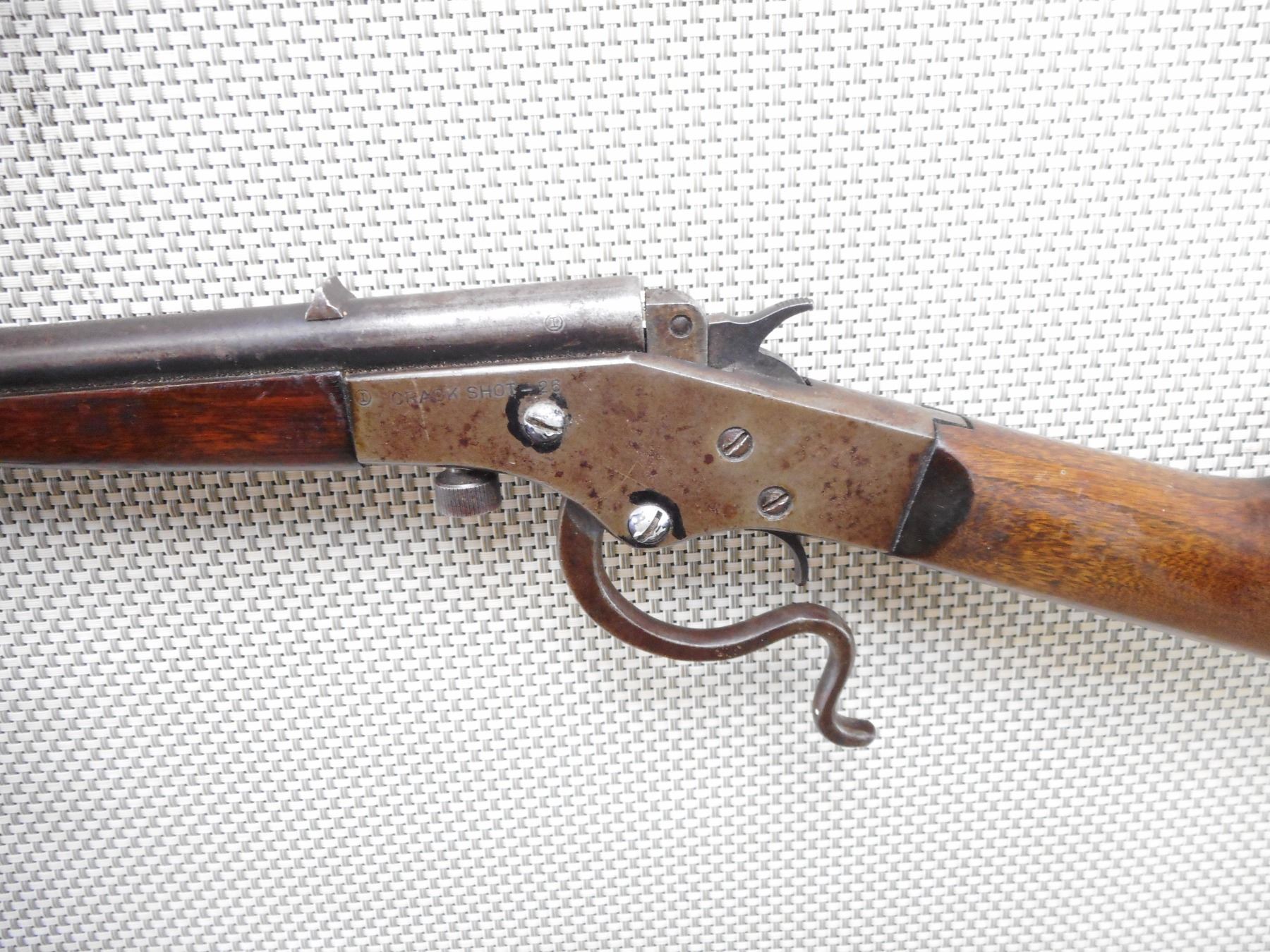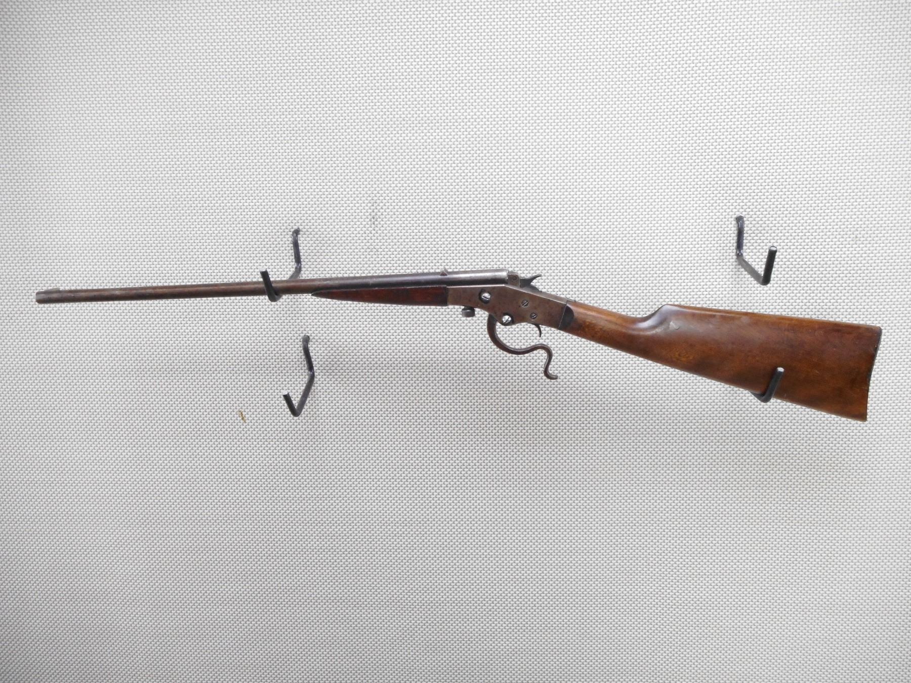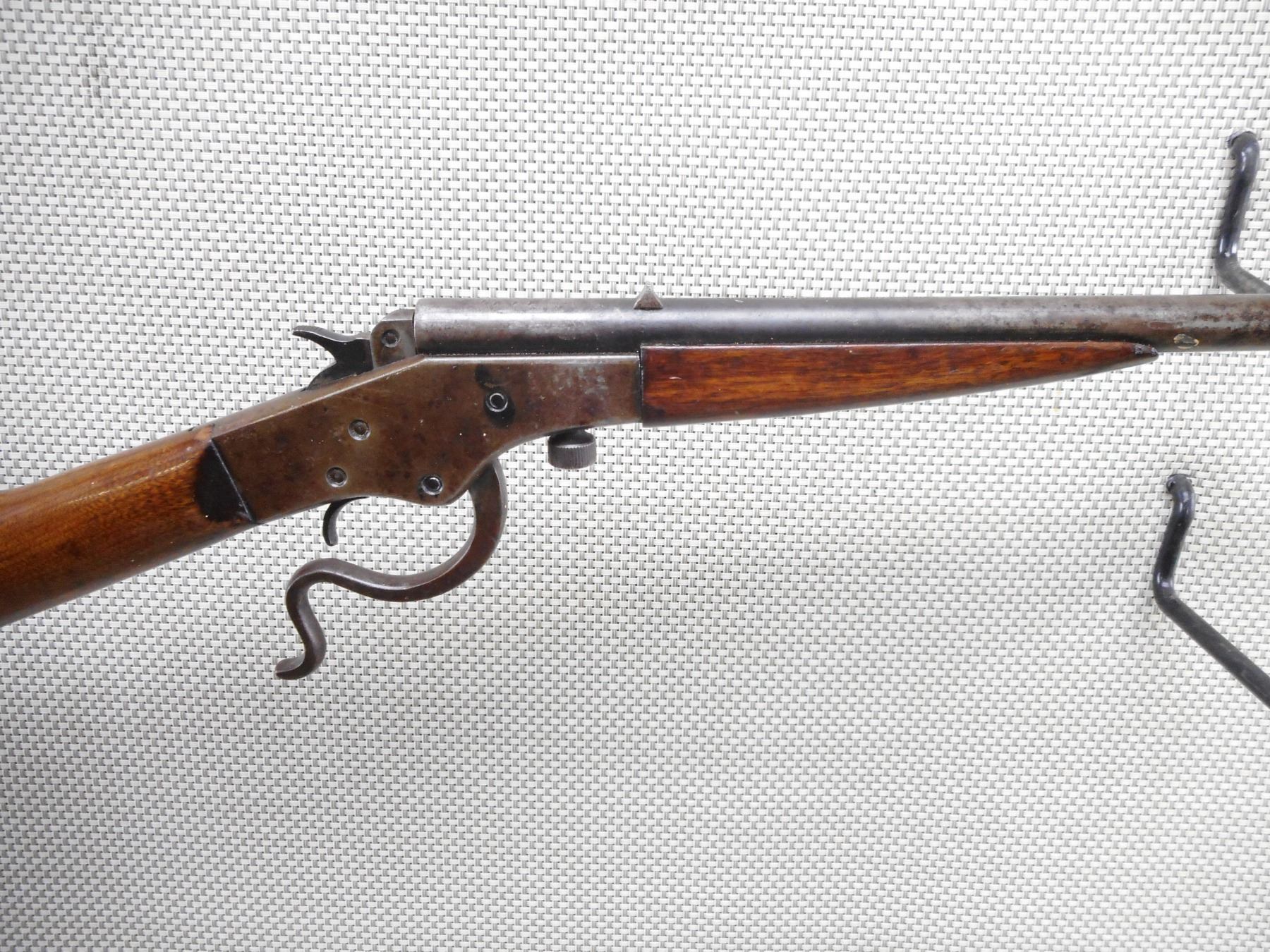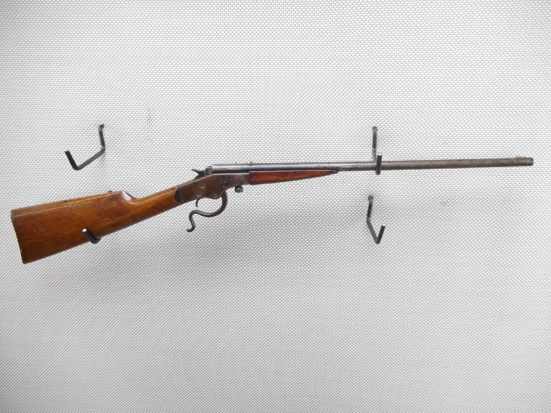 STEVENS , MODEL: CRACKSHOT 26 , CALIBER: 32 RIM FIRE , BORE IS DARK. BLADE FRONT AND FIXED REAR SIGHTS. REPLACED RECEIVER AND LEVER SCREWS. TWO PIECE HARDWOOD STOCK WITH A STEEL BUTT PLATE. BROKEN HAMMER SPRING. SHOWS SOME HANDLING MARKS. ACTION: FALLING BLOCK , BARREL LENGTH: 20" , SERIAL # N/A , CONDITION: 4/10 , CLASS: CANADIAN NON RESTRICTED CLASS