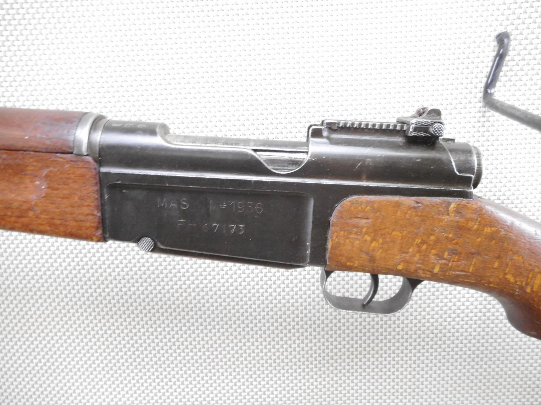 MAS , MODEL: 1936 , CALIBER: 7.5 FRENCH , BORE IS VERY GOOD WITH SLIGHT WEAR. BLADE FRONT SIGHT WITH HOOD. STACKING HOOK. BAYONET. MISSING SLING SWIVEL. FULL MILITARY STOCKS. STEEL BUTT PLATE. MISMATCHED SERIAL #'S SHOWS HANDLING MARKS AND WEAR. ACTION: BOLT ACTION RIFLE , BARREL LENGTH: 22" , SERIAL # FH67173 , CONDITION: 6/10 , CLASS: CANADIAN NON RESTRICTED CLASS