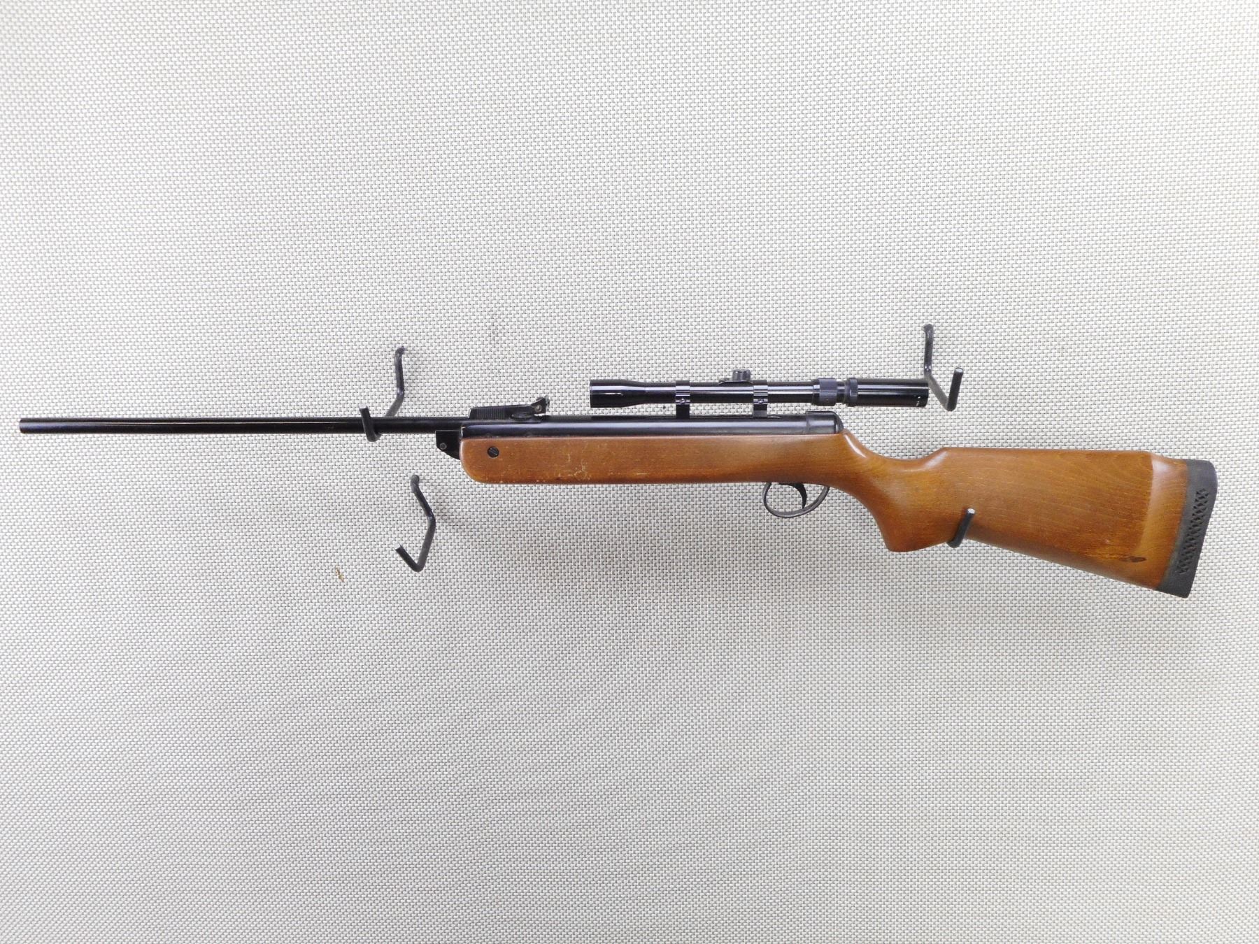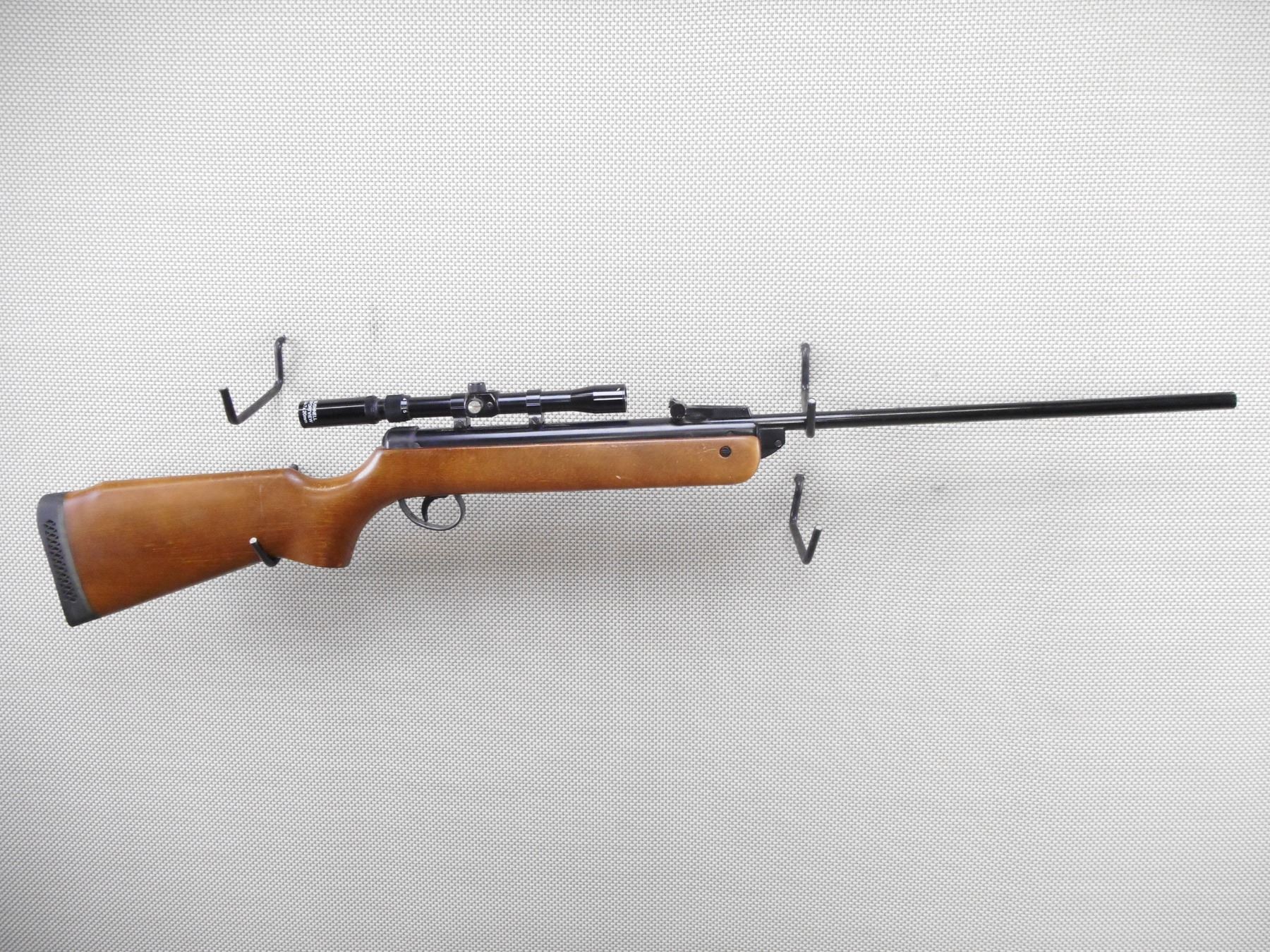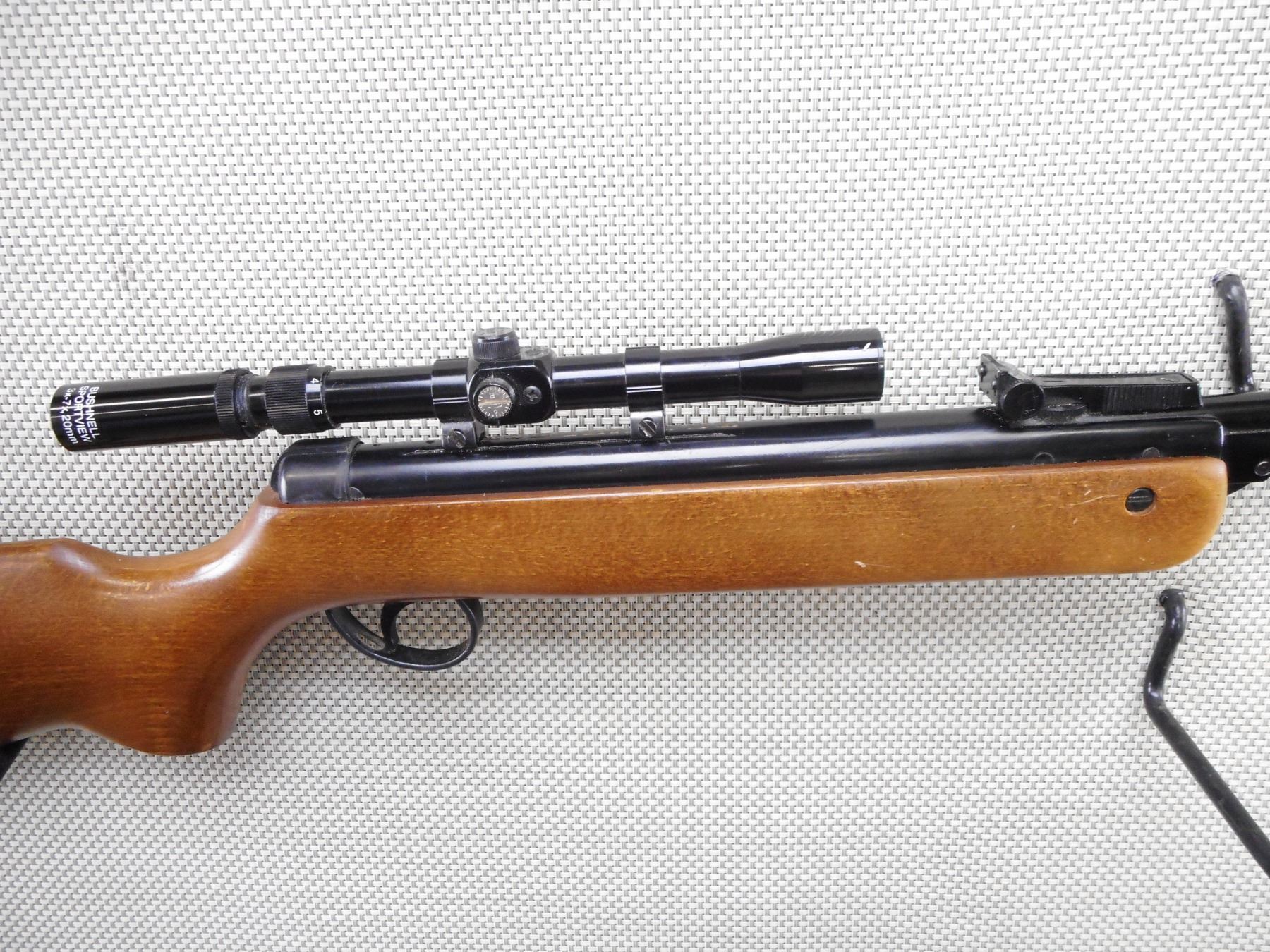 BSA , MODEL: METEOR , CALIBER: 177 PELLET , BORE IS VERY GOOD. NO FRONT SIGHT. ADJUSTABLE REAR SIGHT. BUSHNELL 3X SCOPE WITH DAMAGED CROSSHAIRS. ONE PIECE HARDWOOD STOCK WITH VENTED RUBBER RECOIL PAD. SHOWS SOME HANDLING MARKS. ACTION: AIR RIFLE , BARREL LENGTH: 18 1/2" , SERIAL # N/A , CONDITION: 5/10 , CLASS: CANADIAN NON RESTRICTED CLASS