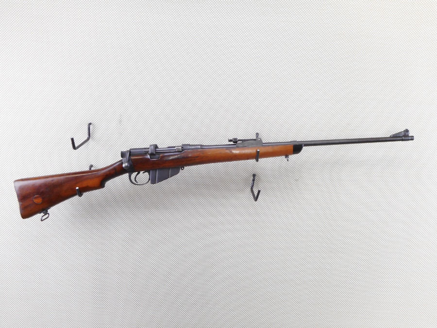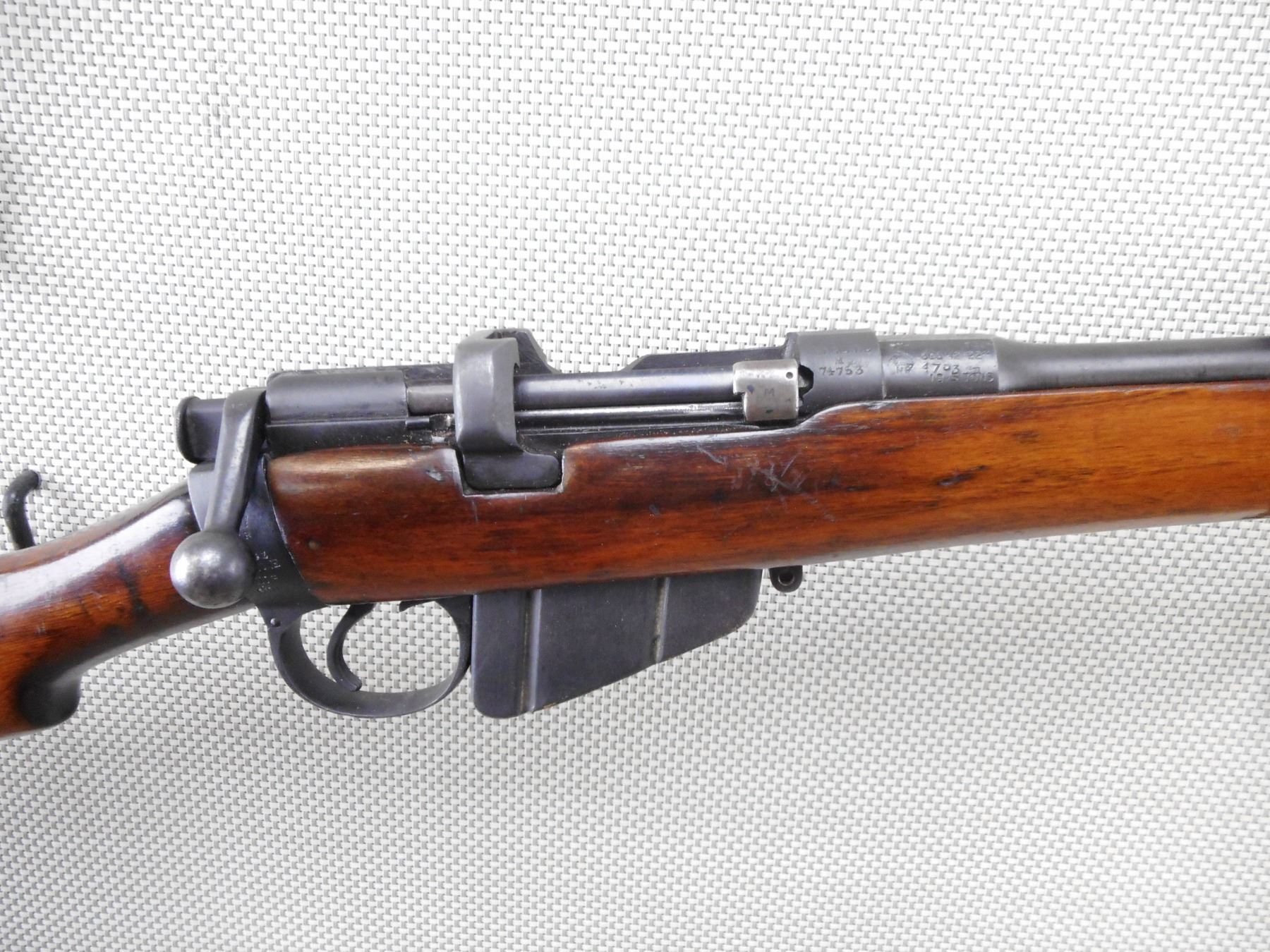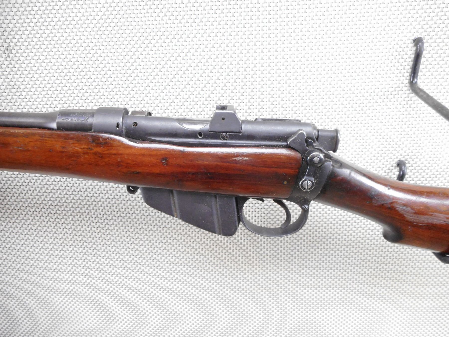 LEE ENFIELD , MODEL: NO1 MKIII* SPORTER , CALIBER: 303 BR , COMES WITH MAGAZINE. DATED 1942. BOLT AND RECEIVER ARE MATCHING BY SERIAL #. BORE IS VERY GOOD. RAMP FRONT AND ADJUSTABLE REAR SIGHT. SLING SWIVEL LOOPS. BRASS BUTT PLATE. SHOWS SOME HANDLING MARKS. ACTION: BOLT ACTION RIFLE , BARREL LENGTH: 25" , SERIAL # M74753 , CONDITION: 6/10 , CLASS: CANADIAN NON RESTRICTED CLASS