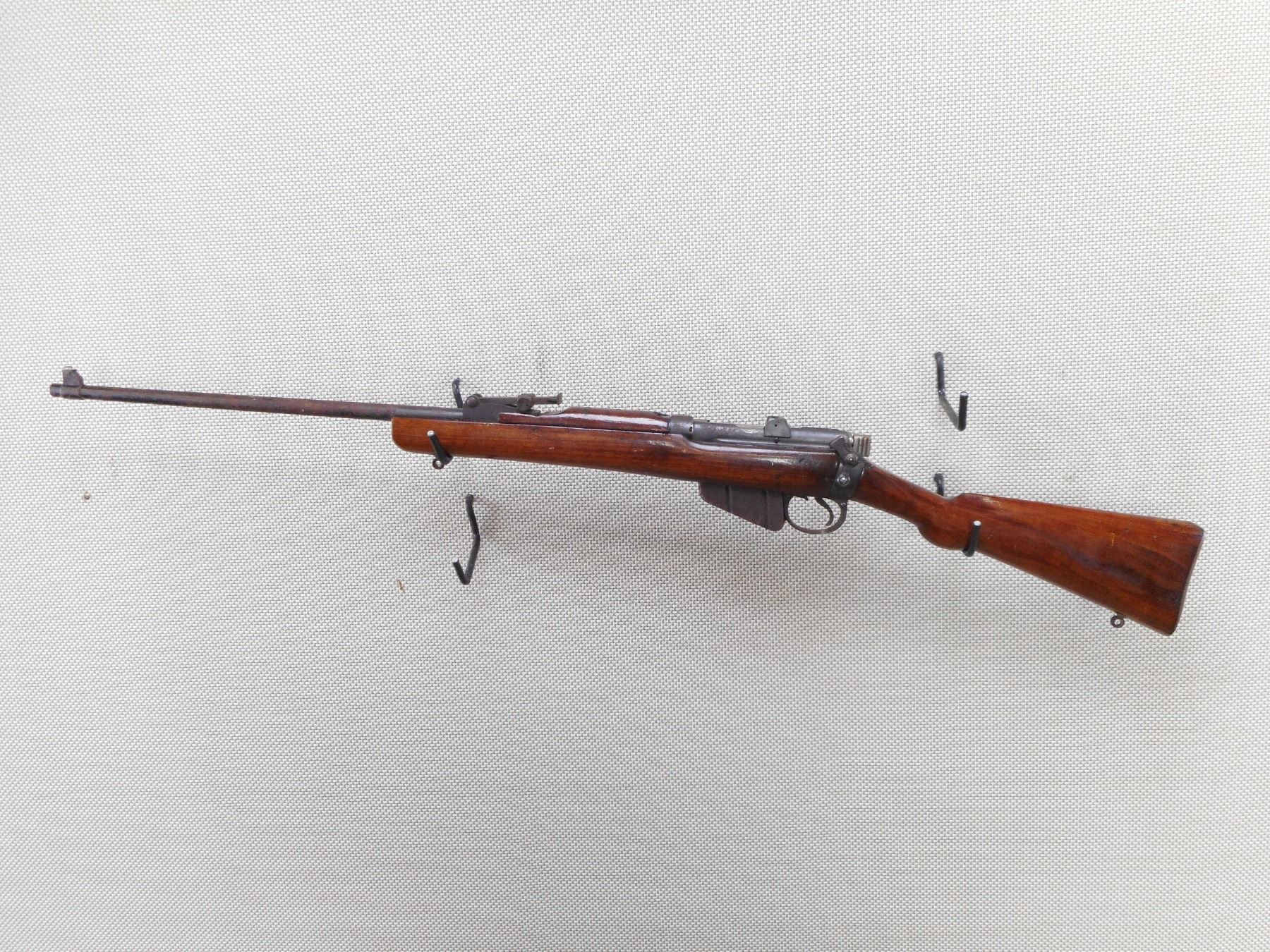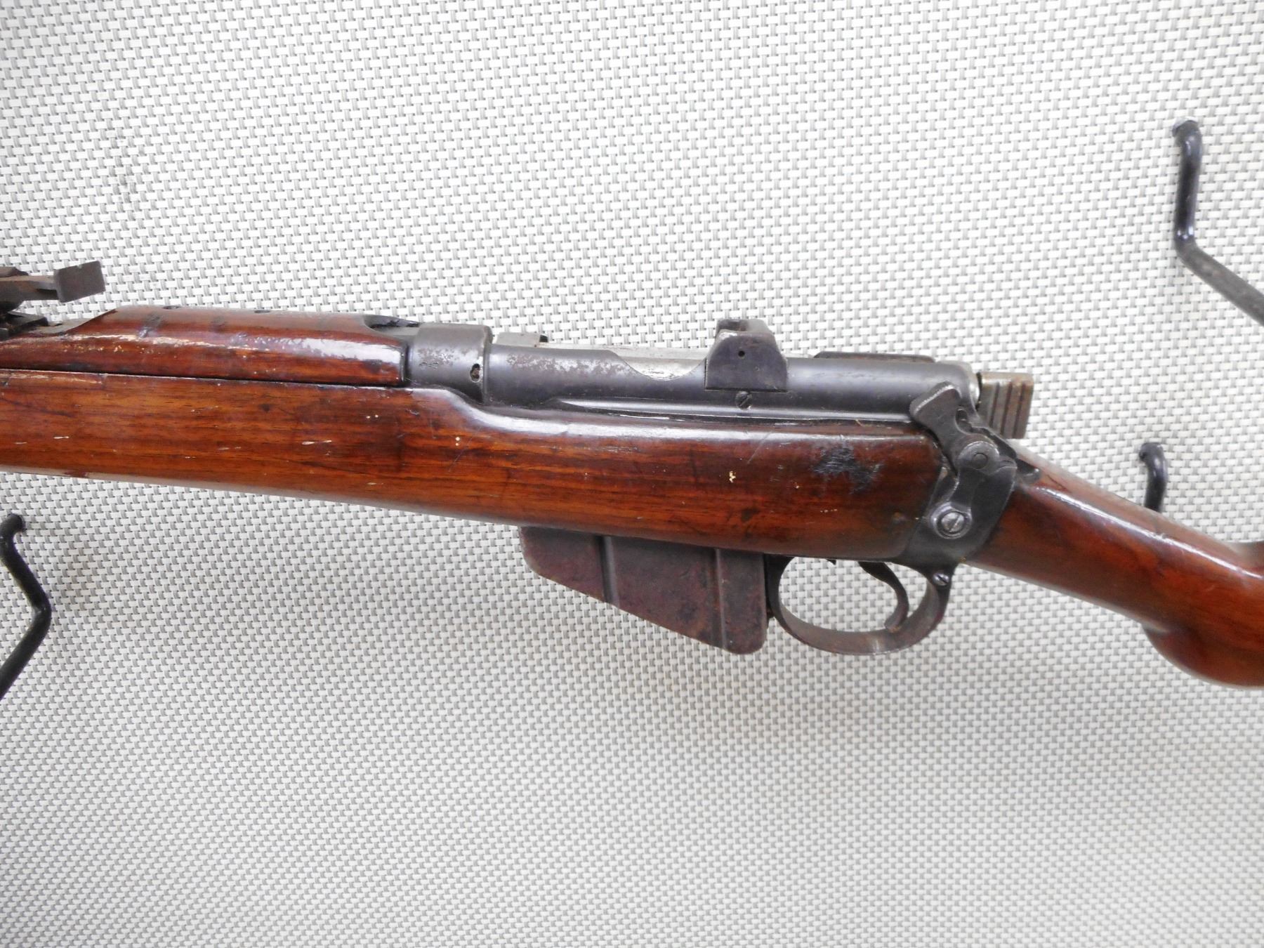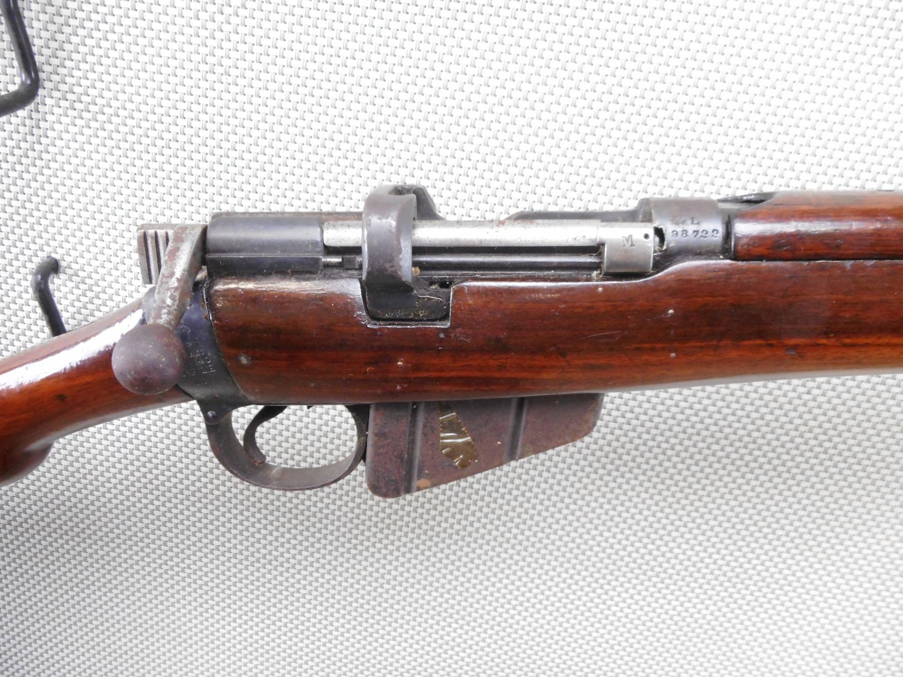 LEE ENFIELD , MODEL: NOI MKIII SPORTER , CALIBER: 303 BR , COMES WITH MAGAZINE. DATED 1940. BOLT AND RECEIVER DON'T MATCH BY SERIAL #. NUMEROUS MILITARY MARKINGS. MADE BY BSA. BORE IS GOOD. BLADE FRONT AND ADJUSTABLE REAR SIGHT. 3 PIECE HARDWOOD STOCK WITH BRASS BUTT PLATE. SHOWS SOME HANDLING MARKS. ACTION: BOLT ACTION RIFLE , BARREL LENGTH: 25" , SERIAL # L98722 , CONDITION: 5/10 , CLASS: CANADIAN NON RESTRICTED CLASS