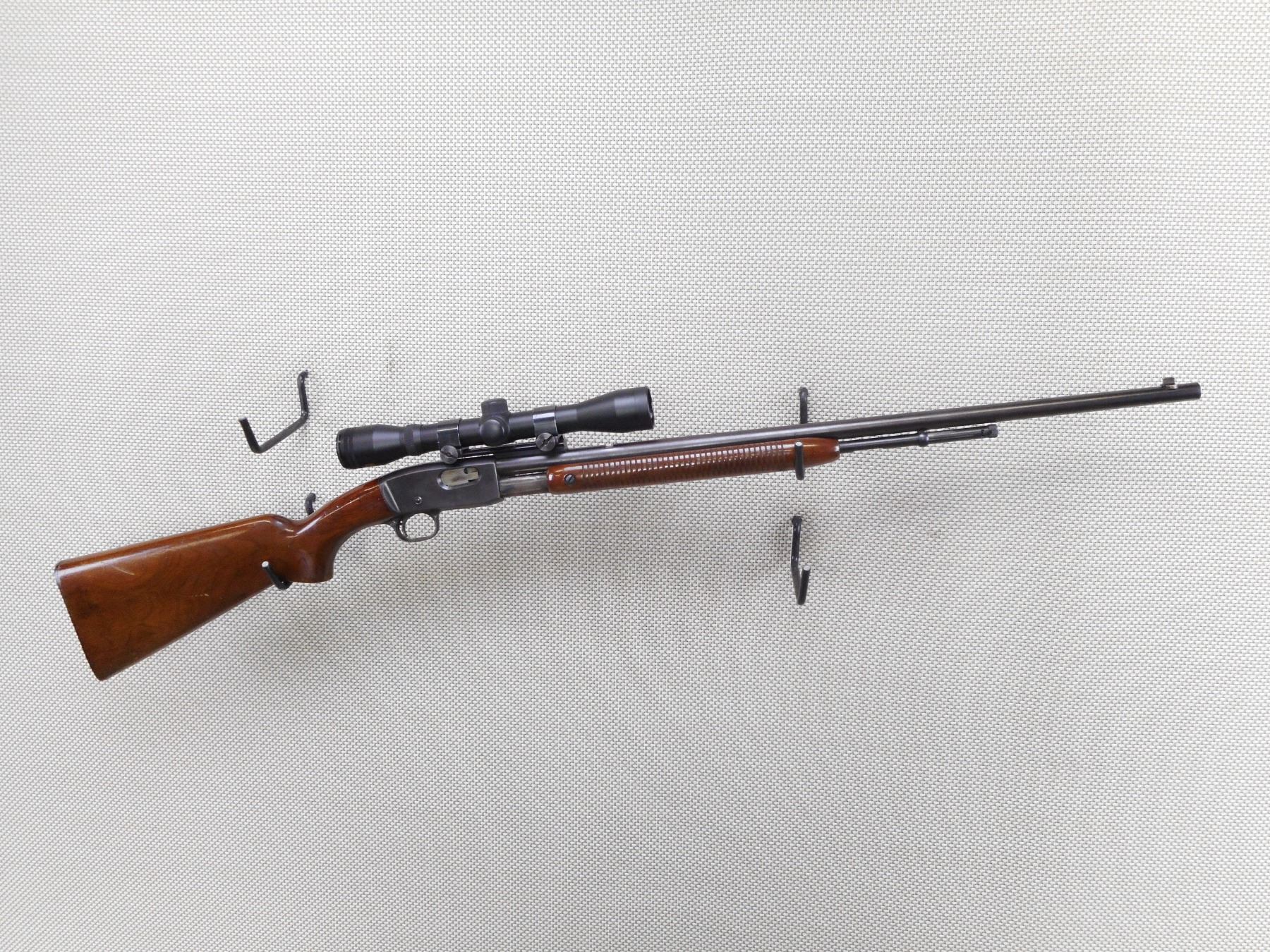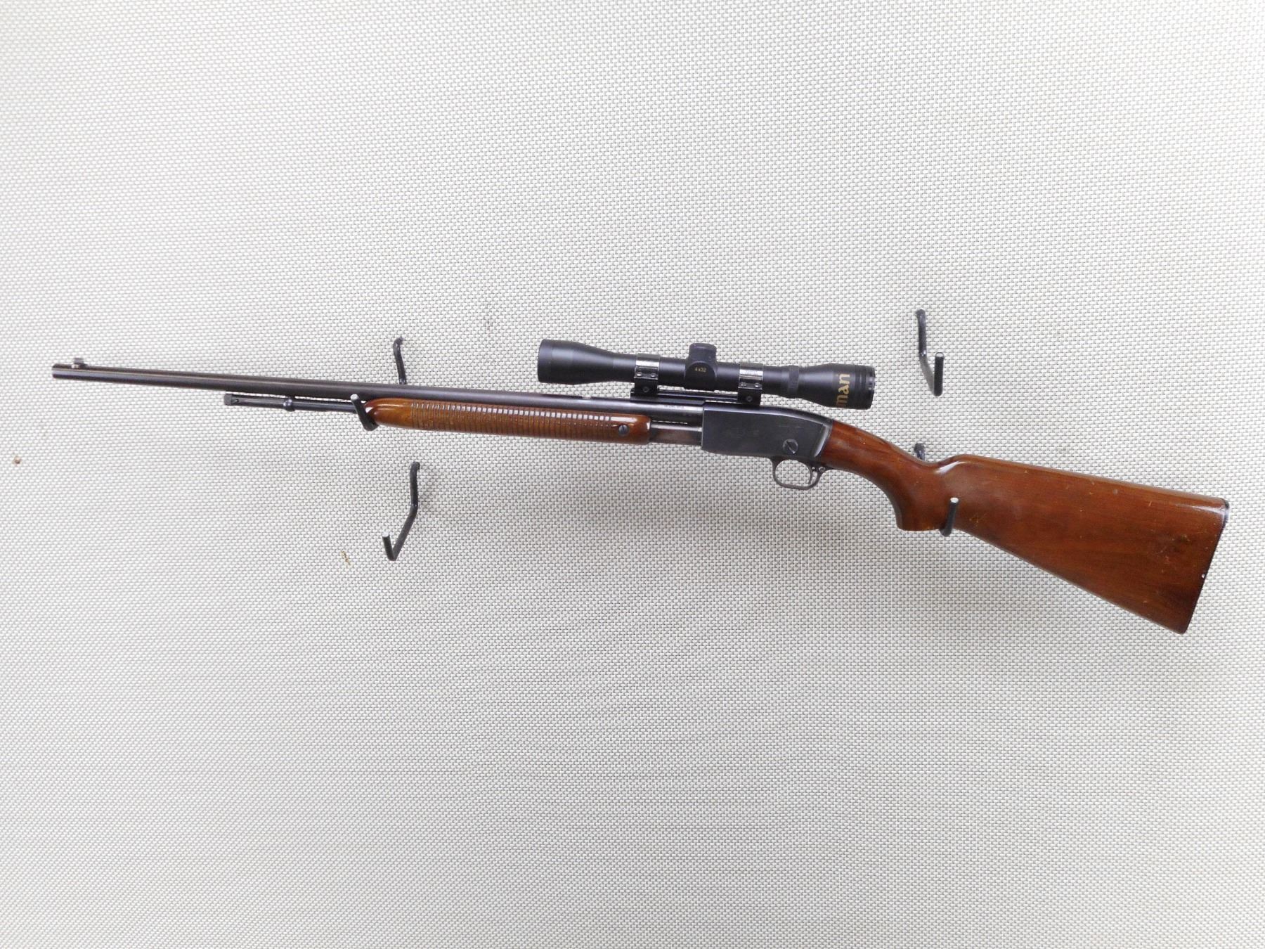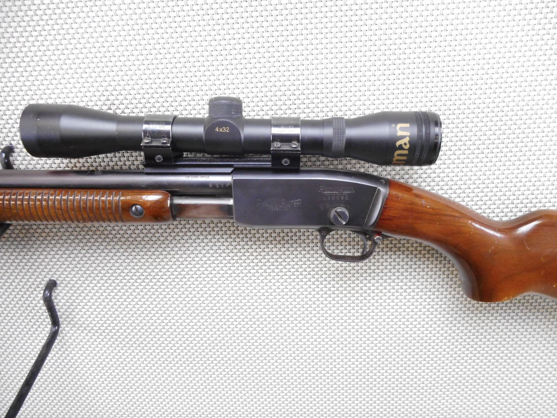 REMINGTON , MODEL: 121 FIELDMASTER , CALIBER: 22 LR , BORE IS EXCELLENT. BLADE FRONT, MISSING REAR SIGHT. FEATURES A BEEMAN 4X SCOPE. 2 PIECE HARDWOOD STOCK WITH STEEL BUTT PLATE. SHOWS SOME HANDLING MARKS. ACTION: PUMP ACTION RIFLE , BARREL LENGTH: 24 1/2" , SERIAL # 158682 , CONDITION: 6/10 , CLASS: CANADIAN NON RESTRICTED CLASS
