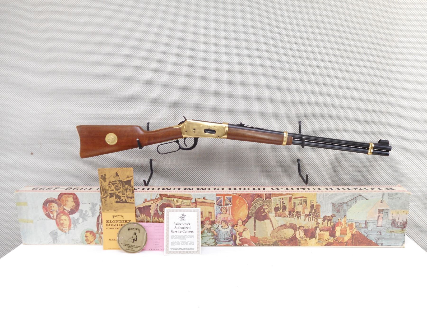 WINCHESTER , MODEL: 94 KLONDIKE GOLD RUSH COMMEMORATIVE , CALIBER: 30-30 WIN , COMES WITH BOX (DAMAGED), MANUAL, BORE IS EXCELLENT, APPEARS AS NEW, MAY HAVE BEEN TEST FIRED. SADDLE RING. HOODED FRONT SIGHT AND ADJUSTABLE REAR SIGHT. TWO PIECE HARDWOOD STOCK. GOLD BARREL BANDS, RECEIVER AND BUTT PLATE. MARKED BONANZA, ELDORADO,HUNKER CREEK. 1898 DATED BRASS DISK IN THE BUTT STOCK. SHOWS VIRTUALLY NO HANDLING MARKS.ACTION: LEVER ACTION RIFLE , BARREL LENGTH: 20" , SERIAL # KGR7972 , CONDITION: AS NEW IN BOX , CLASS: CANADIAN NON RESTRICTED CLASS
