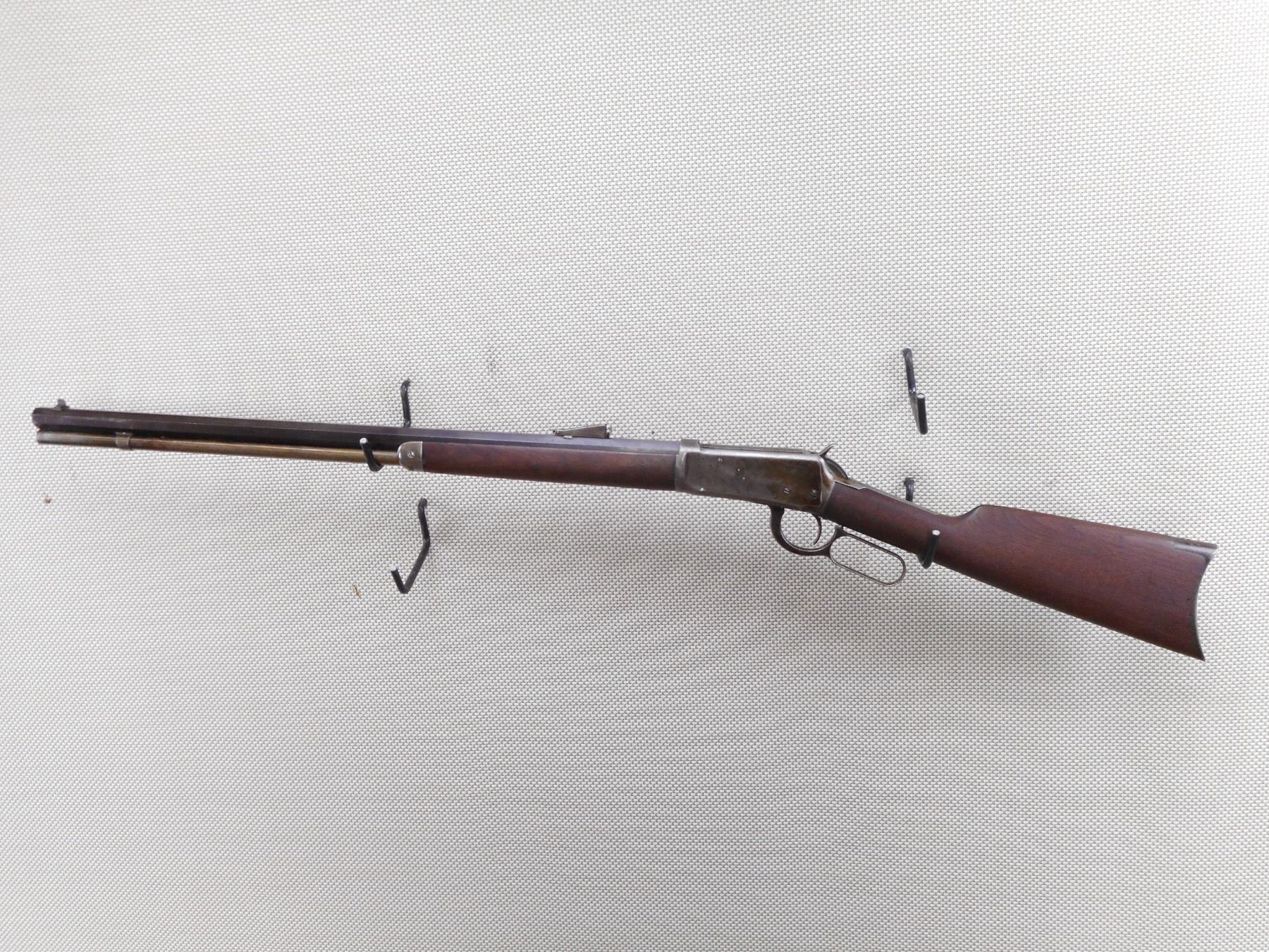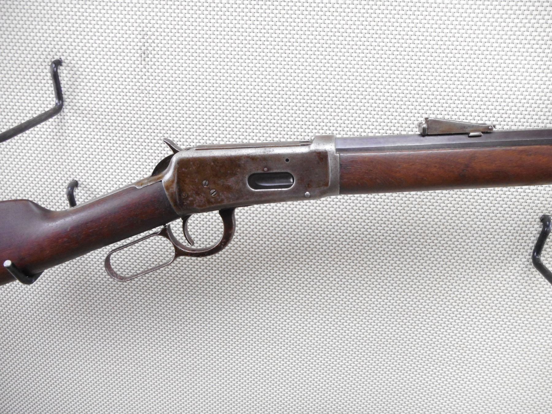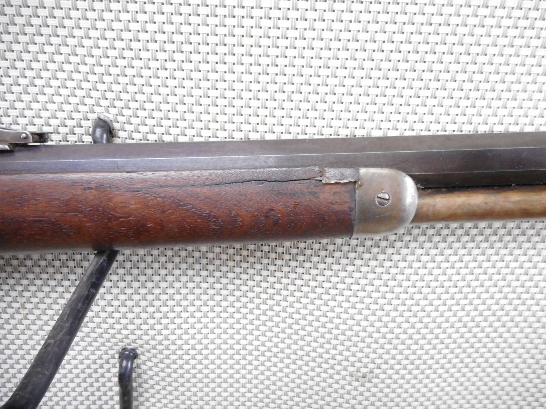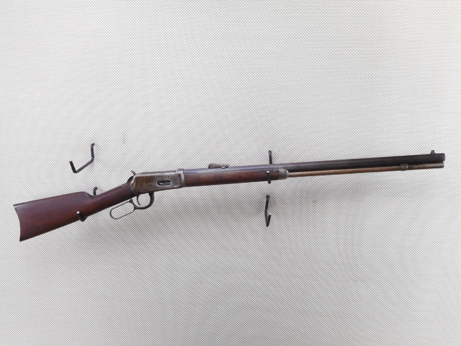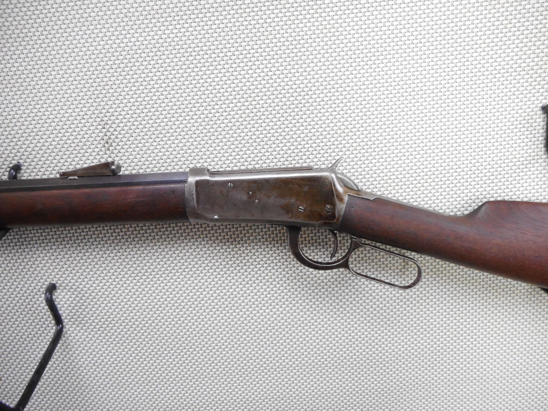 WINCHESTER , MODEL: 1894 , CALIBER: 30-30 WIN , MANUFACTURED 1908. BORE IS DARK. 6" CRACK ALONG THE RIGHT SIDE OF THE FOREND. BLADE FRONT AND ADJUSTABLE REAR SIGHT. OCTAGONAL REPLACED BARREL. CRESCENT STEEL BUTT PLATE. VERY LITTLE FINISH REMAINING ON THE RECEIVER. SHOWS SOME HANDLING MARKS.ACTION: LEVER ACTION RIFLE , BARREL LENGTH: 26" , SERIAL # 445157 , CONDITION: 6/10 , CLASS: CANADIAN NON RESTRICTED CLASS