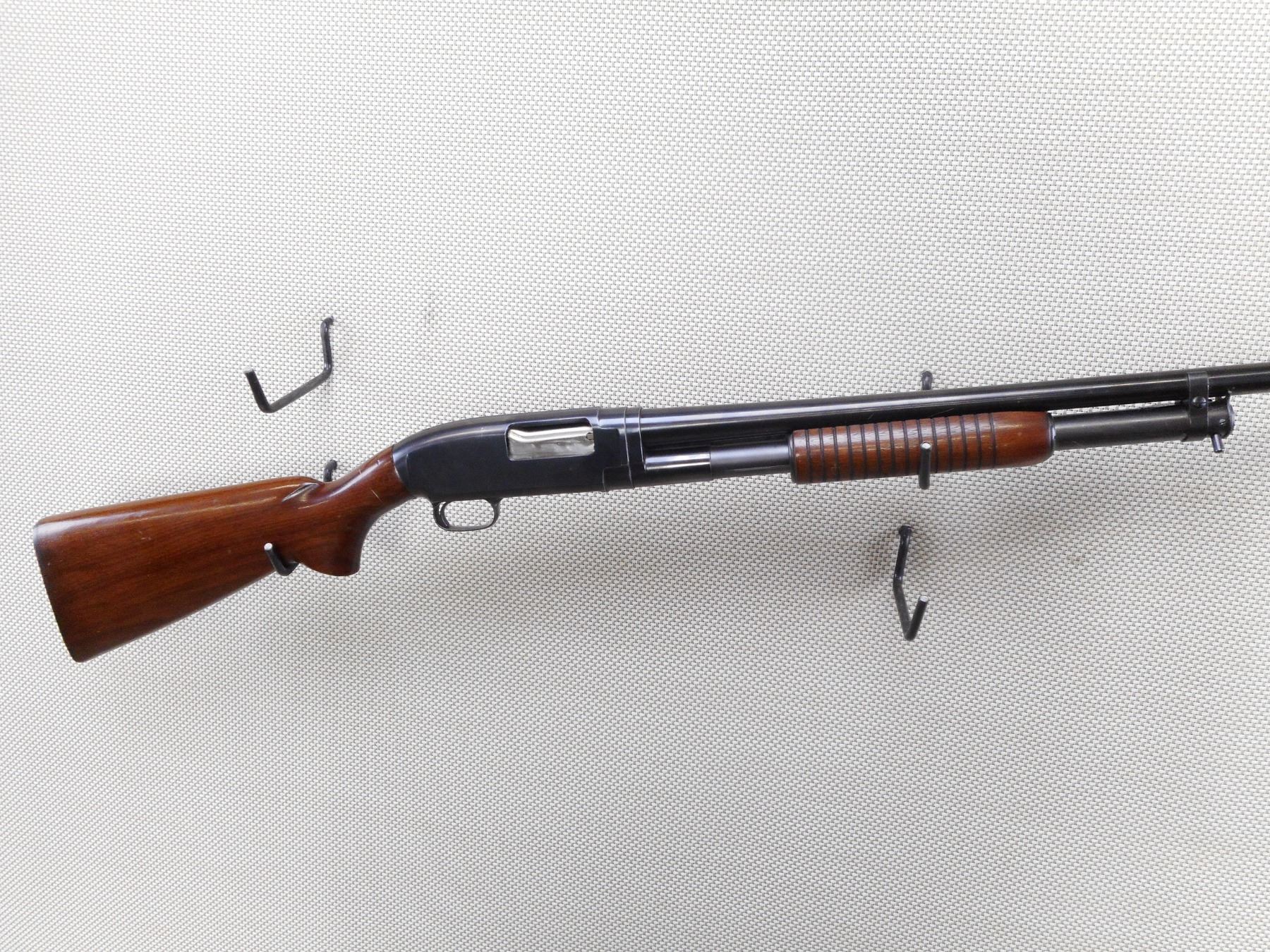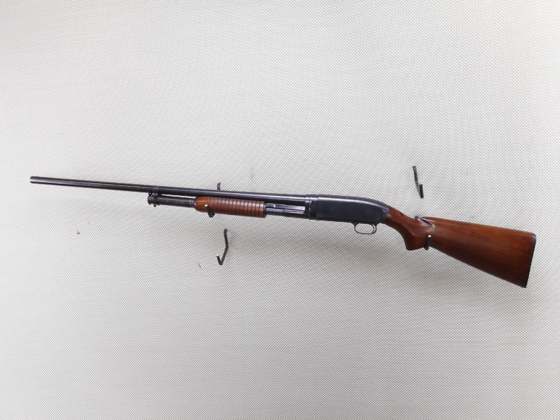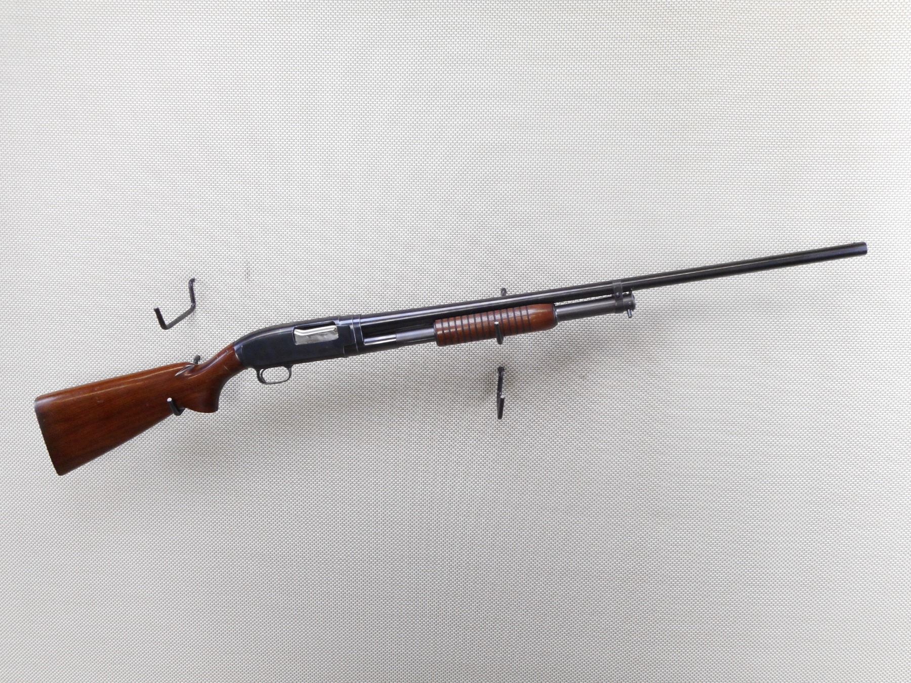 WINCHESTER , MODEL: 12 , CALIBER: 12GA X 2 3/4" , MANUFACTURED 1949. FIXED FULL CHOKE. BORE IS VERY GOOD. BEAD FRONT SIGHT. TWO PIECE HARDWOOD STOCK WITH PLASTIC BUTT PLATE. SHOWS SOME HANDLING MARKS. ACTION: PUMP ACTION SHOTGUN , BARREL LENGTH: 30" , SERIAL # 1113958 , CONDITION: 7/10 , CLASS: CANADIAN NON RESTRICTED CLASS