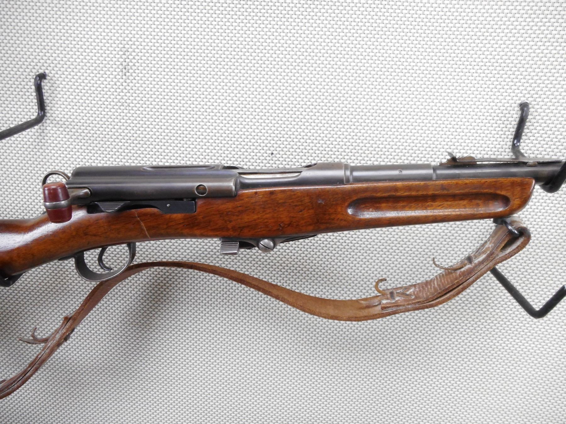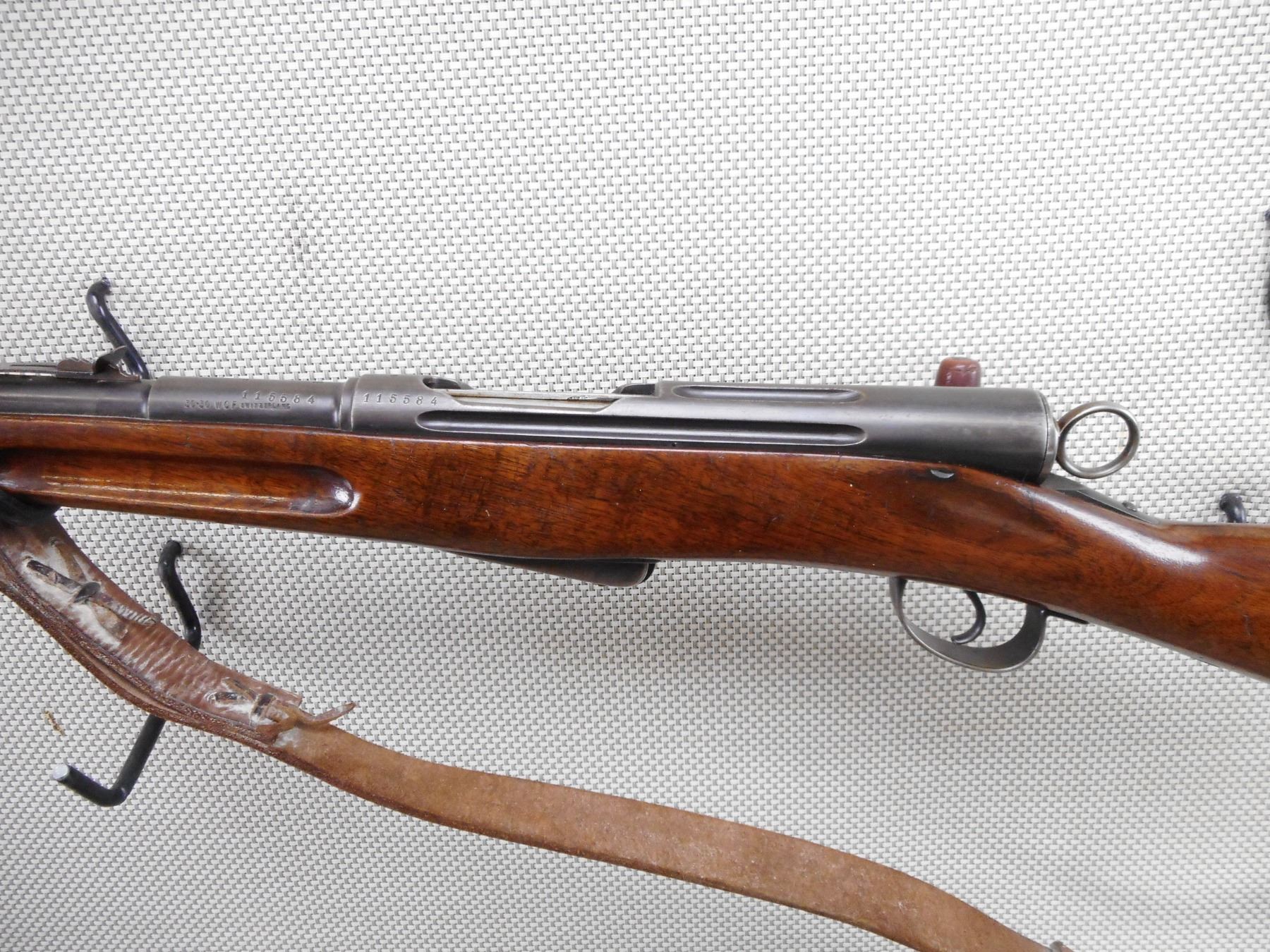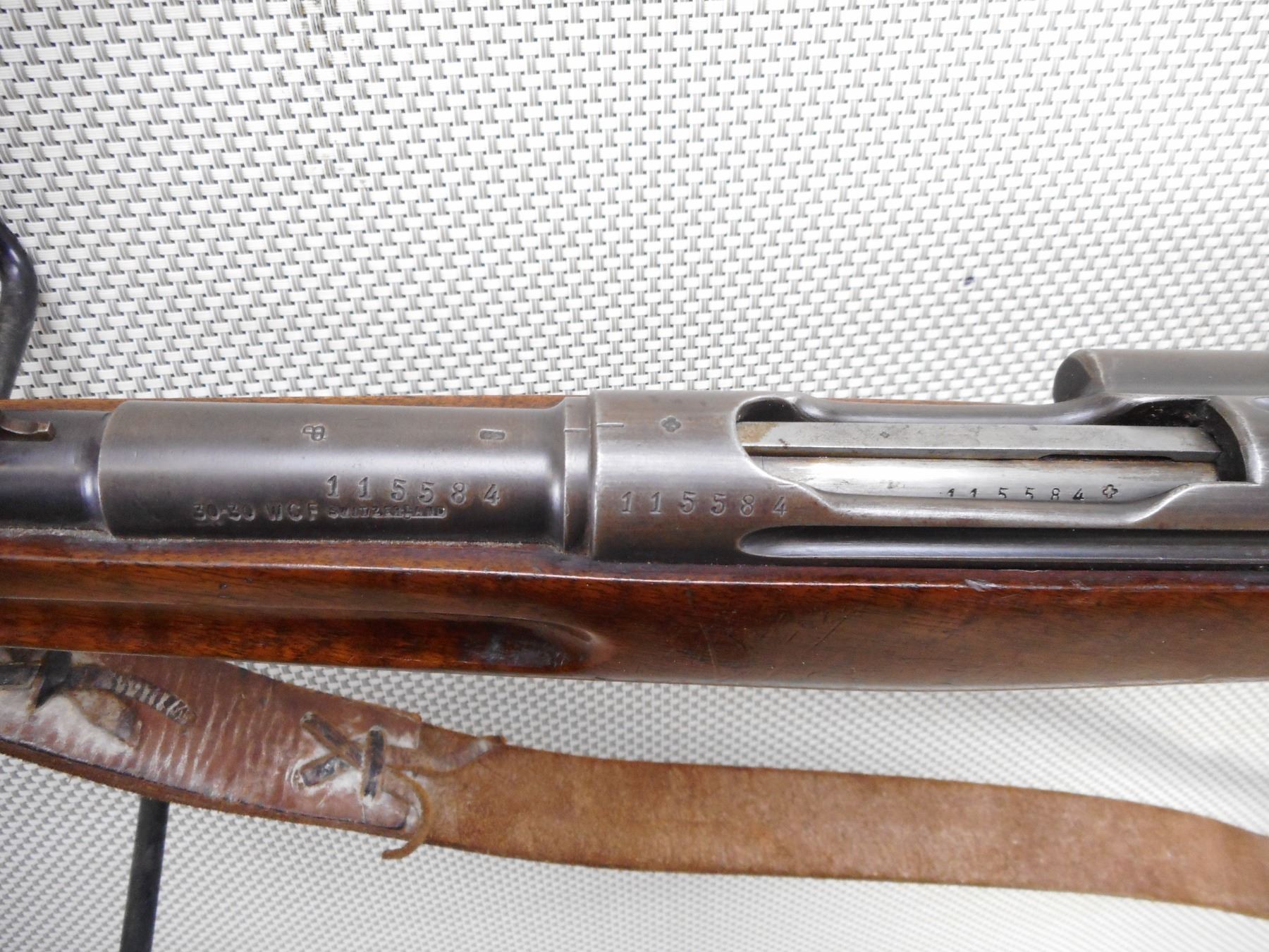 SWISS , MODEL: SPORTER , CALIBER: 30-30 WIN , BORE IS VERY GOOD. BLADE FRONT AND ADJUSTABLE REAR SIGHT. ONE PIECE HARDWOOD STOCK WITH RUSTY STEEL BUTT PLATE. LEATHER SLING. SHOWS SOME HANDLING MARKS. ACTION: STRAIGH PULL BOLT , BARREL LENGTH: 21" , SERIAL # 115584 , CONDITION: 6/10 , CLASS: CANADIAN NON RESTRICTED CLASS