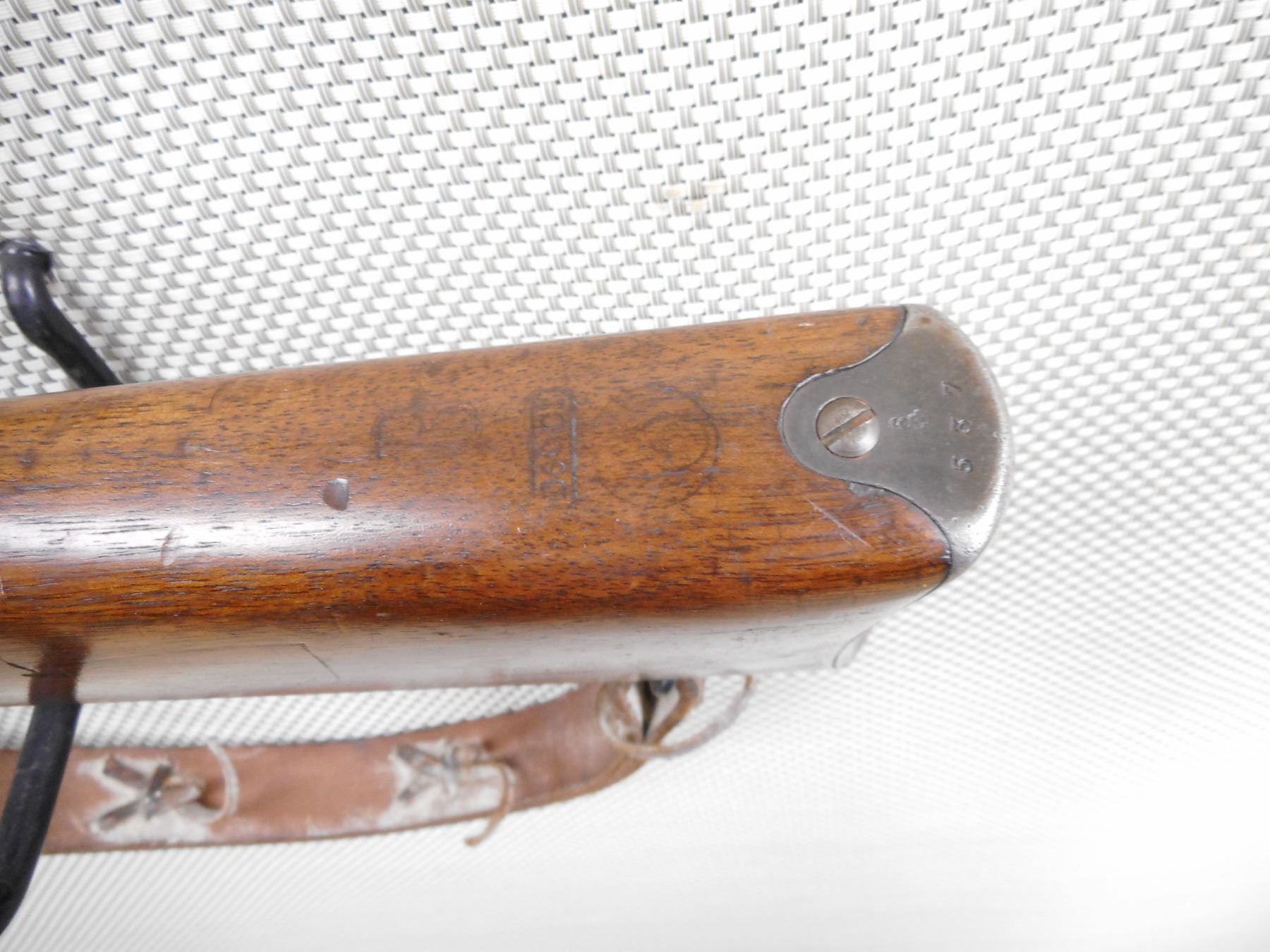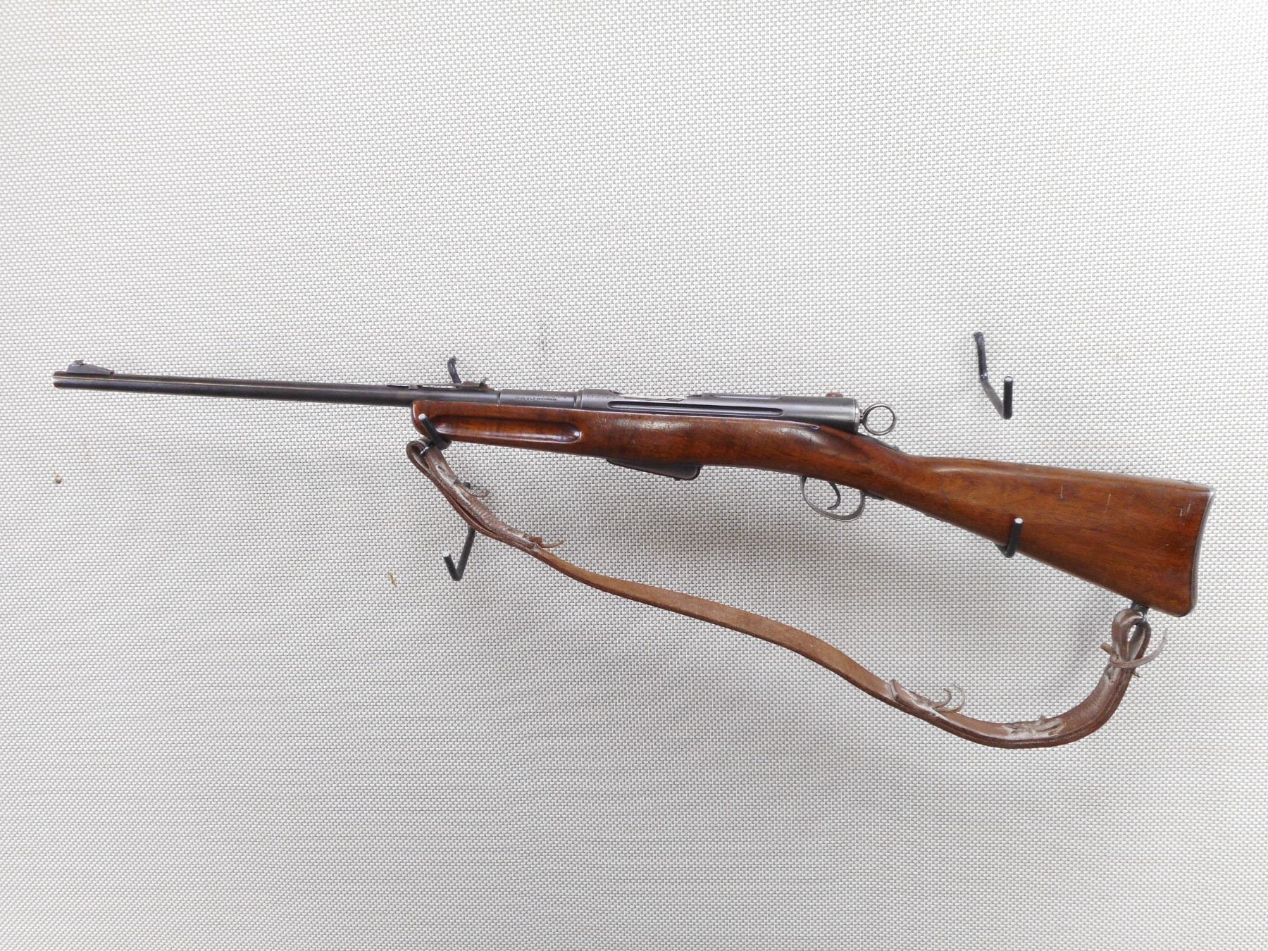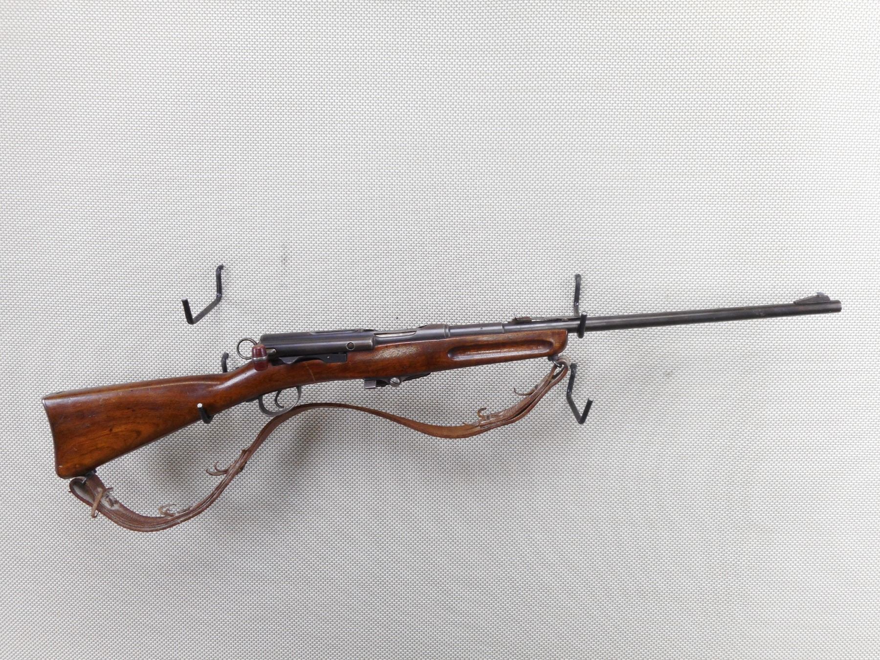 SWISS , MODEL: SPORTER , CALIBER: 30-30 WIN , BORE IS VERY GOOD. BLADE FRONT AND ADJUSTABLE REAR SIGHT. ONE PIECE HARDWOOD STOCK WITH RUSTY STEEL BUTT PLATE. LEATHER SLING. SHOWS SOME HANDLING MARKS. ACTION: STRAIGH PULL BOLT , BARREL LENGTH: 21" , SERIAL # 115584 , CONDITION: 6/10 , CLASS: CANADIAN NON RESTRICTED CLASS