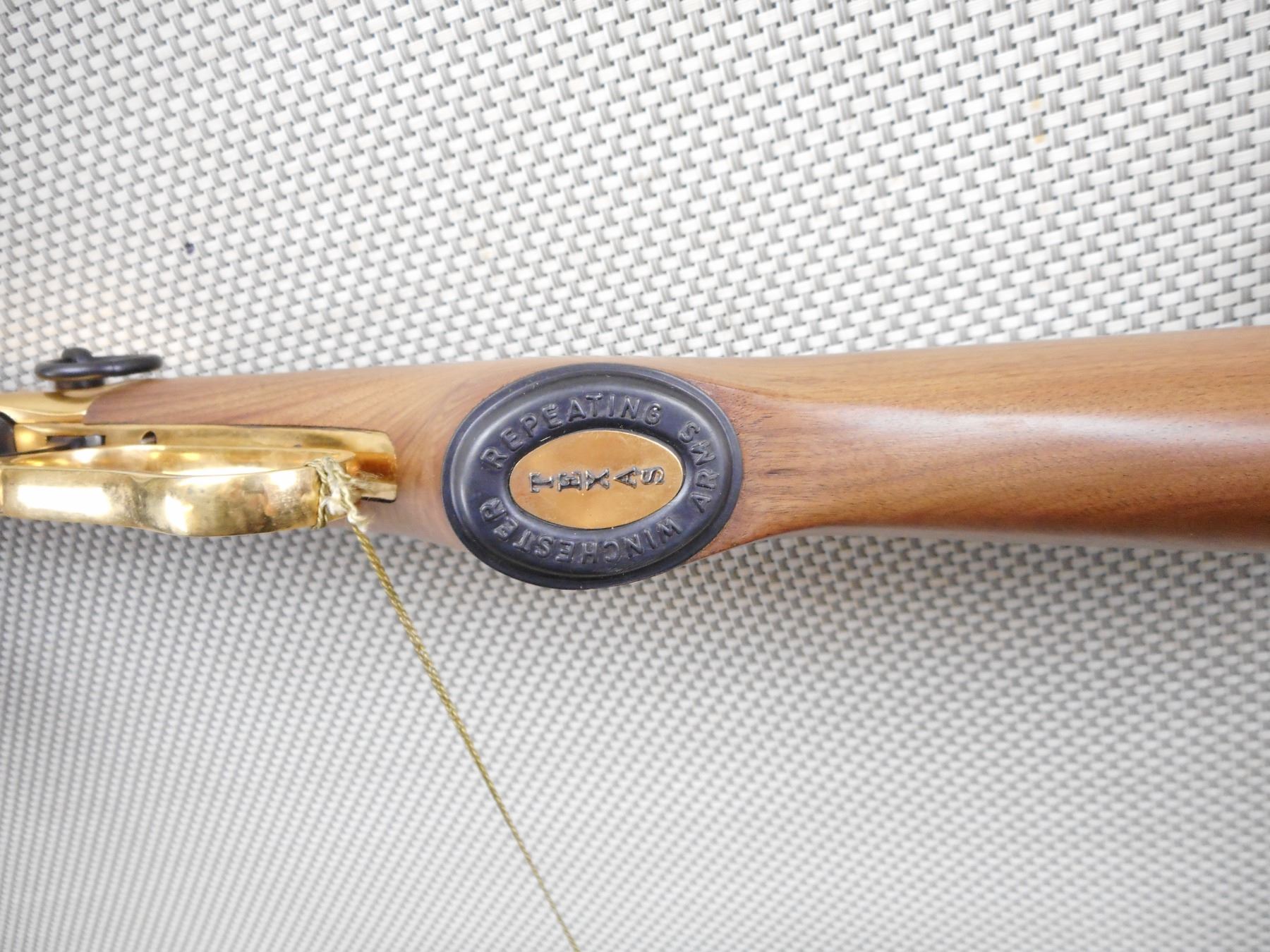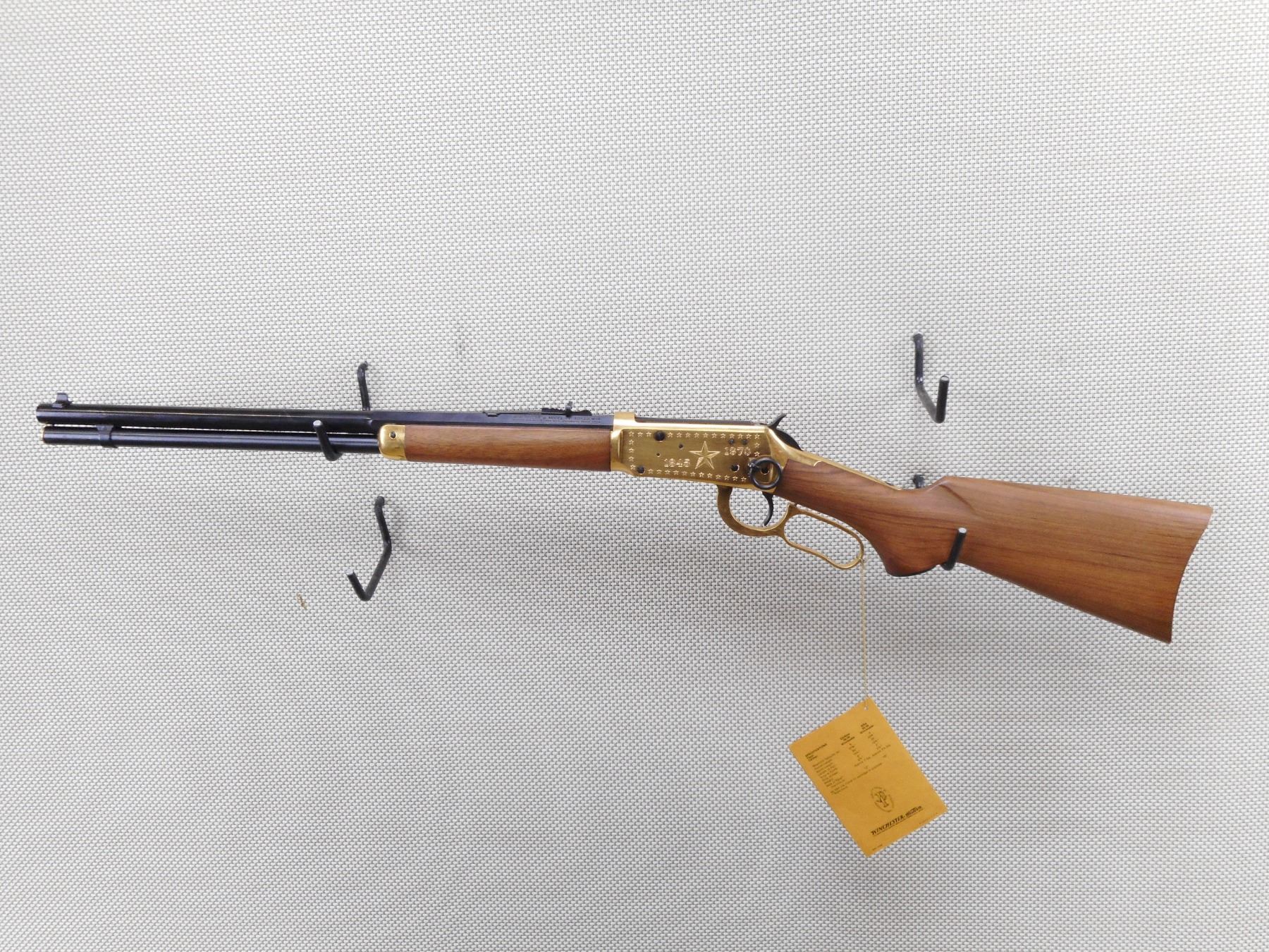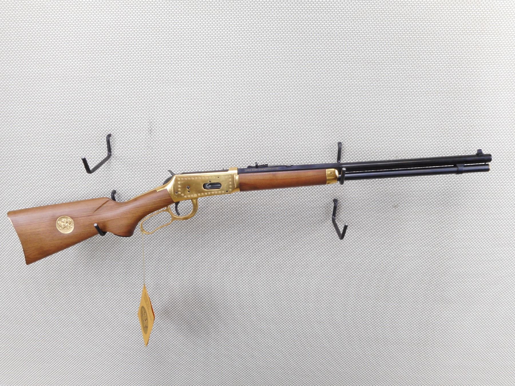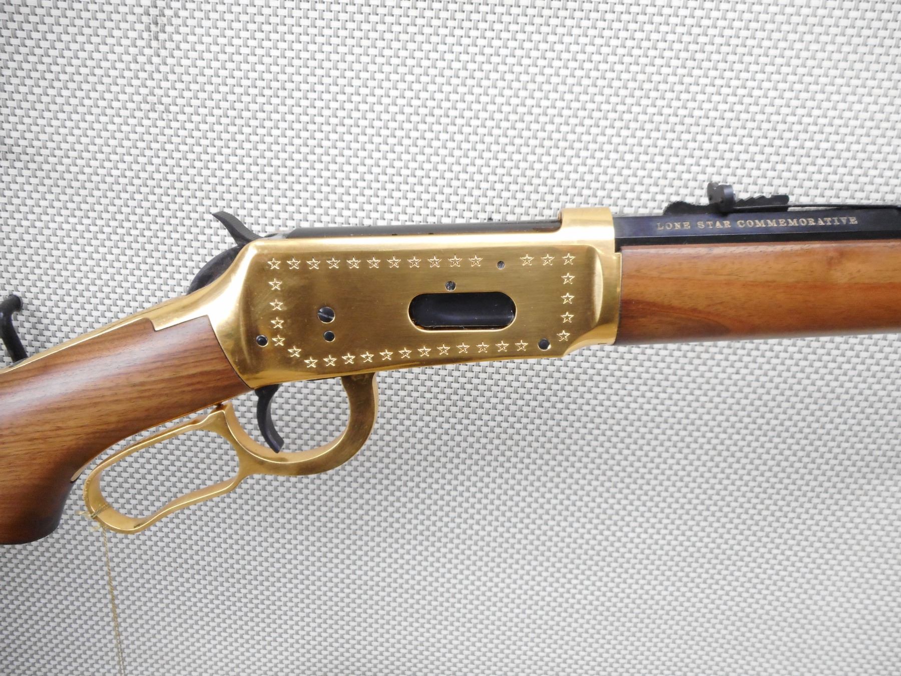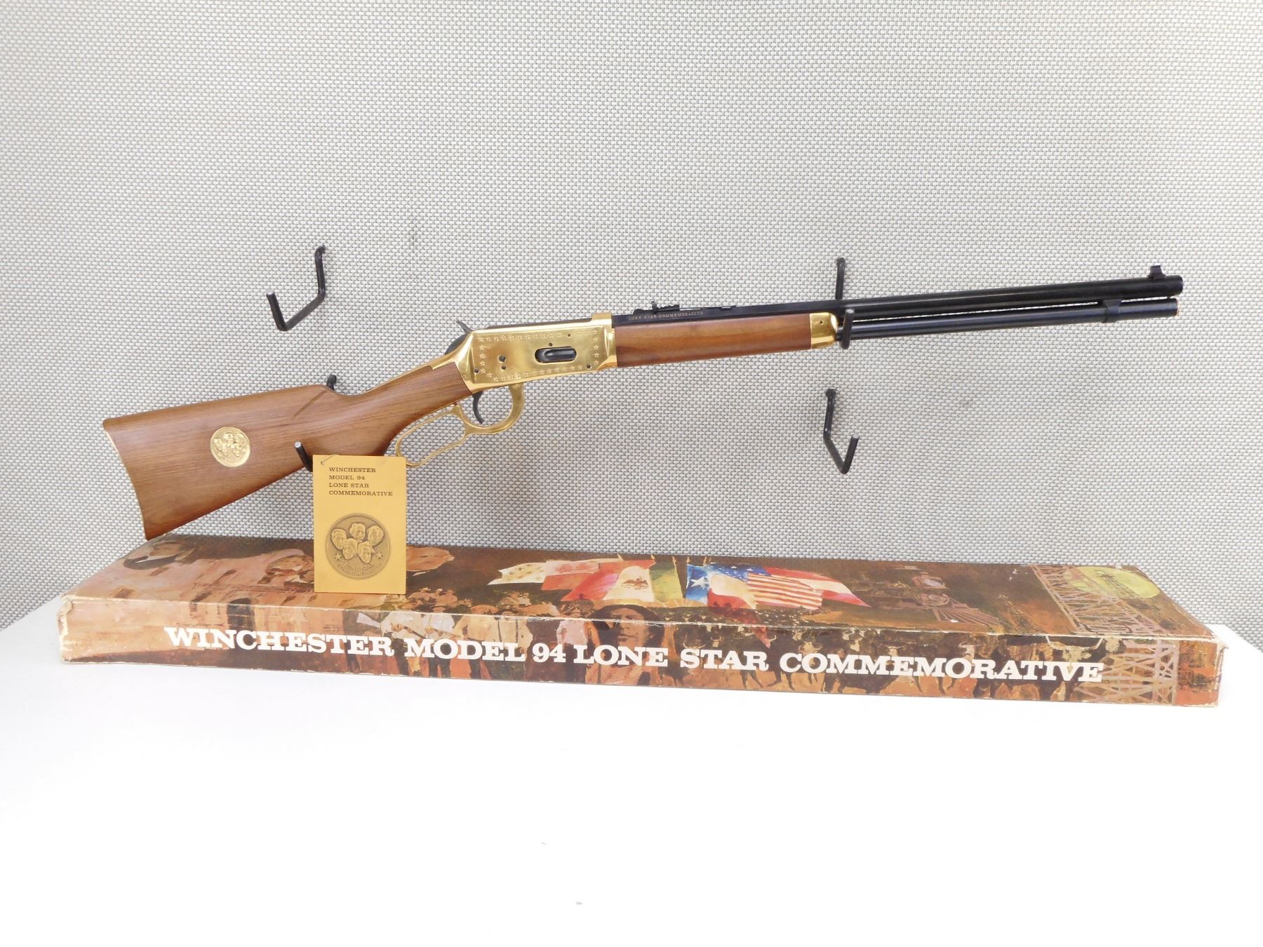 WINCHESTER , MODEL: 94 LONE STAR COMMEMORATIVE , CALIBER: 30-30 WIN , COMES WITH BOX (DAMAGED). BORE IS EXCELLENT, APPEARS AS NEW MAY HAVE BEEN TEST FIRED. 1/2 ROUND 1/2 OCTAGONAL BARRLE. BLADE FRONT AND ADJUSTABLE REAR SIGHTS.TWO PIECE HARDWOOD STOCK. GOLD FOREND CAP, RECEIVER, LEVER AND BUTT PLATE. COMMEMORATIVE LONE STAR GOLD DISK IN BUTT. SHOWS VIRTUALLY NO HANDLING MARKS.ACTION: LEVER ACTION RIFLE , BARREL LENGTH: 20" , SERIAL # LS1963 , CONDITION: AS NEW IN BOX , CLASS: CANADIAN NON RESTRICTED CLASS