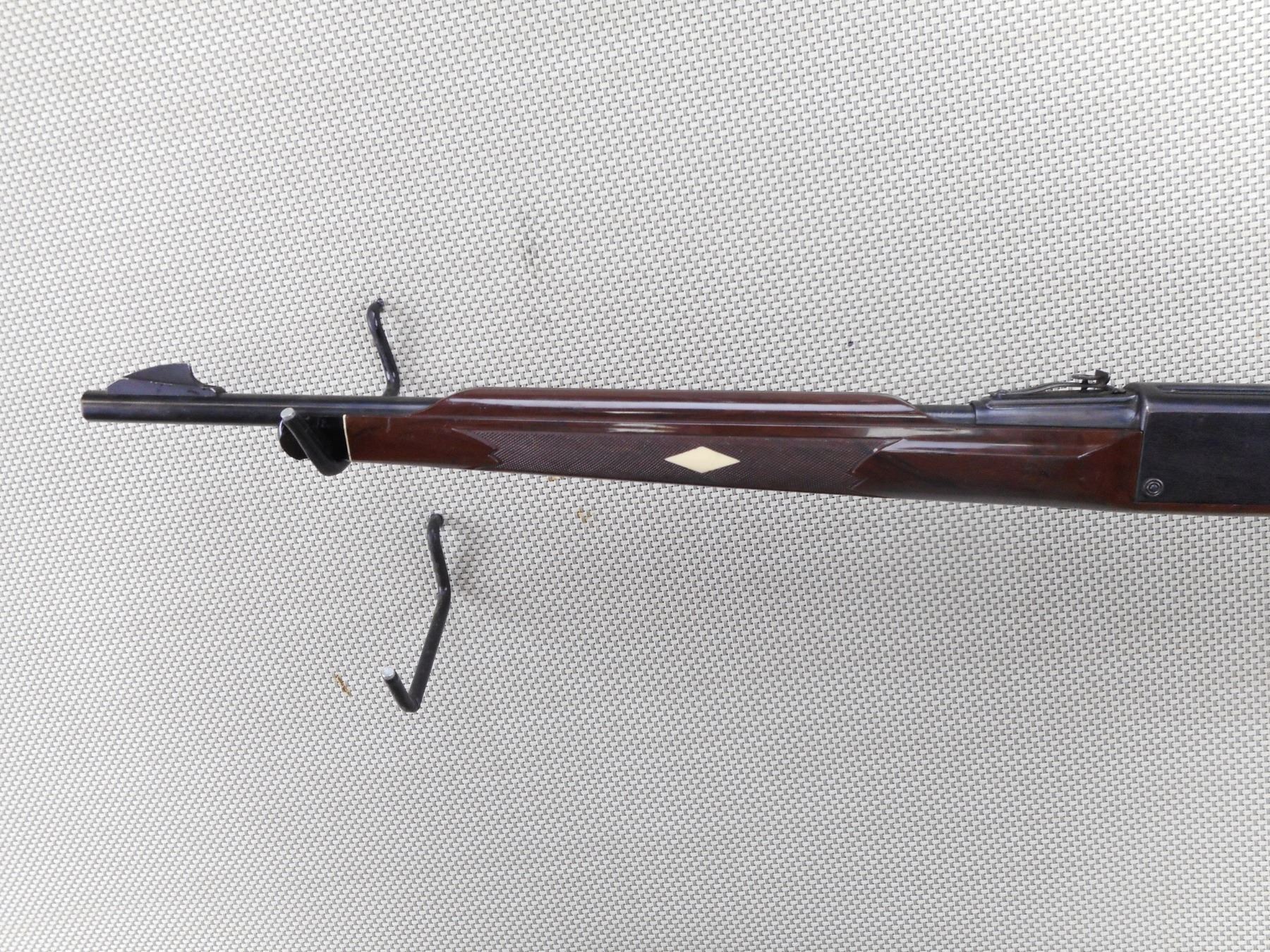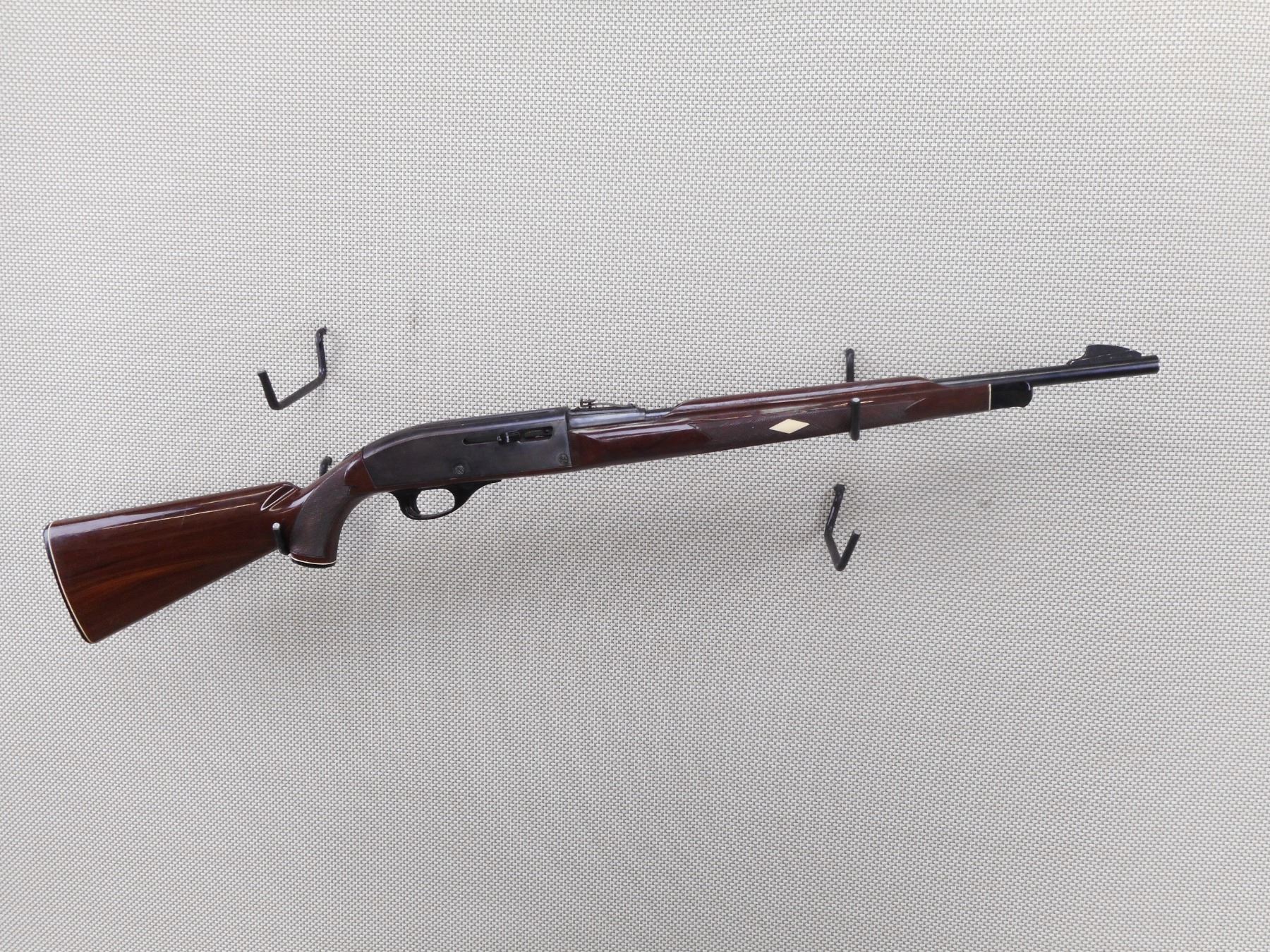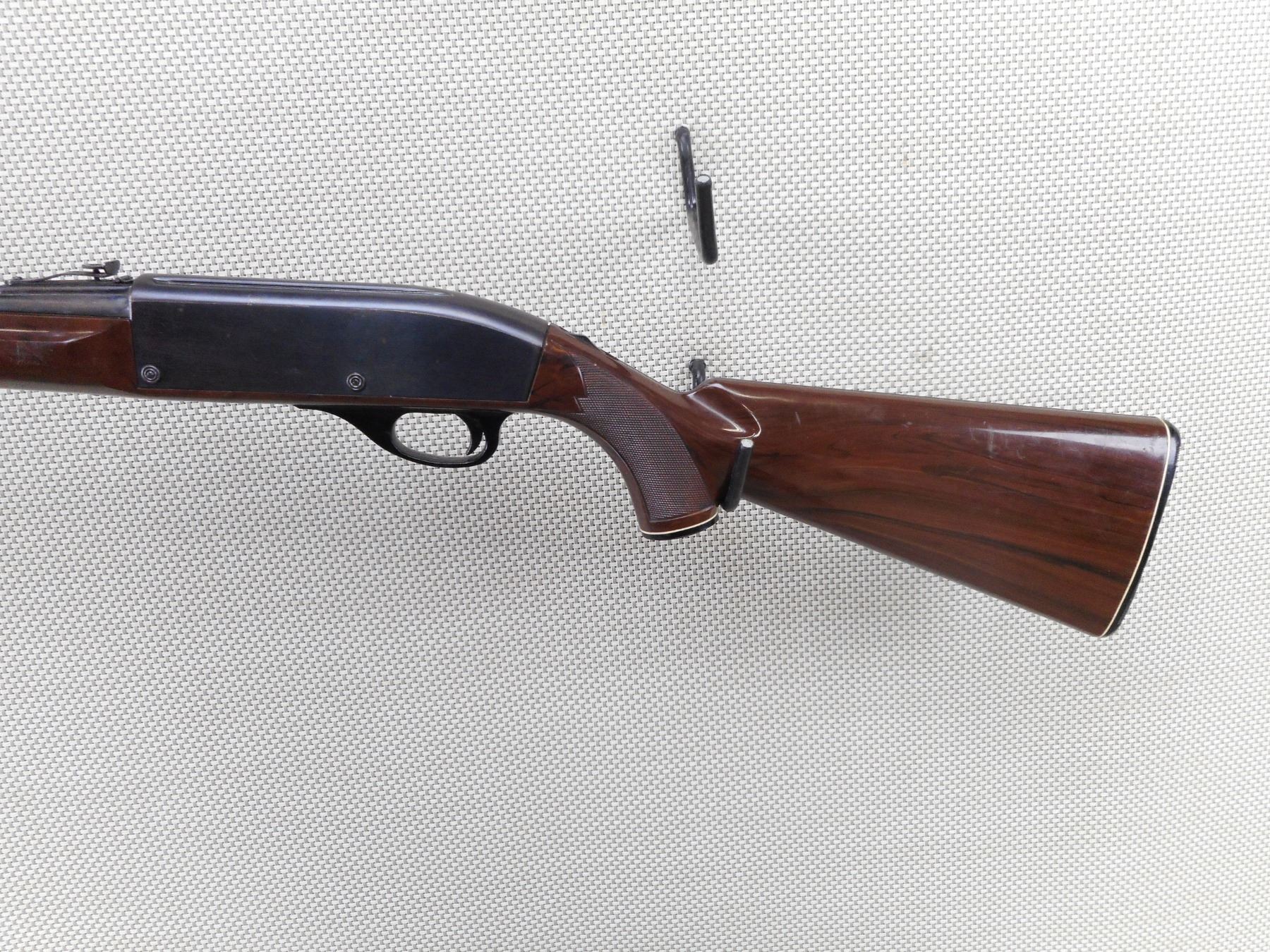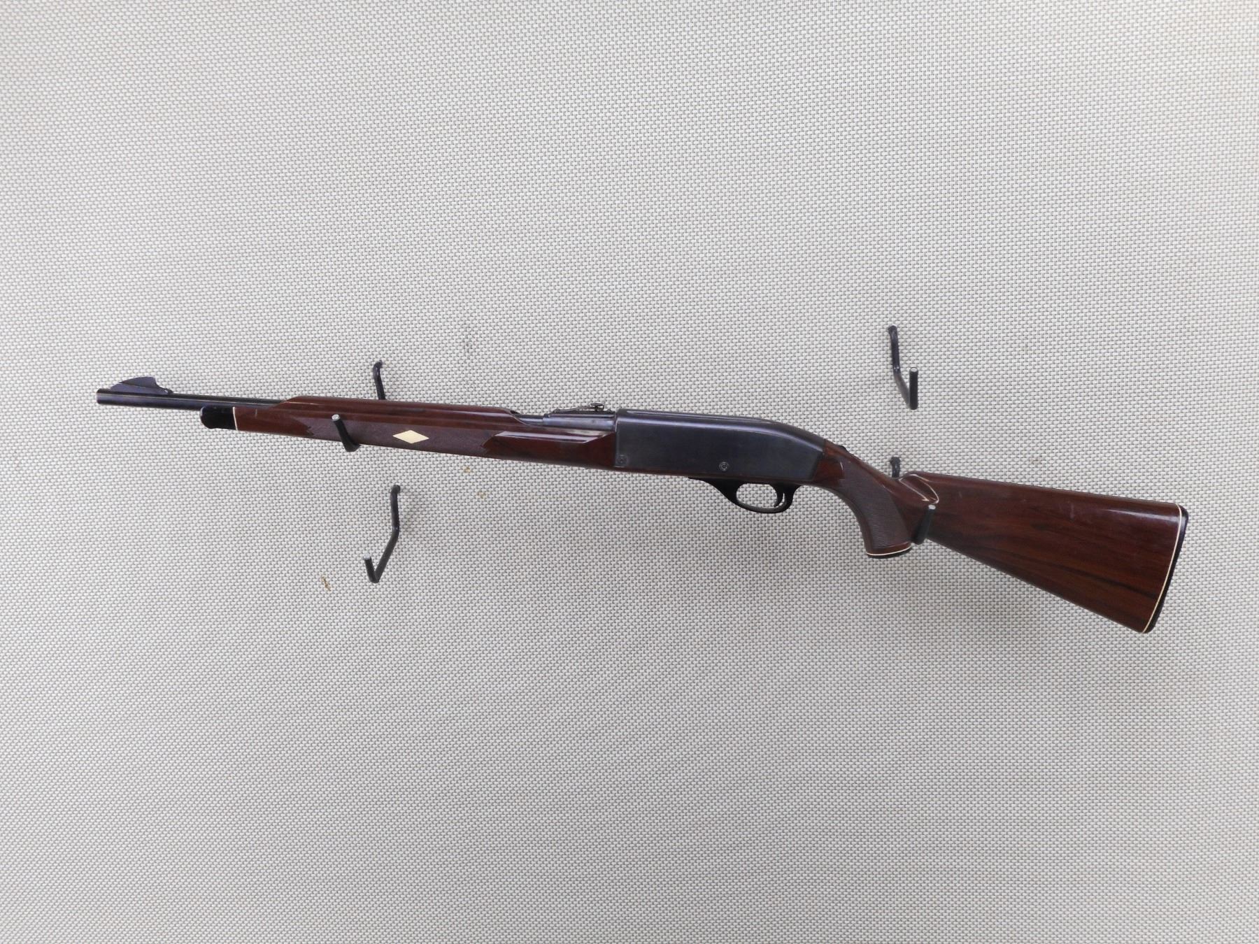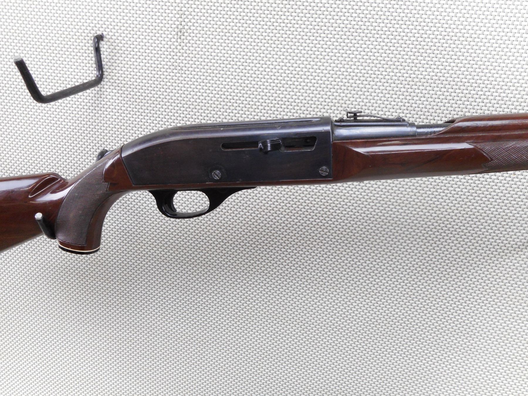 REMINGTON , MODEL: NYLON 66 , CALIBER: 22 LR , BORE IS GOOD. BLADE FRONT AND ADJUSTABLE REAR SIGHT. TWO PIECE CHECKERED NYLON STOCK WITH PLASTIC BUTT PLATE. SHOWS SOME HANDLING MARKS. ACTION: SEMI AUTOMATIC RIFLE , BARREL LENGTH: 20" , SERIAL # 1959 , CONDITION: 6/10 , CLASS: CANADIAN NON RESTRICTED CLASS