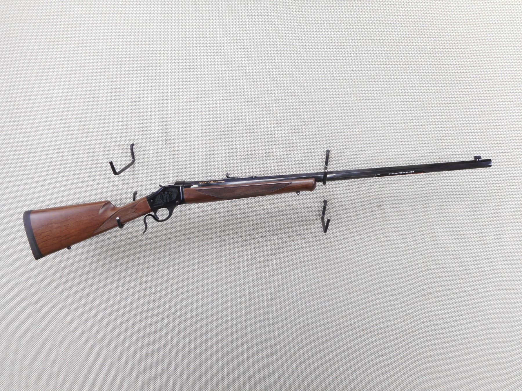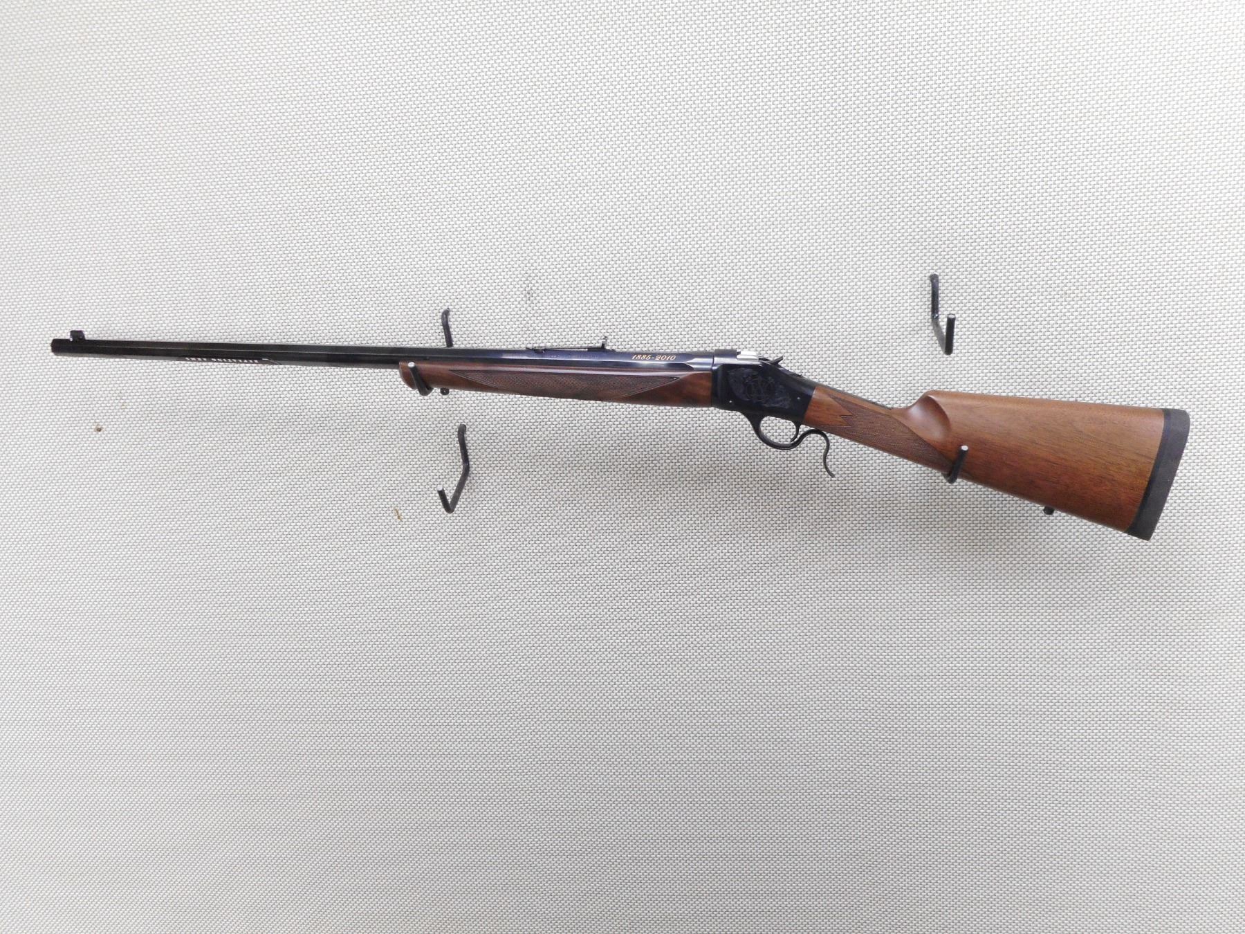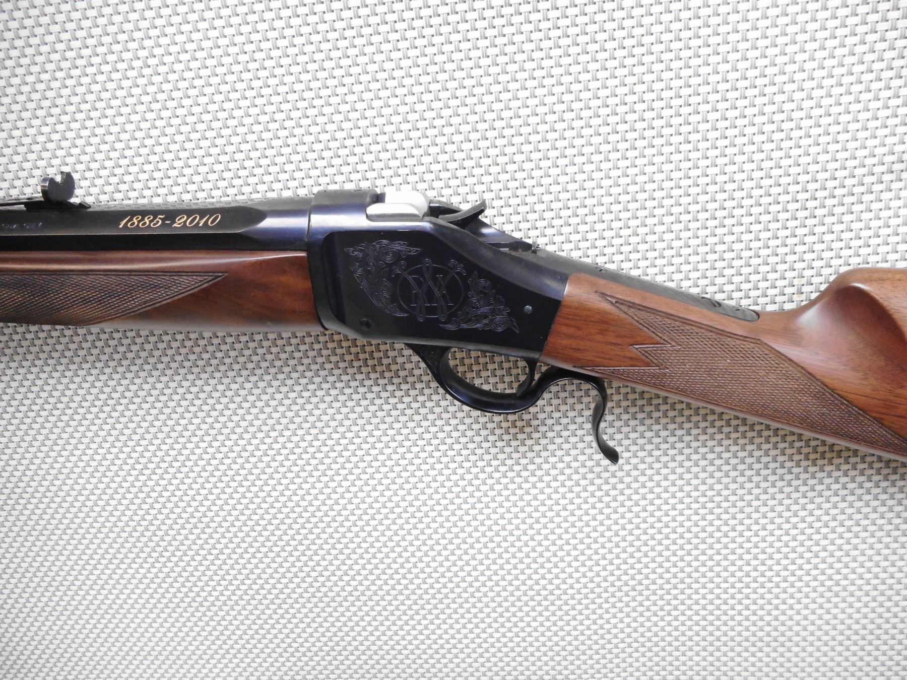 WINCHESTER , MODEL: 1885 125TH ANNIVERSARY COMMEMORATIVE , CALIBER: 45-70 GOVT , COMES WITH BOX, MANUAL, LOCK. BORE IS EXCELLENT, APPEARS AS NEW, MAY HAVE BEEN TEST FIRED. BLADE FRONT AND ADJUSTABLE REAR SIGHT ON AN OCTAGONAL BARREL. CHECKERED TWO PIECE HARDWOOD STOCK WITH RUBBER RECOIL PAD. SLING SWIVEL LOOPS. SHOWS VIRTUALLY NO HANDLING MARKS. ACTION: FALLING BLOCK , BARREL LENGTH: 28" , SERIAL # 00072ZM85C , CONDITION: AS NEW IN BOX , CLASS: CANADIAN NON RESTRICTED CLASS