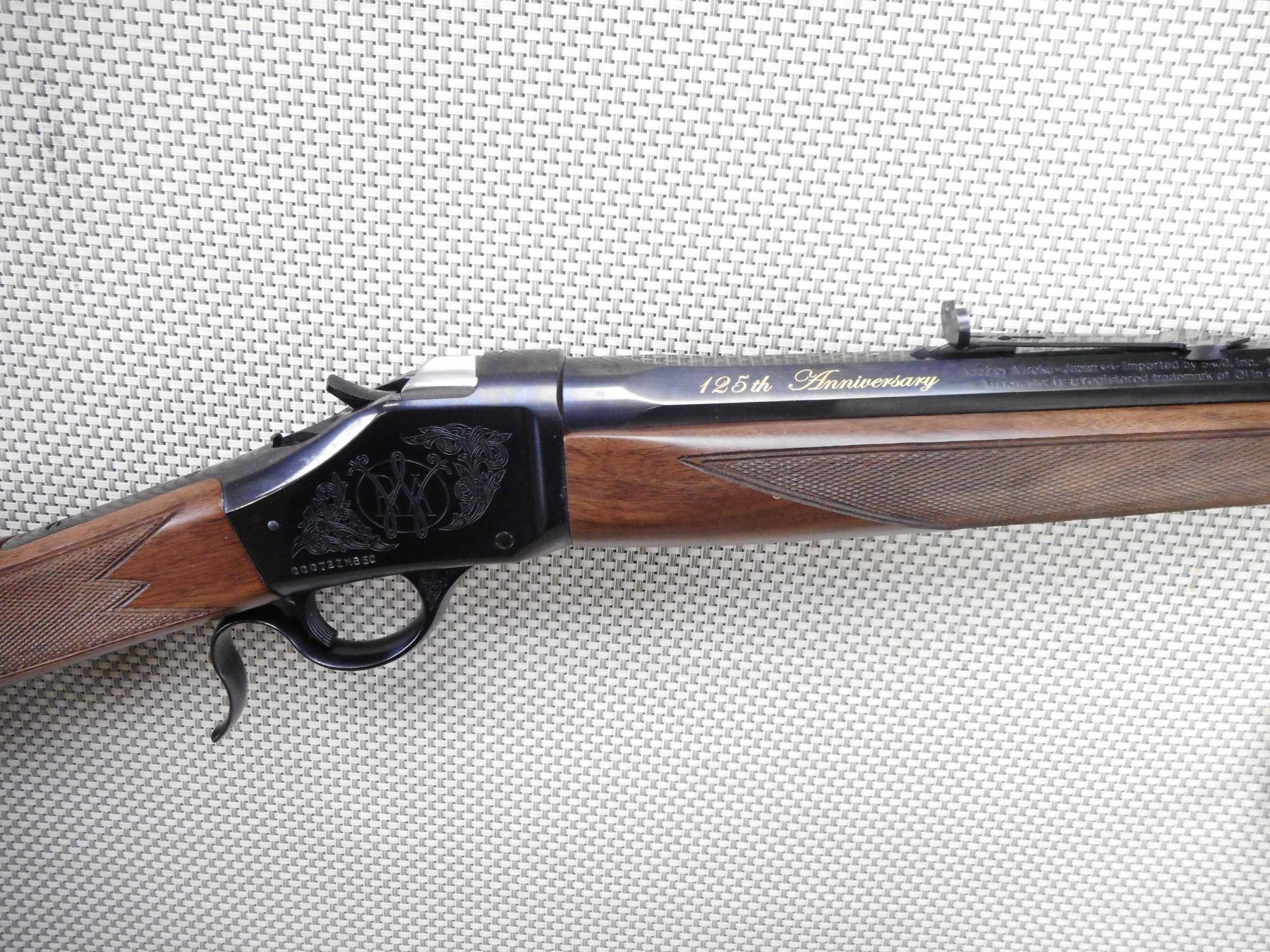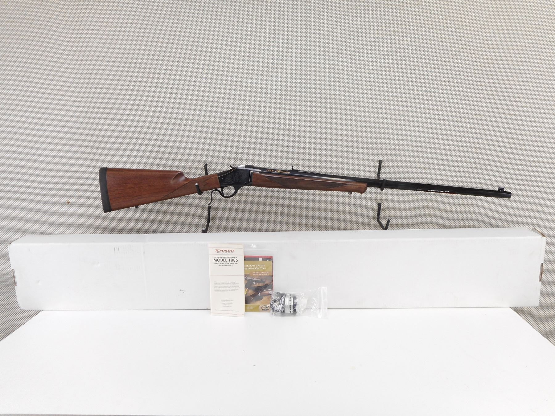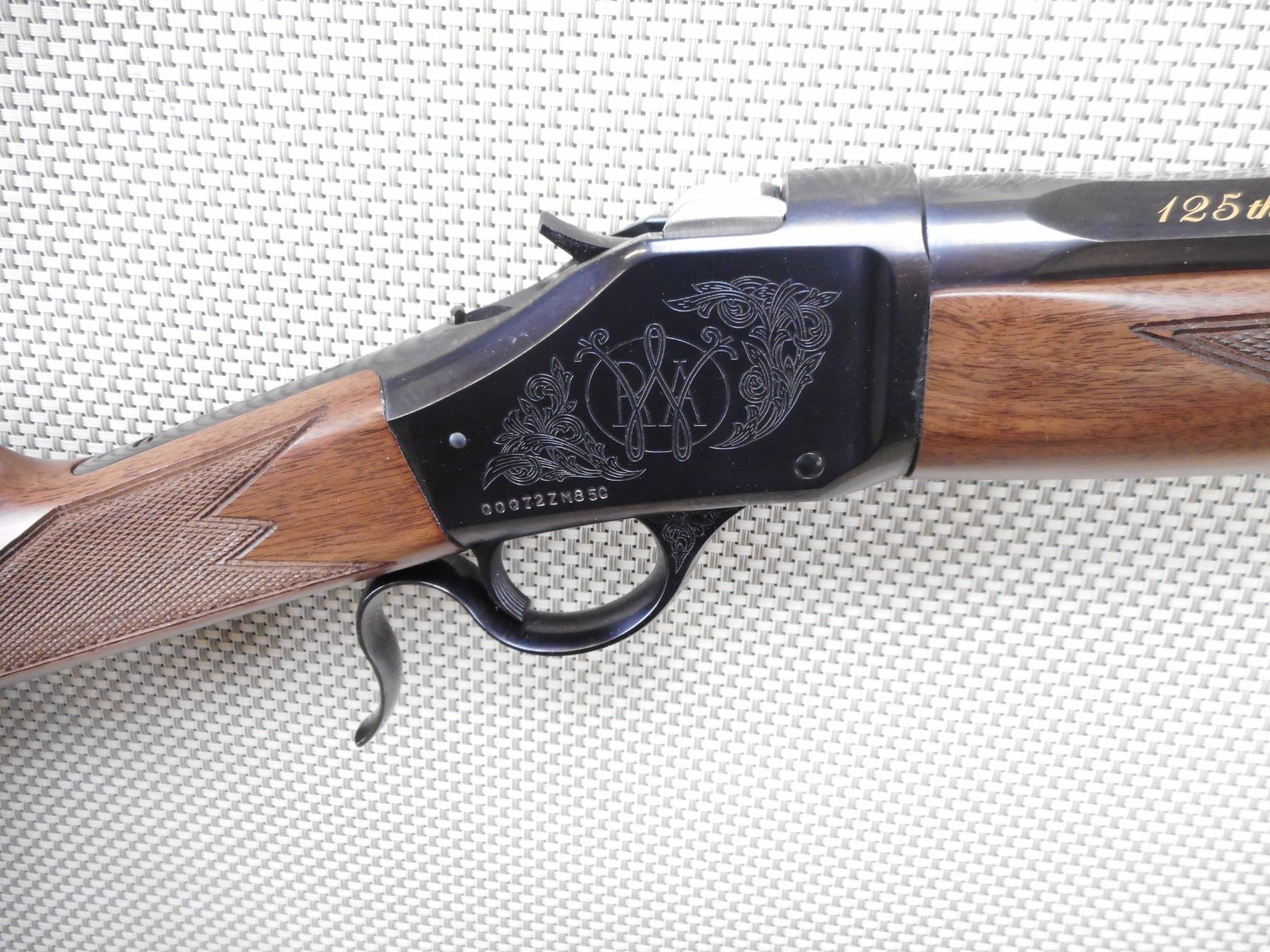 WINCHESTER , MODEL: 1885 125TH ANNIVERSARY COMMEMORATIVE , CALIBER: 45-70 GOVT , COMES WITH BOX, MANUAL, LOCK. BORE IS EXCELLENT, APPEARS AS NEW, MAY HAVE BEEN TEST FIRED. BLADE FRONT AND ADJUSTABLE REAR SIGHT ON AN OCTAGONAL BARREL. CHECKERED TWO PIECE HARDWOOD STOCK WITH RUBBER RECOIL PAD. SLING SWIVEL LOOPS. SHOWS VIRTUALLY NO HANDLING MARKS. ACTION: FALLING BLOCK , BARREL LENGTH: 28" , SERIAL # 00072ZM85C , CONDITION: AS NEW IN BOX , CLASS: CANADIAN NON RESTRICTED CLASS