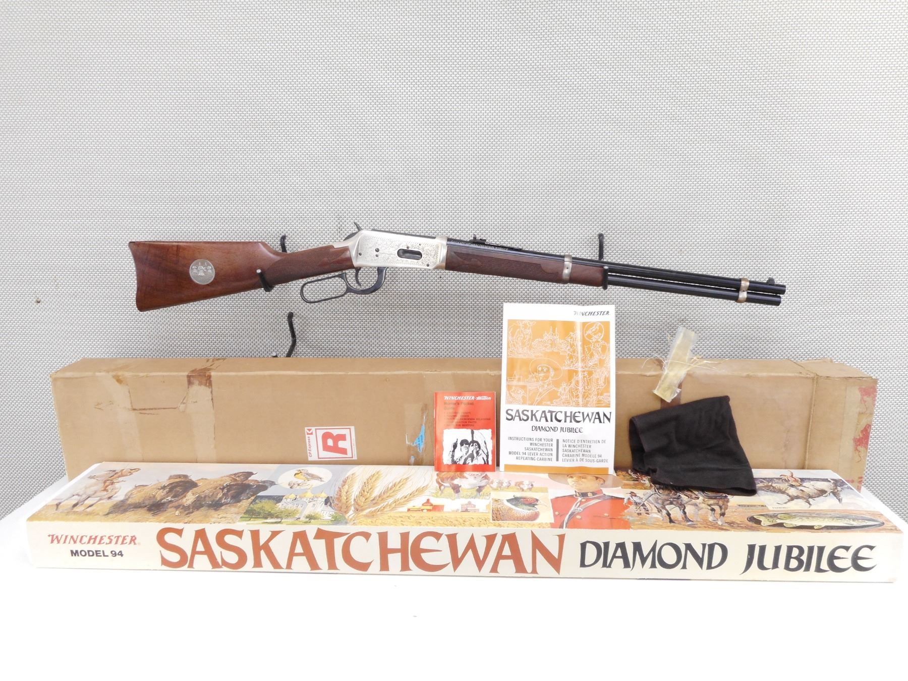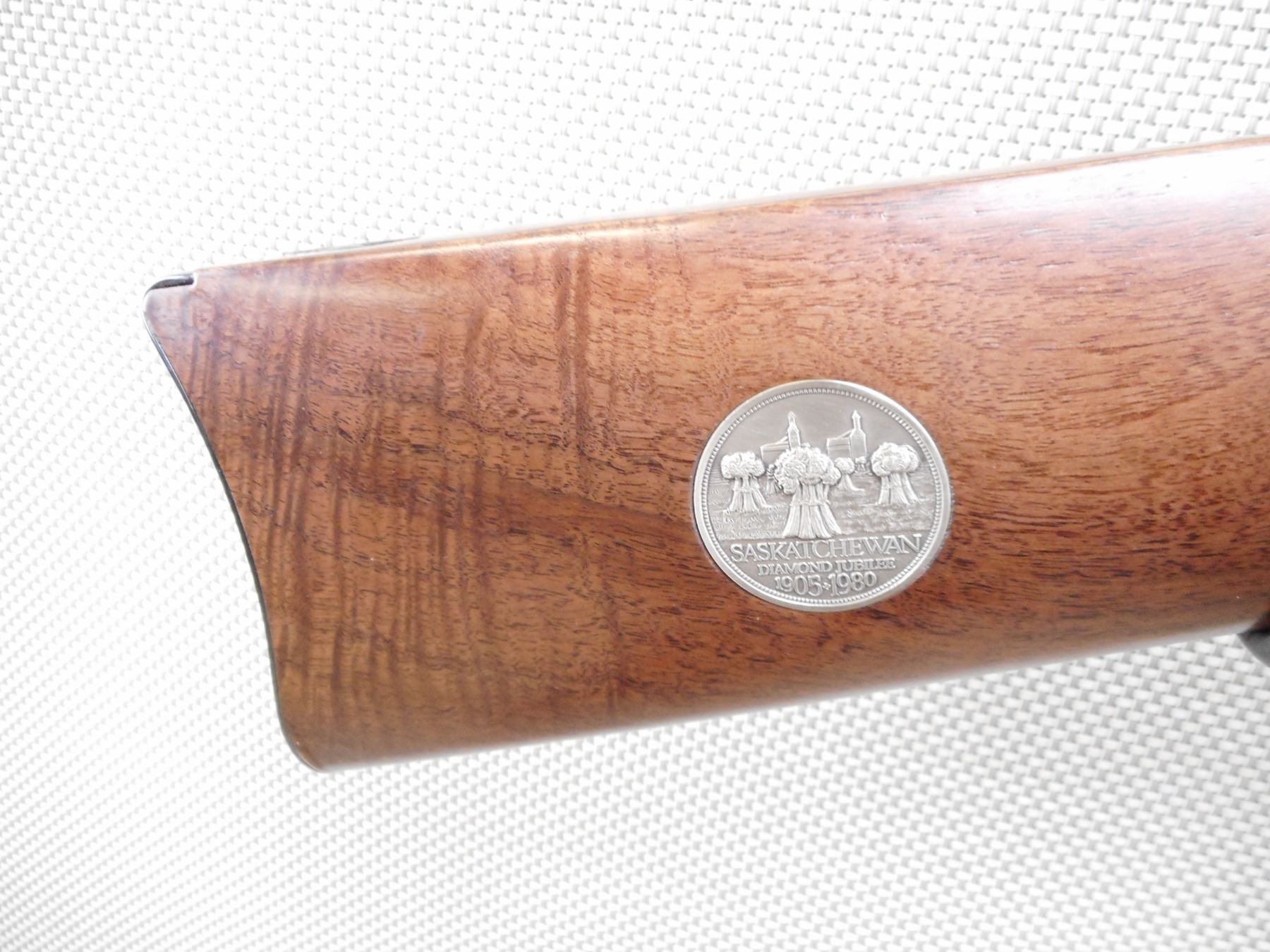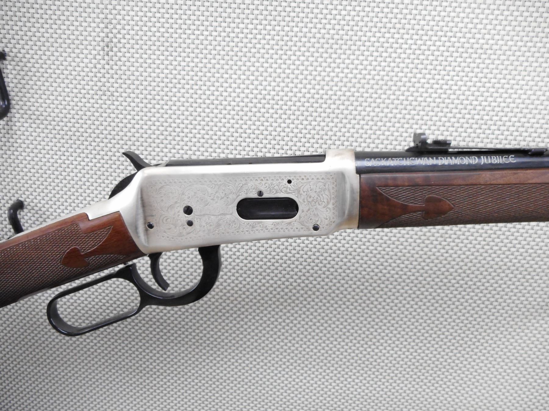 WINCHESTER , MODEL: 94 SASKATCHEWAN DIAMOND JUBILEE 1905-1980 , CALIBER: 38-55 WIN , COMES WITH BOX, CLEANING CLOTH AND MANUAL, BORE IS EXCELLENT, APPEARS AS NEW, MAY HAVE BEEN TEST FIRED. BLADE FRONT AND ADJUSTABLE REAR SIGHT. CHECKERED TWO PIECE HARDWOOD STOCK WITH STEEL BUTT PLATE. RICHLY ENGRAVED RECEIVER WITH WESTERN GRAIN ELEVATOR SCENE. COMMEMORATIVE DISK IMBEDDED IN STOCK. DUE TO INCORREC STORAGE THE FIREARM SILVER FINISHES ARE TARNISHED. ACTION: LEVER ACTION RIFLE , BARREL LENGTH: 20" , SERIAL # SDJ742 , CONDITION: 9/10 , CLASS: CANADIAN NON RESTRICTED CLASS