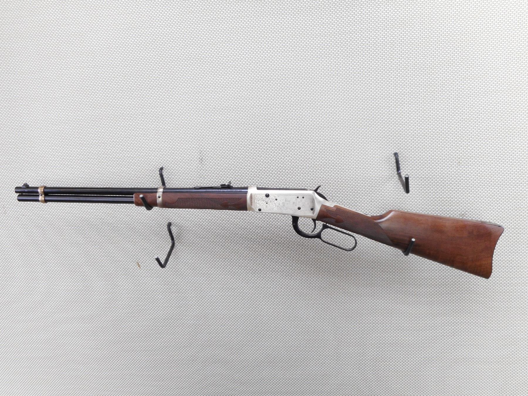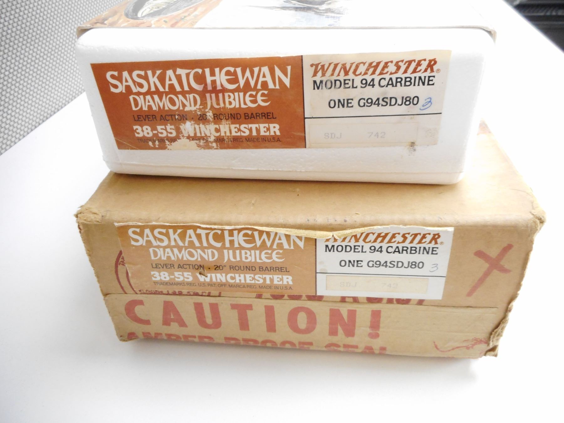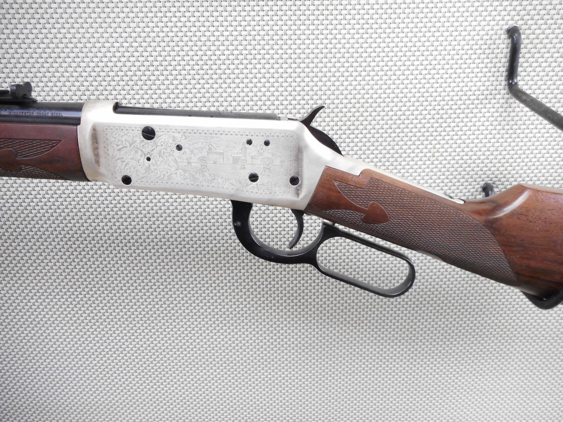 WINCHESTER , MODEL: 94 SASKATCHEWAN DIAMOND JUBILEE 1905-1980 , CALIBER: 38-55 WIN , COMES WITH BOX, CLEANING CLOTH AND MANUAL, BORE IS EXCELLENT, APPEARS AS NEW, MAY HAVE BEEN TEST FIRED. BLADE FRONT AND ADJUSTABLE REAR SIGHT. CHECKERED TWO PIECE HARDWOOD STOCK WITH STEEL BUTT PLATE. RICHLY ENGRAVED RECEIVER WITH WESTERN GRAIN ELEVATOR SCENE. COMMEMORATIVE DISK IMBEDDED IN STOCK. DUE TO INCORREC STORAGE THE FIREARM SILVER FINISHES ARE TARNISHED. ACTION: LEVER ACTION RIFLE , BARREL LENGTH: 20" , SERIAL # SDJ742 , CONDITION: 9/10 , CLASS: CANADIAN NON RESTRICTED CLASS