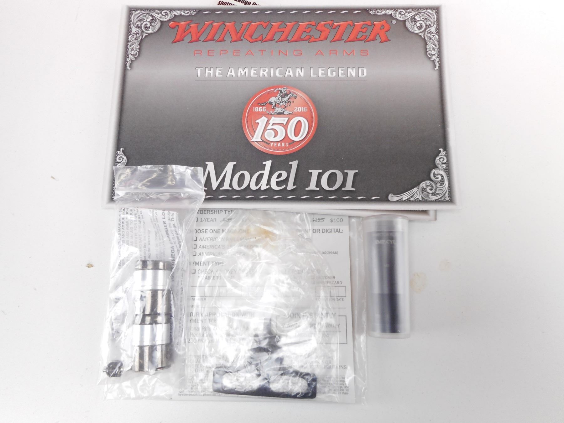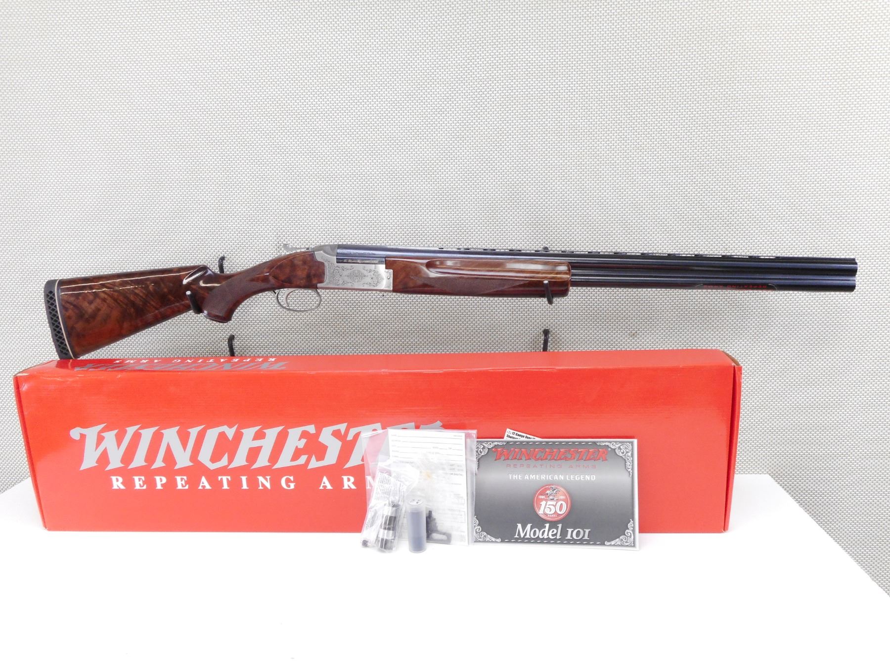 WINCHESTER , MODEL: 101 FIELD 1866-2016 150TH ANNIVERSARY COMMEMORATIVE , CALIBER: 12GA X 3" , COMES WITH BOX, TOTAL OF 4 CHOKES, CHOKE WRENCH, MANUAL. BORES ARE EXCELLENT, APPEARS AS NEW, MAY HAVE BEEN TEST FIRED. WHITE BEAD FRONT ON A VENTED RIB BARREL. CHECKERED TWO PIECE HARDWOOD STOCK WITH CAPPED PISTOL GRIP AND VENTED RUBBER RECOIL PAD. 14" LENGTH OF PULL. EJECTORS. SHOWS VIRTUALLY NO HANDLING MARKS. ACTION: OVER UNDER BREAK ACTION SHOTGUN , BARREL LENGTH: 28" , SERIAL # 1012016153 , CONDITION: AS NEW IN BOX , CLASS: CANADIAN NON RESTRICTED CLASS