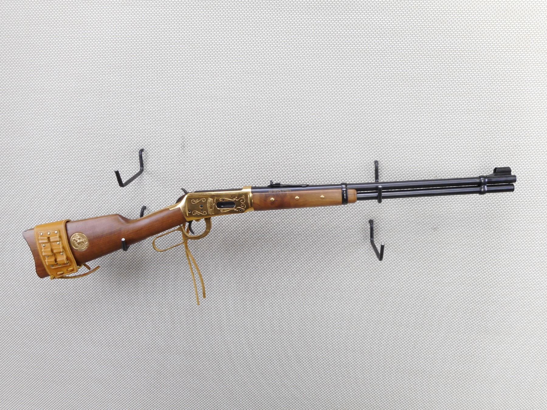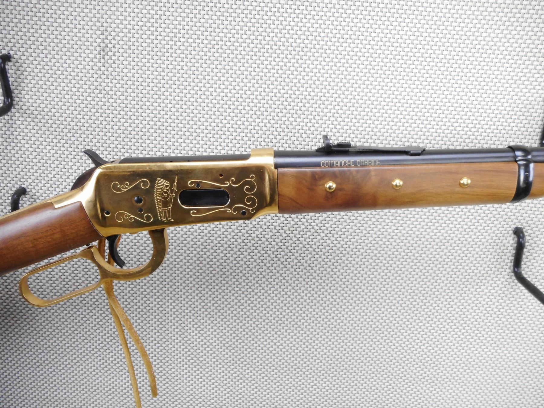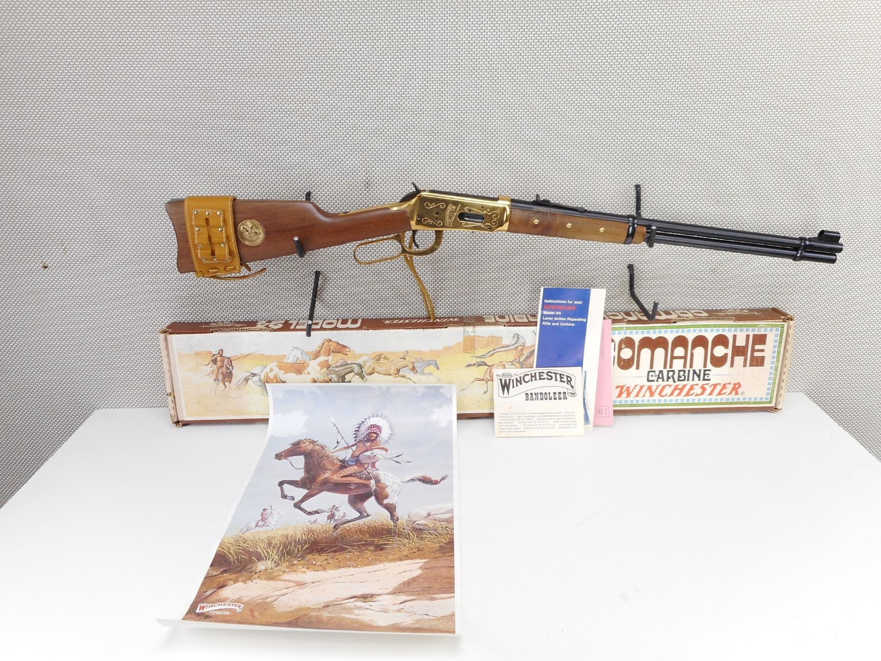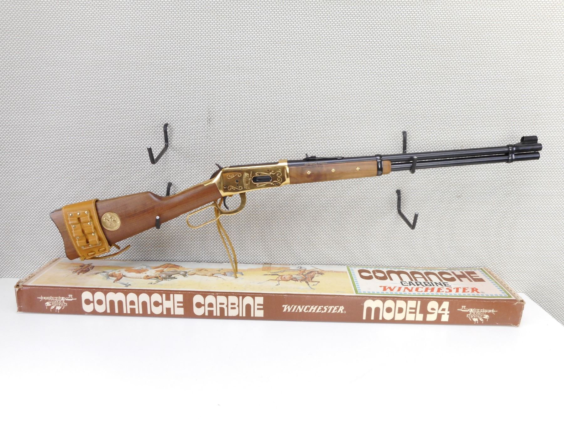 WINCHESTER , MODEL: 94 COMANCHE CARBINE , CALIBER: 30-30 WIN , COMES WITH BOX, MANUAL AND POSTER. BORE IS EXCELLENT, APPEARS AS NEW, MAY HAVE BEEN TEST FIRED. HOODED FRONT AND ADJUSTABLE REAR SIGHT. TWO PIECE HARDWOOD STOCK WITH 6 TACKS IN THE FOREND. LEATHER CARTRIDGE SLEAVE. STEEL BUTT PLATE. SADDLE RING WITH LEATHER TASSLE. SHOWS VIRTUALLY NO HANDLING MARKS. ACTION: LEVER ACTION RIFLE , BARREL LENGTH: 20" , SERIAL # CG6187 , CONDITION: AS NEW IN THE BOX , CLASS: CANADIAN NON RESTRICTED CLASS