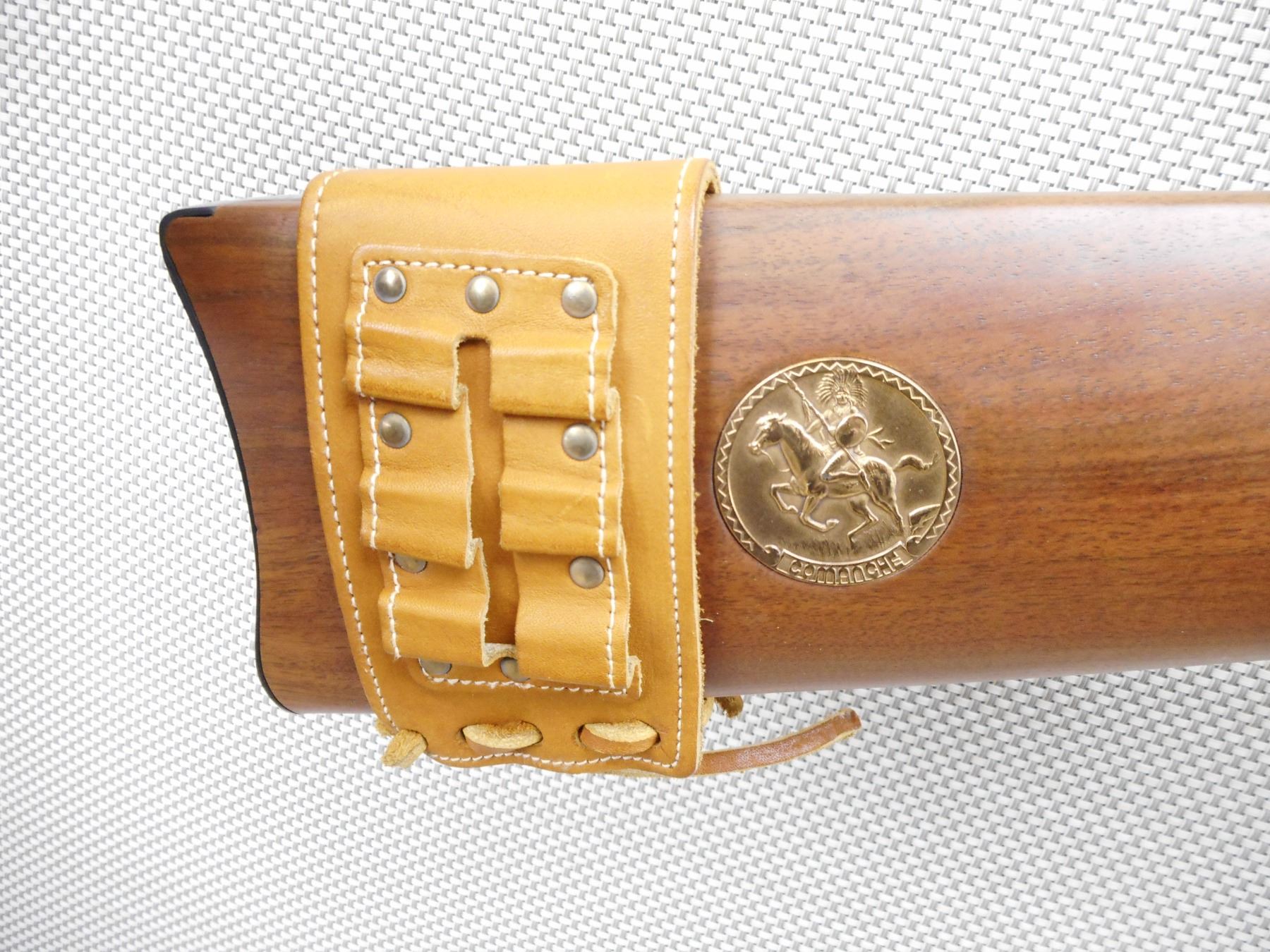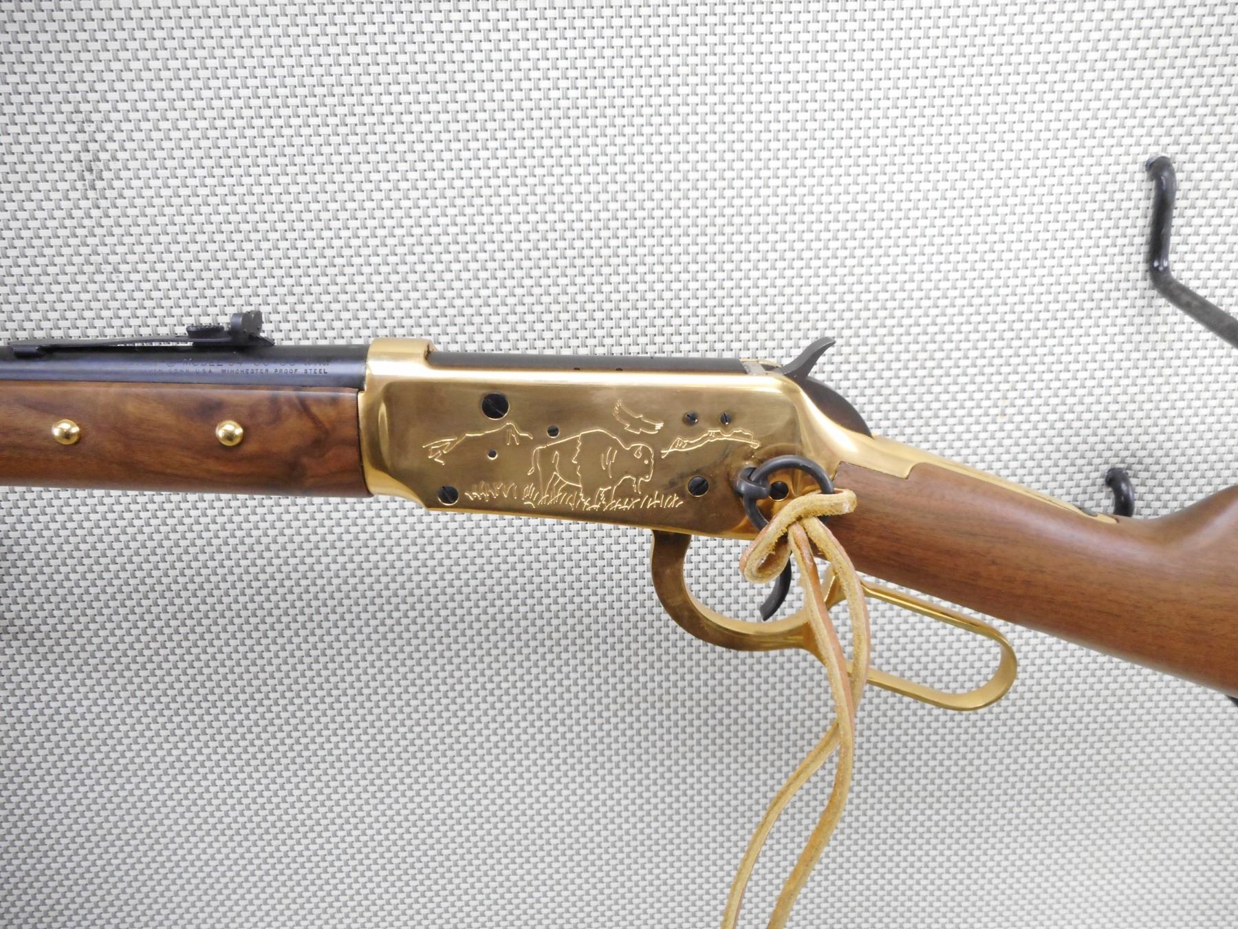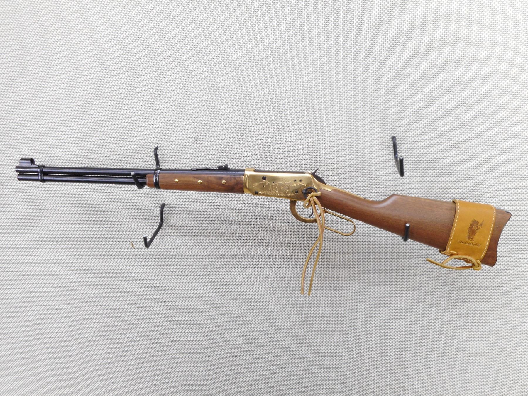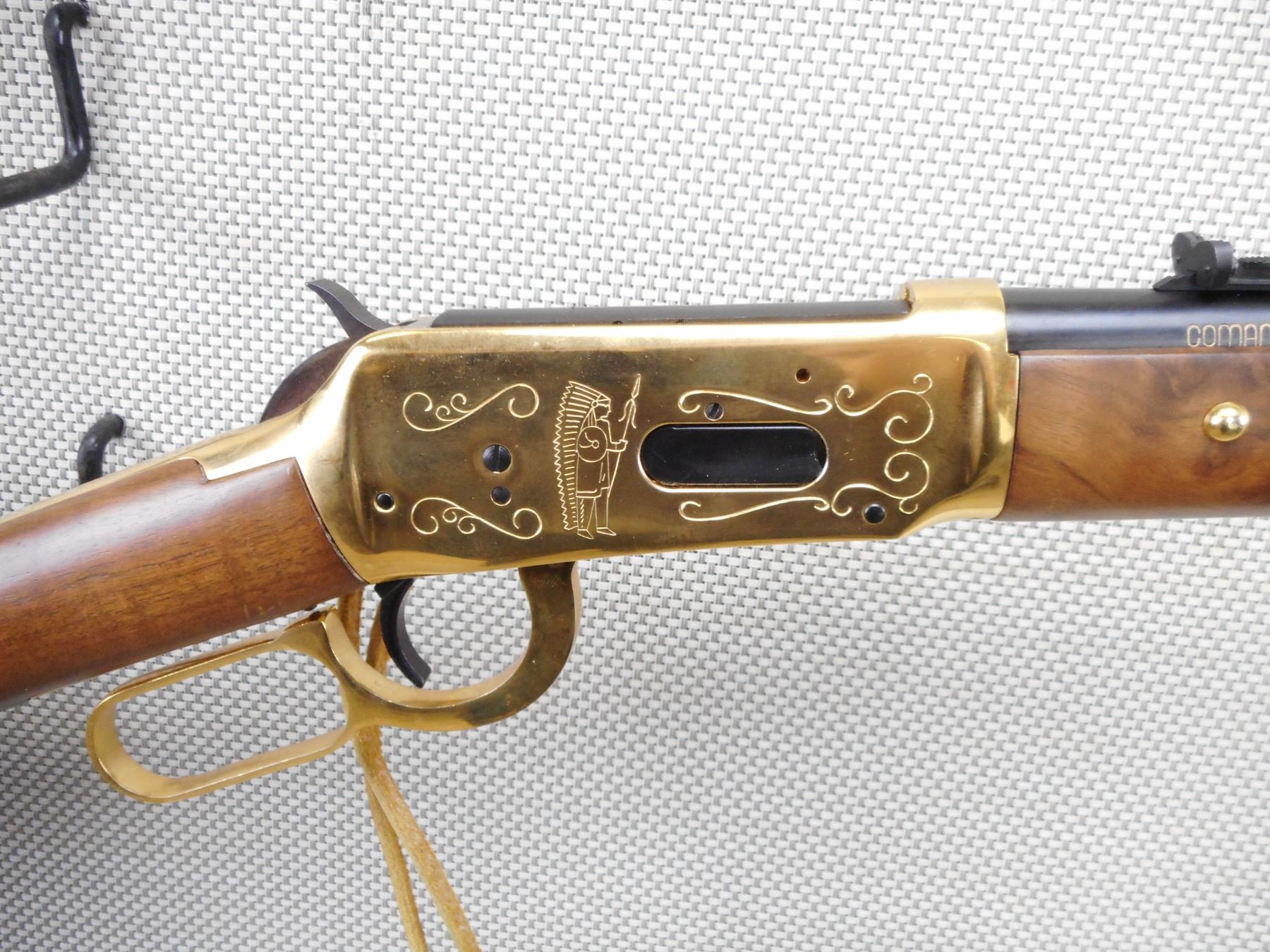 WINCHESTER , MODEL: 94 COMANCHE CARBINE , CALIBER: 30-30 WIN , COMES WITH BOX, MANUAL AND POSTER. BORE IS EXCELLENT, APPEARS AS NEW, MAY HAVE BEEN TEST FIRED. HOODED FRONT AND ADJUSTABLE REAR SIGHT. TWO PIECE HARDWOOD STOCK WITH 6 TACKS IN THE FOREND. LEATHER CARTRIDGE SLEAVE. STEEL BUTT PLATE. SADDLE RING WITH LEATHER TASSLE. SHOWS VIRTUALLY NO HANDLING MARKS. ACTION: LEVER ACTION RIFLE , BARREL LENGTH: 20" , SERIAL # CG6187 , CONDITION: AS NEW IN THE BOX , CLASS: CANADIAN NON RESTRICTED CLASS