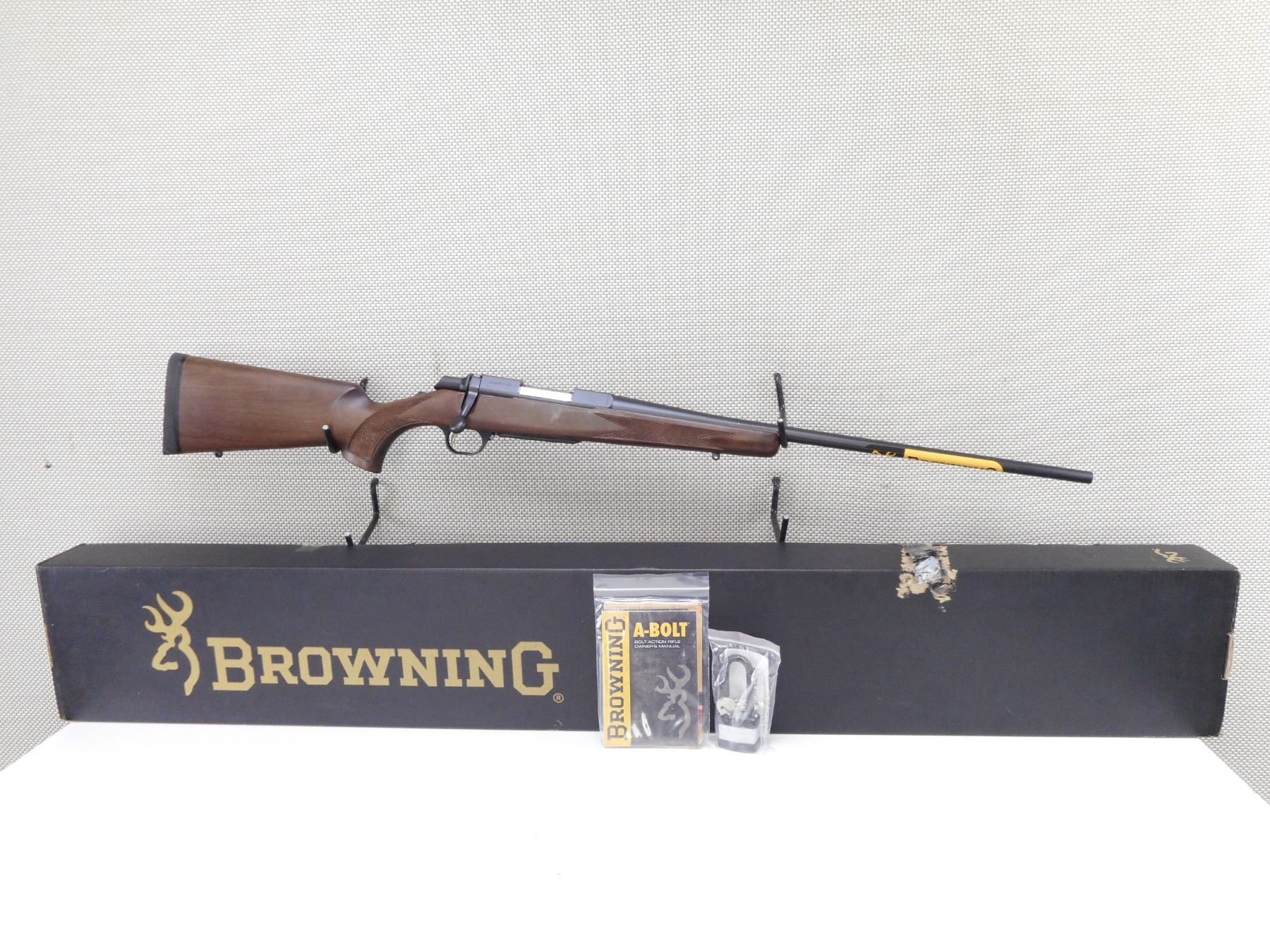 BROWNING , MODEL: A-BOLT , CALIBER: 22 HORNET , COMES WITH BOX, MAGAZINE, TRIGGER LOCK AND MANUAL. BORE IS EXCELLENT, APPEARS AS NEW, MAY HAVE BEEN TEST FIRED. NO SIGHTS. DRILLED AND TAPPED FOR SCOPE MOUNTS. CHECKERED ONE PIECE HARDWOOD STOCK WITH RUBBER RECOIL PAD. SLING SWIVEL STUDS. GOLD TRIGGER. SHOWS VIRTUALLY NO HANDLING MARKS. ACTION: BOLT ACTION RIFLE , BARREL LENGTH: 22" , SERIAL # 88455ZY351 , CONDITION: AS NEW IN BOX , CLASS: CANADIAN NON RESTRICTED CLASS