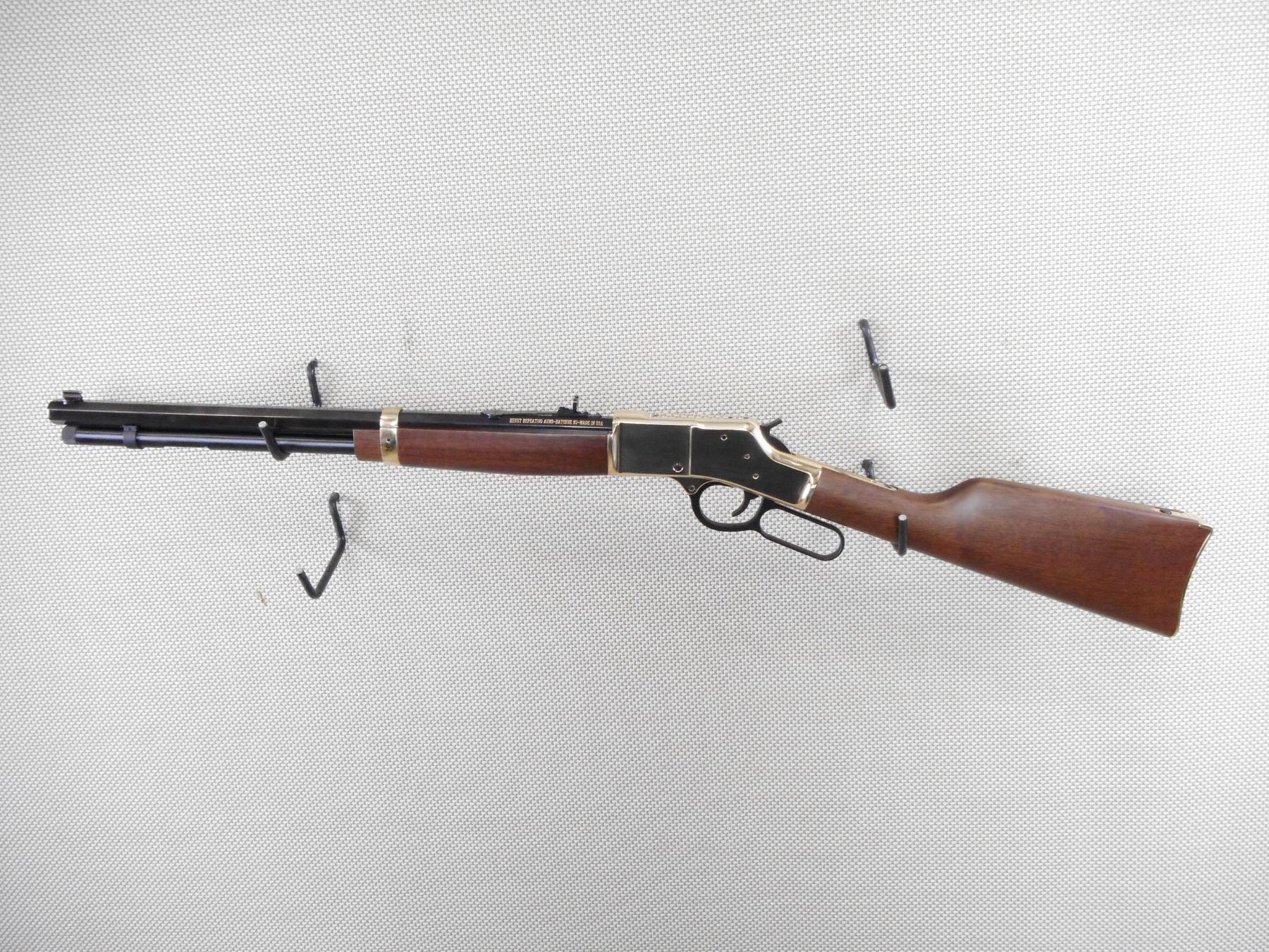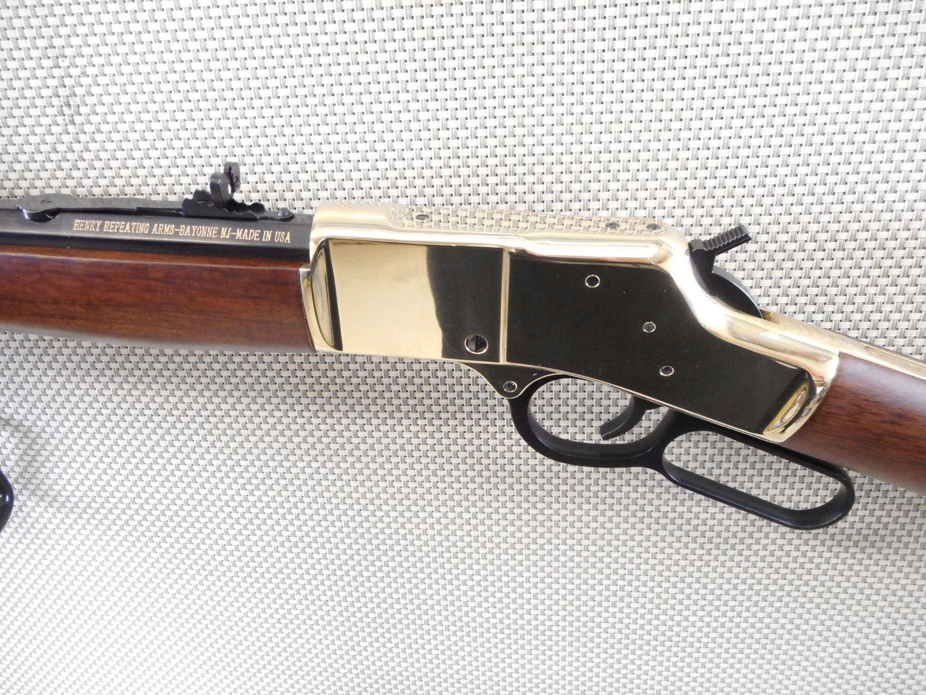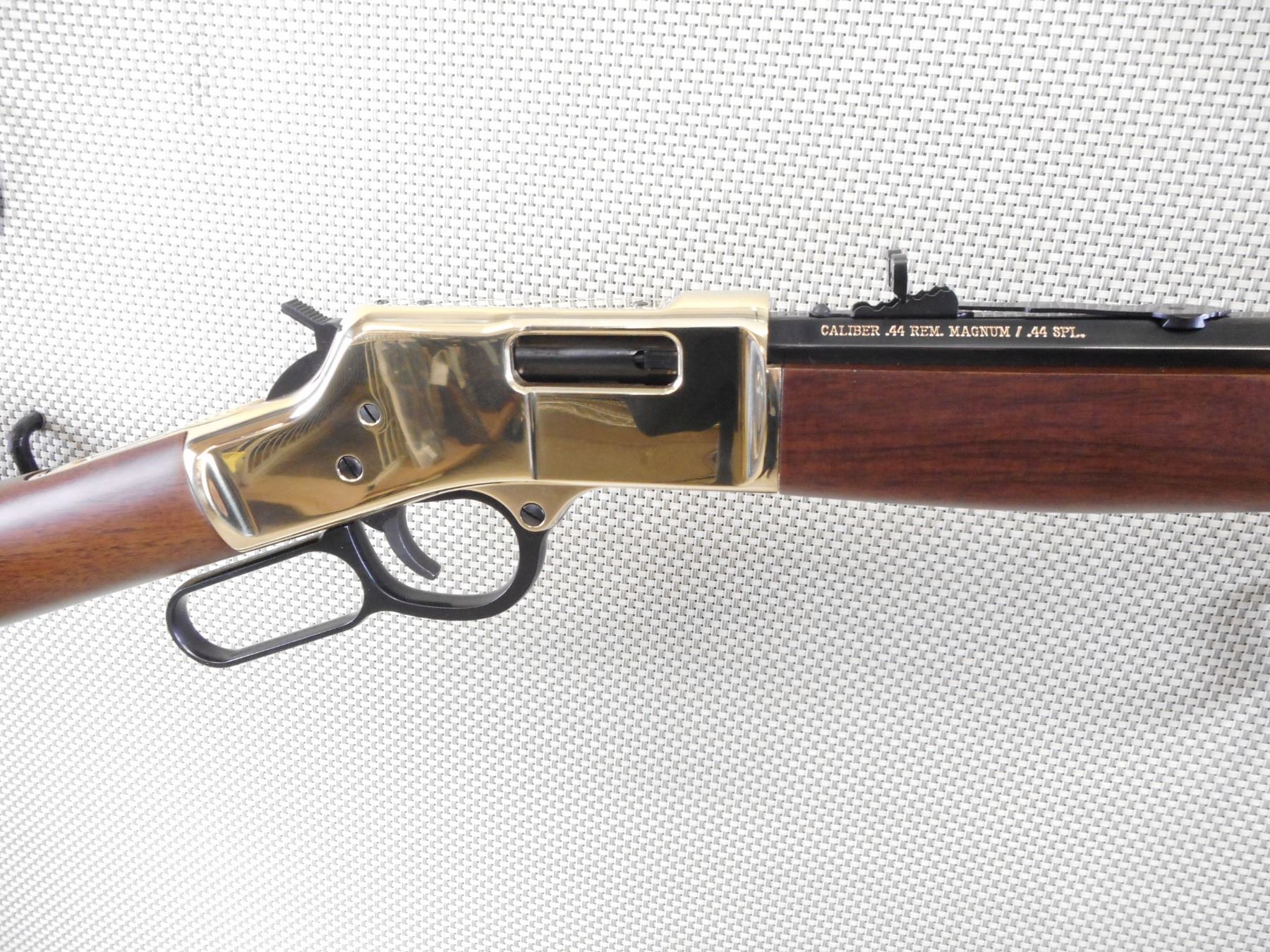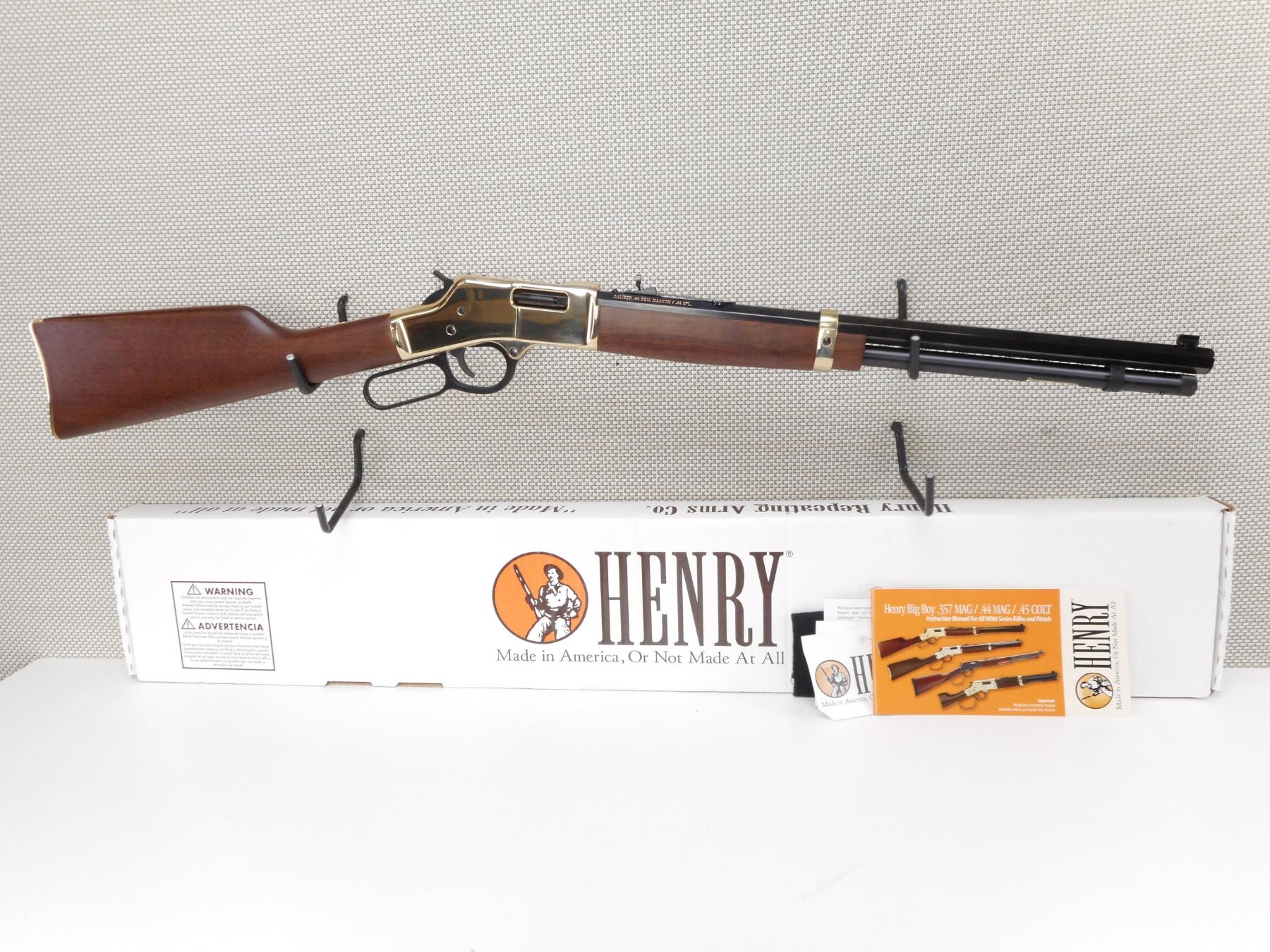 HENRY REPEATING ARMS , MODEL: HENRY BIG BOY H006 , CALIBER: 44 REM MAG , COMES WITH BOX, MANUAL, CLEANING CLOTH. BORE IS EXCELLENT, APPEARS AS NEW, MAY HAVE BEEN TEST FIRED. BLADE FRONT AND ADJUSTABLE REAR SIGHT. TWO PIECE HARDWOOD STOCK WITH BRASS BARREL BAND, RECEIVER, AND BUTT PLATE. DRILLED AND TAPPED FOR SCOPE MOUNTS. SHOWS VIRTUALLY NO HANDLING MARKS. ACTION: LEVER ACTION RIFLE , BARREL LENGTH: 20" , SERIAL # BB0118909 , CONDITION: AS NEW IN BOX , CLASS: CANADIAN NON RESTRICTED CLASS