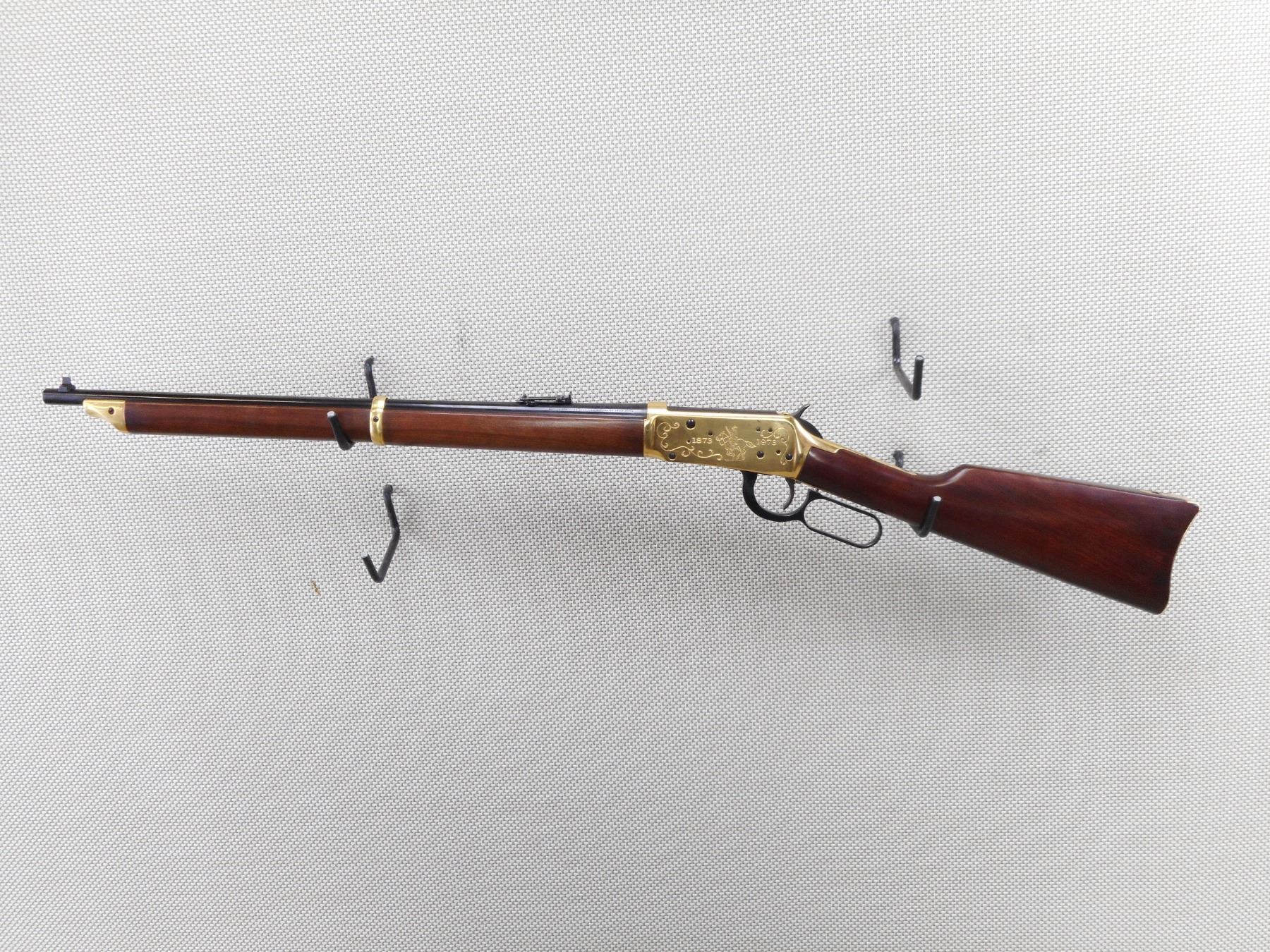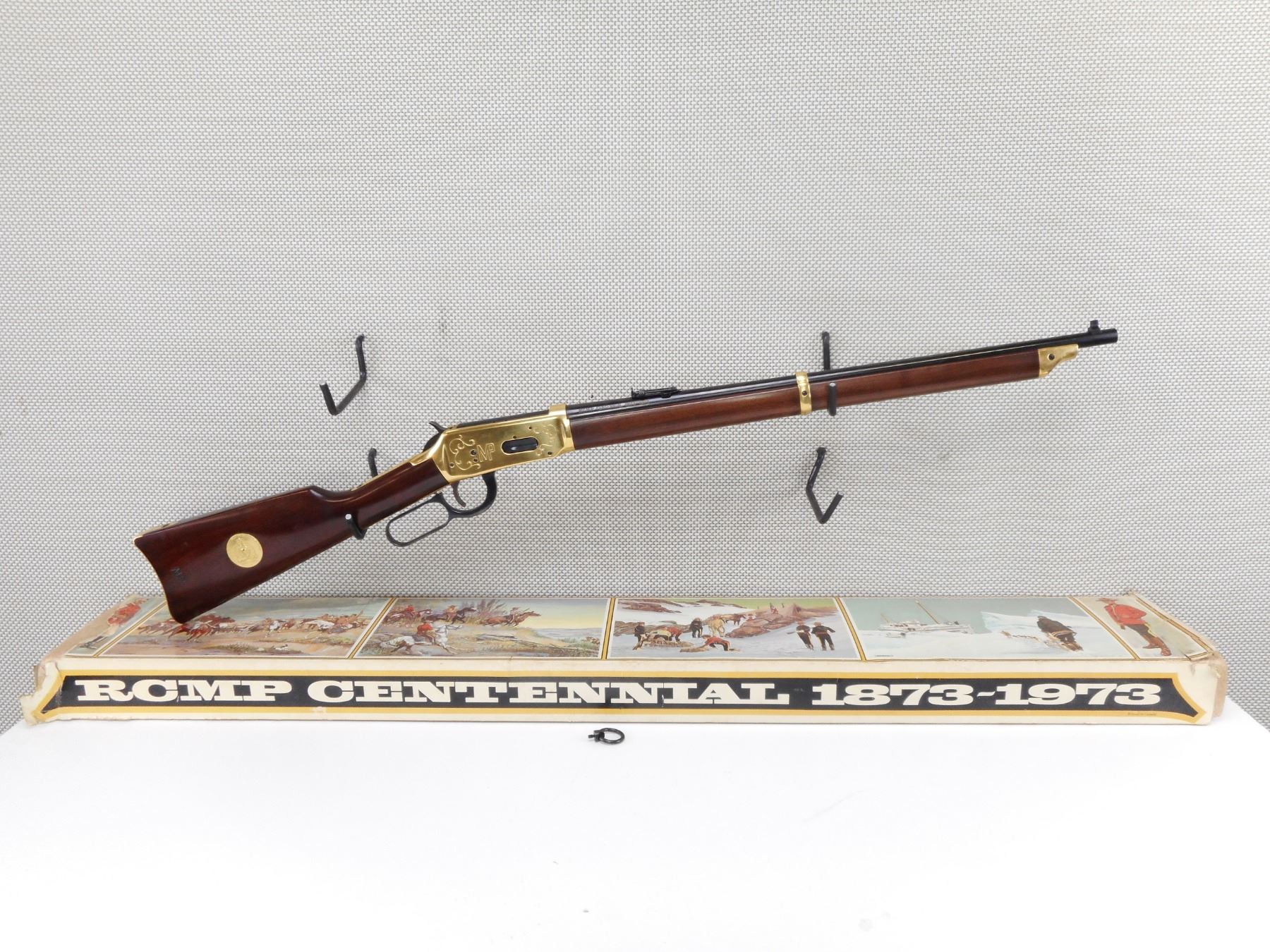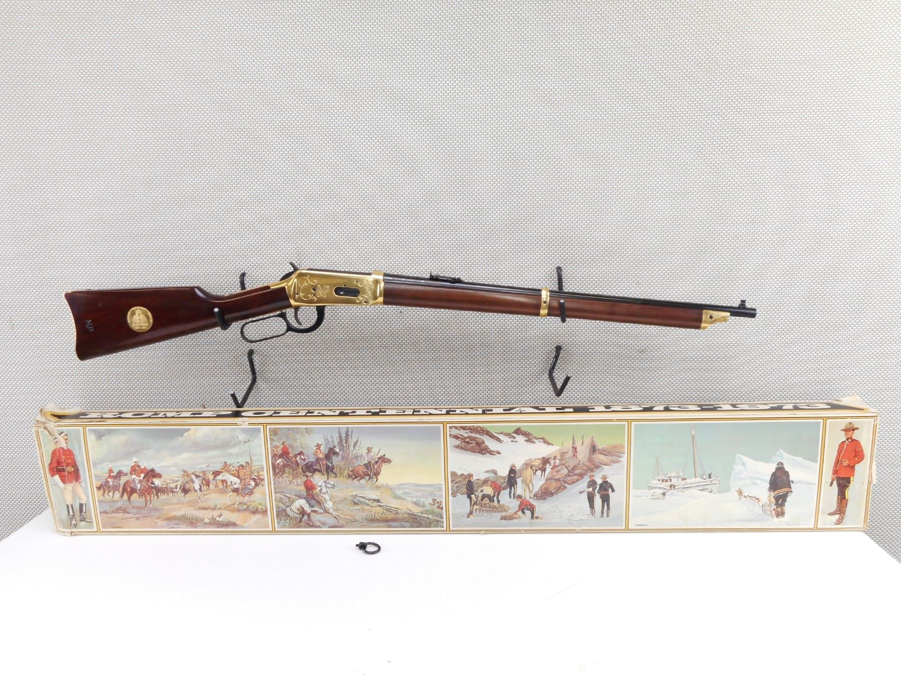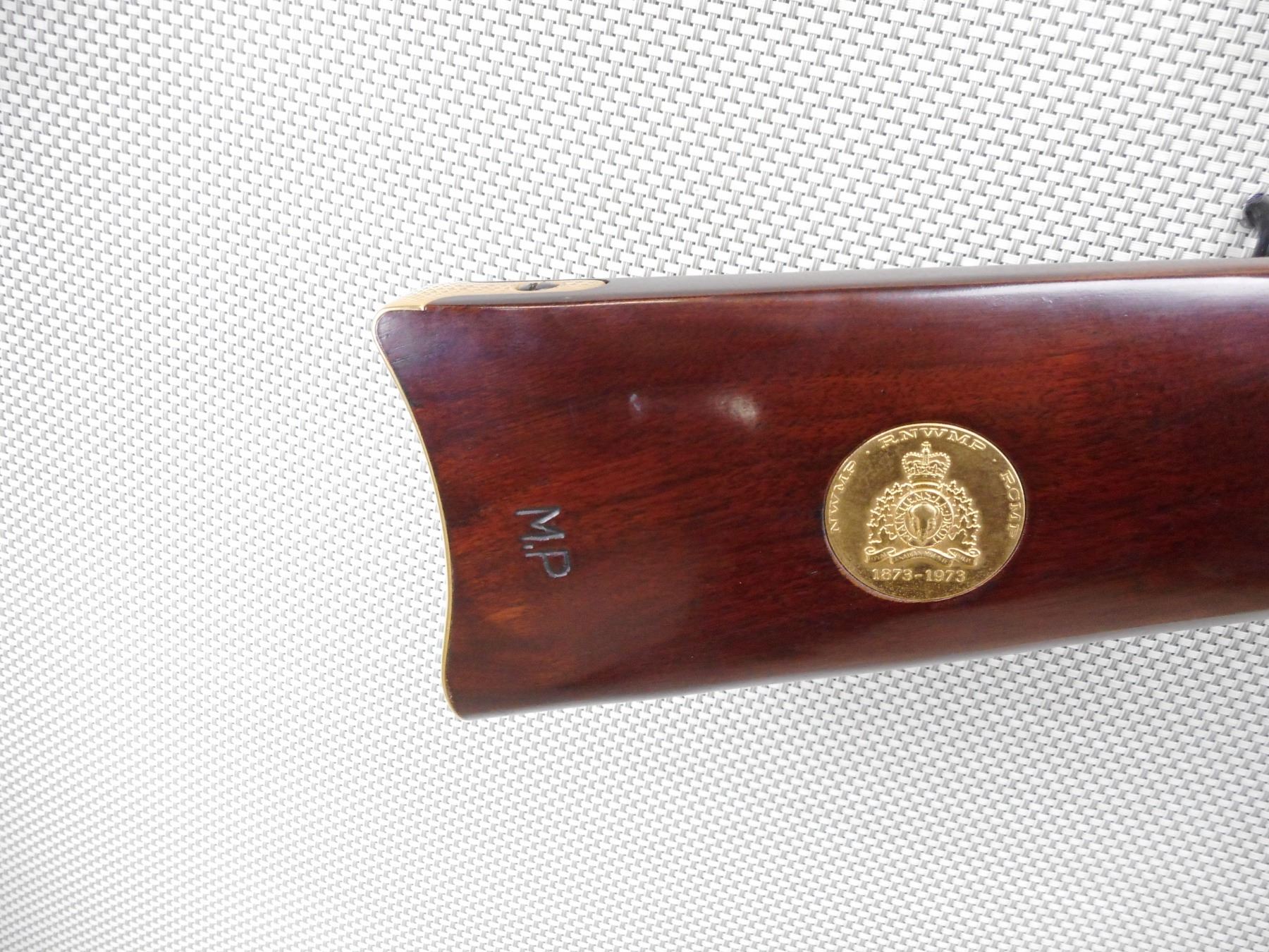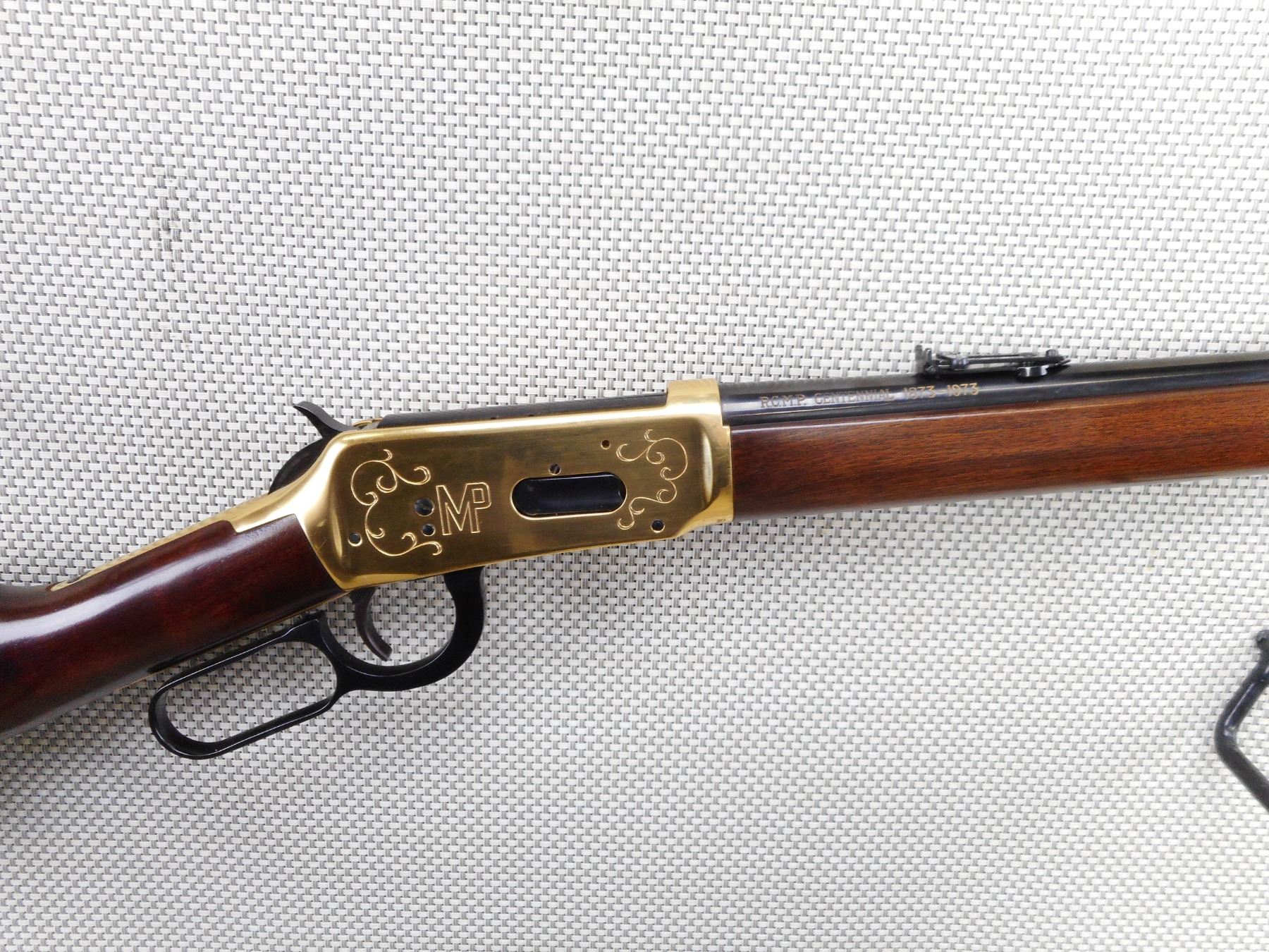 WINCHESTER , MODEL: 1894 RCMP COMMEMORATIVE , CALIBER: 30-30 WIN , COMES WITH BOX (DAMAGED). BORE IS EXCELLENT, APPEARS AS NEW, MAY HAVE BEEN TEST FIRED. BLADE FRONT SIGHT AND ADJUSTABLE REAR SIGHT. GOLD FOREND CAP, BARREL BAND, RECEIVER AND BUTT PLATE. TWO PIECE HARDWOOD STOCK. SADDLE RING. SHOWS VIRTUALLY NO HANLDING MARKS. ACTION: LEVER ACTION RIFLE , BARREL LENGTH: 22" , SERIAL # RCMP4894 , CONDITION: AS NEW IN BOX , CLASS: CANADIAN NON RESTRICTED CLASS