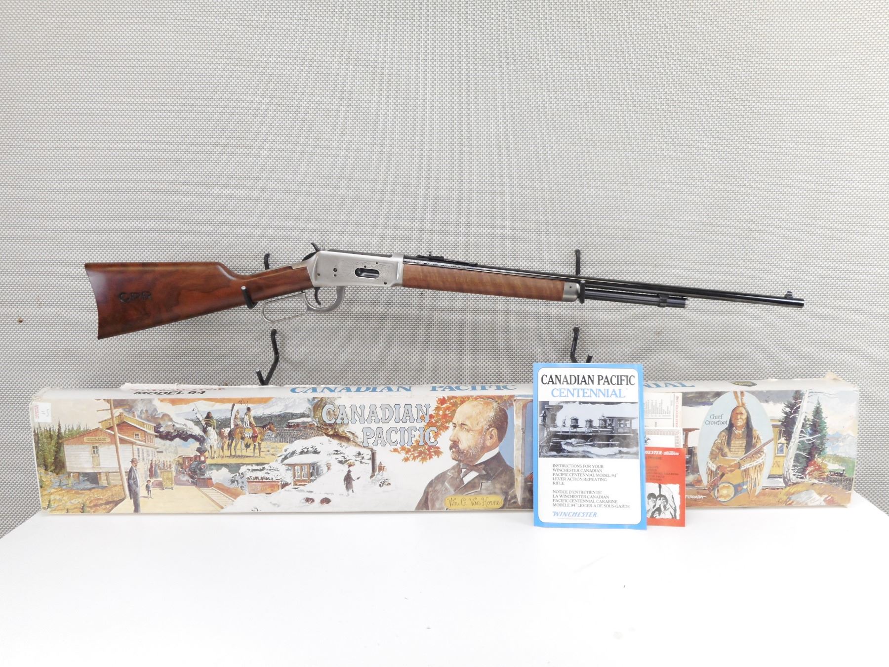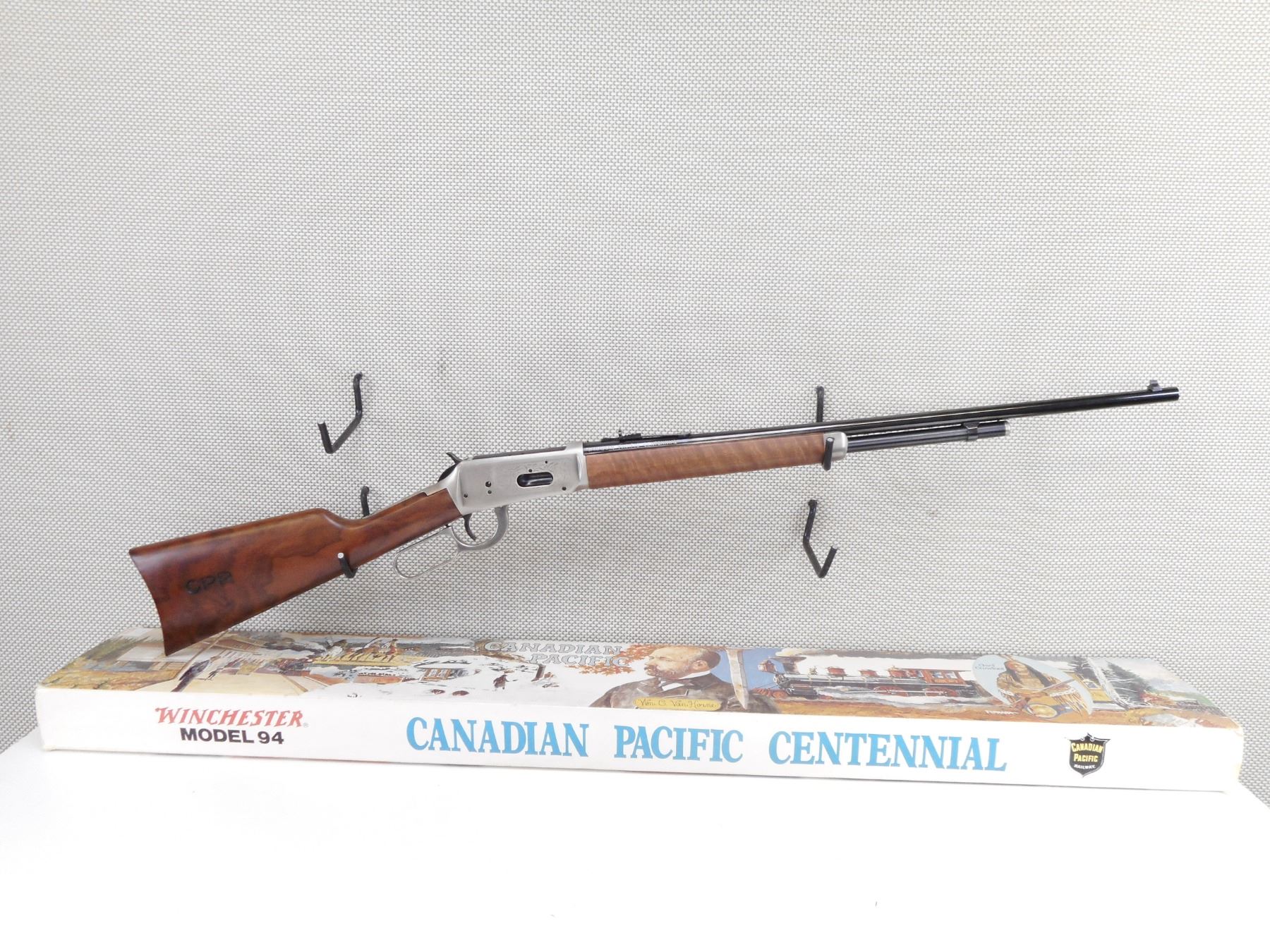 WINCHESTER , MODEL: 94 CANADIAN PACIFIC RAILWAY CENTENNIAL , CALIBER: 32 WIN SPECIAL , COMES WITH BOX (DAMAGED), AND PAPERWORK. BORE IS EXCELLENT, APPEARS AS NEW, MAY HAVE BEEN TEST FIRED. BLADE FRONT AND ADJUSTABLE REAR SIGHTS. TWO PIECE HARDWOOD STOCK WITH STEEL BUTT PLATE. ENGRAVED RECEIVER WITH CPR LOGO. SADDLE RING. SHOWS VIRTUALLY NO HANDLING MARKS. ACTION: LEVER ACTION , BARREL LENGTH: 24" , SERIAL # CPC466 , CONDITION: AS NEW IN BOX , CLASS: CANADIAN NON RESTRICTED CLASS