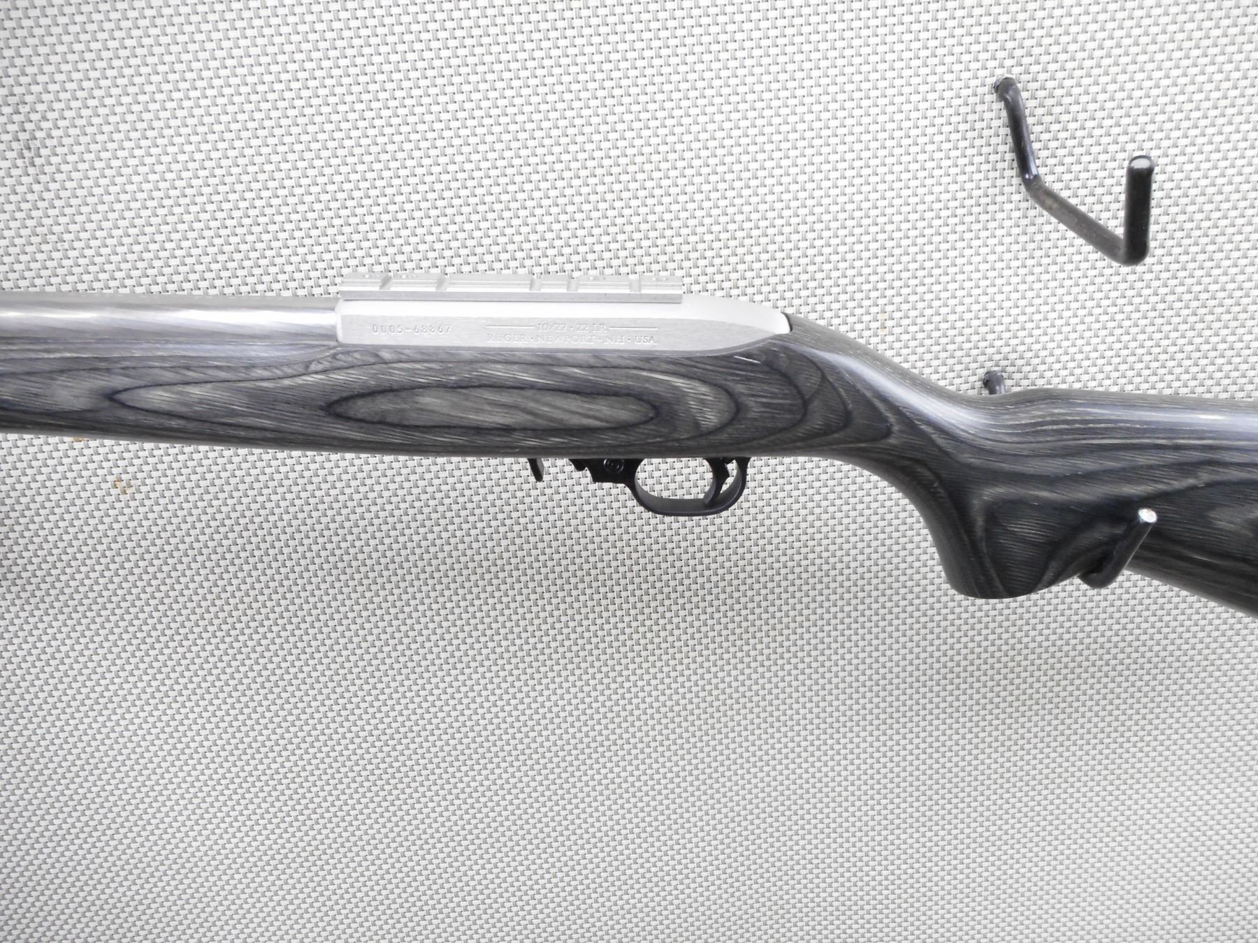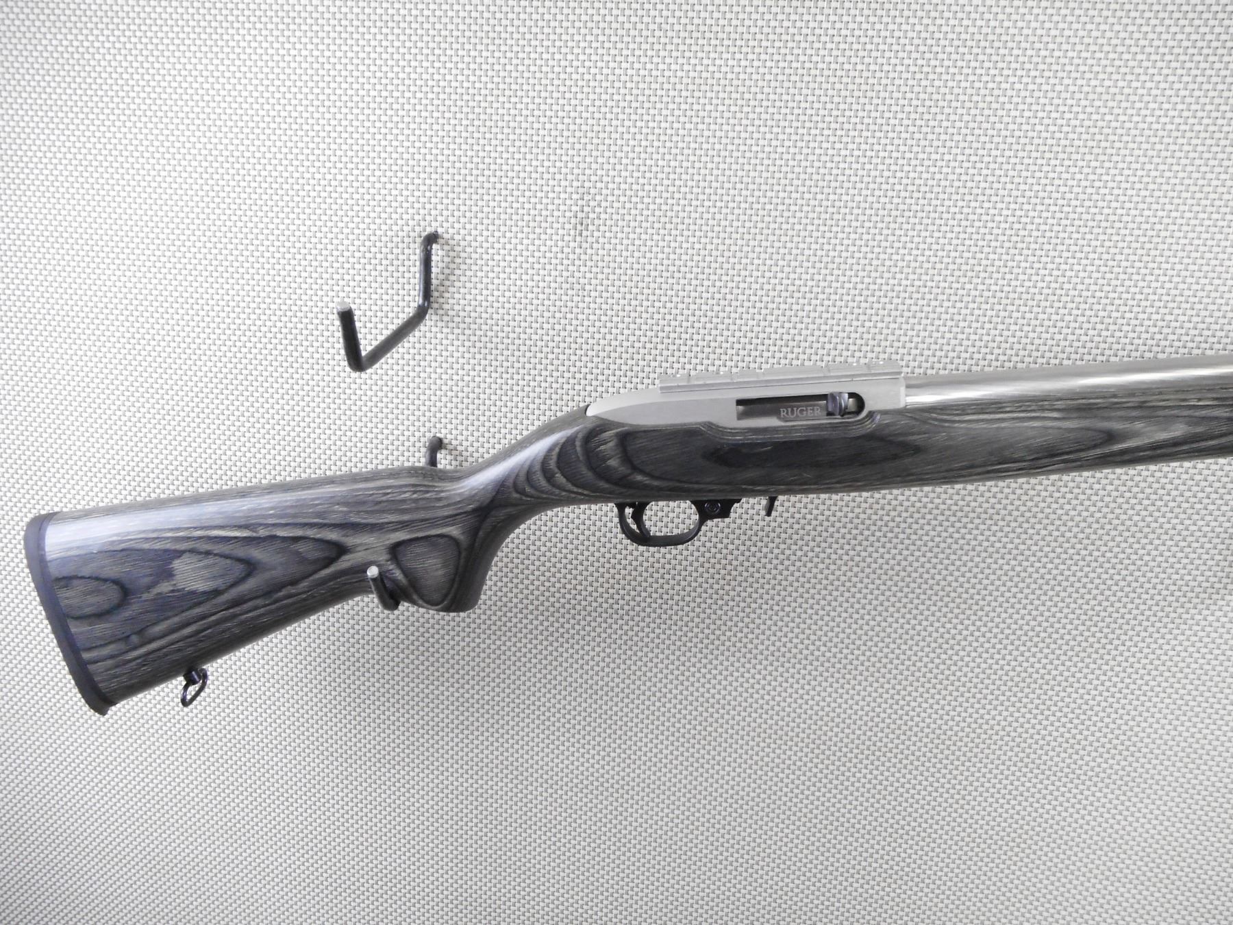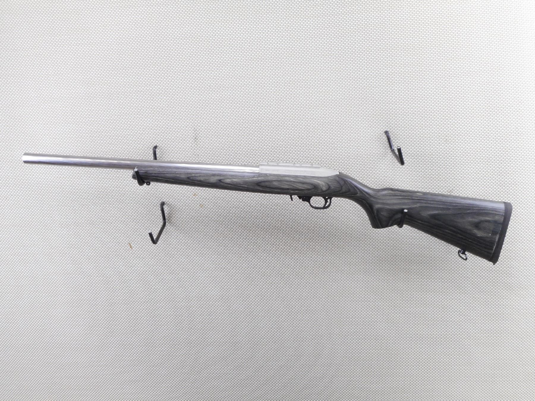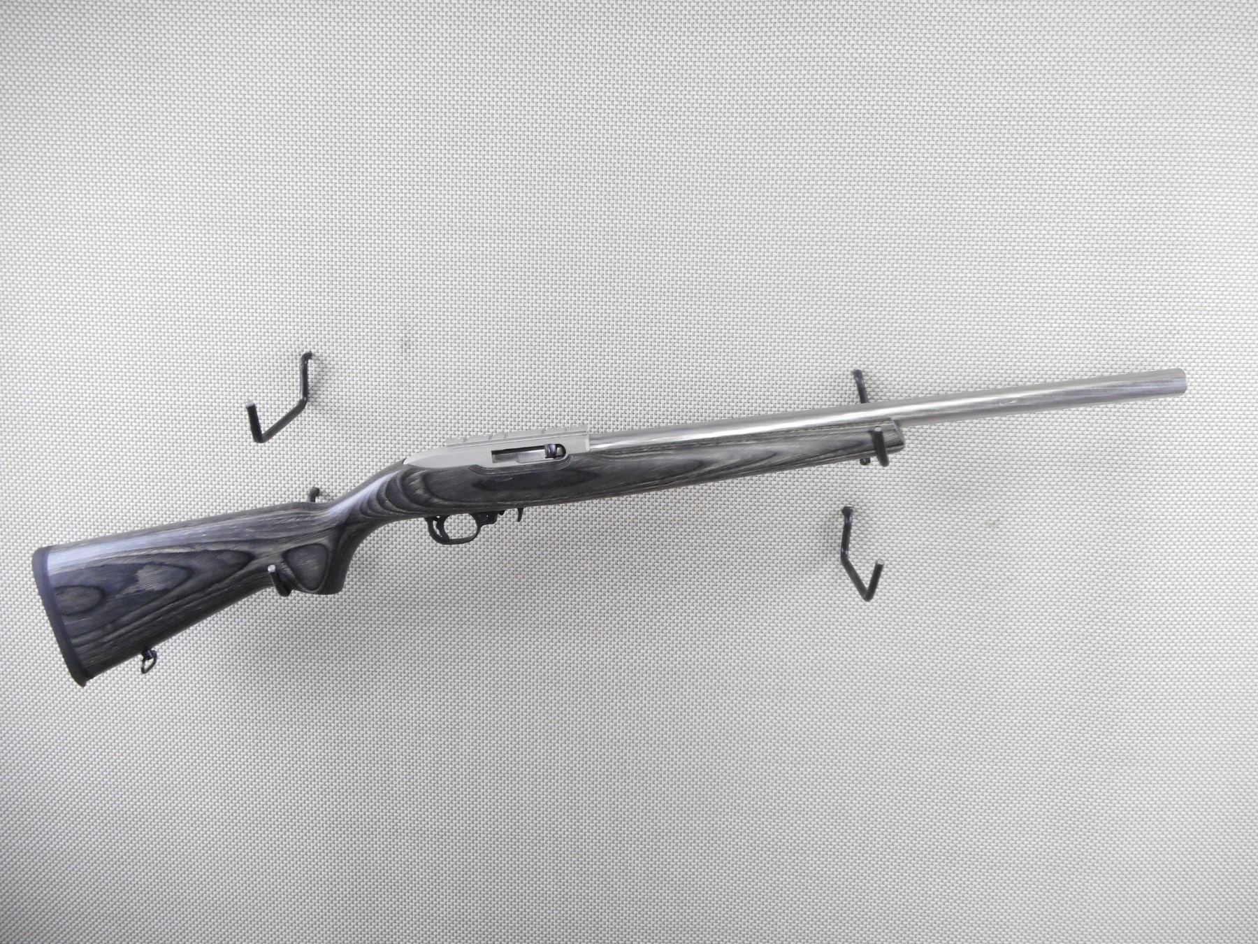 RUGER , MODEL: 10/22 TARGET , CALIBER: 22 LR , COMES WITH MAGAZINE. BORE IS EXCELLENT. NO SIGHTS. DRILLED AND TAPPED WITH A SCOPE RAIL. FLUTED HEAVY BARREL. ONE PIECE GREY LAMINATED HARDWOOD STOCK WITH RUBBER RECOIL PAD. FRONT SLING SWIVEL STUDS, REAR SLING SWIVEL LOOP. SHOWS VERY LITTLE HANDING MARKS. ACTION: SEMI AUTOMATIC RIFLE , BARREL LENGTH: 19 1/2" , SERIAL # 000568867 , CONDITION: 8/10 , CLASS: CANADIAN NON RESTRICTED CLASS
