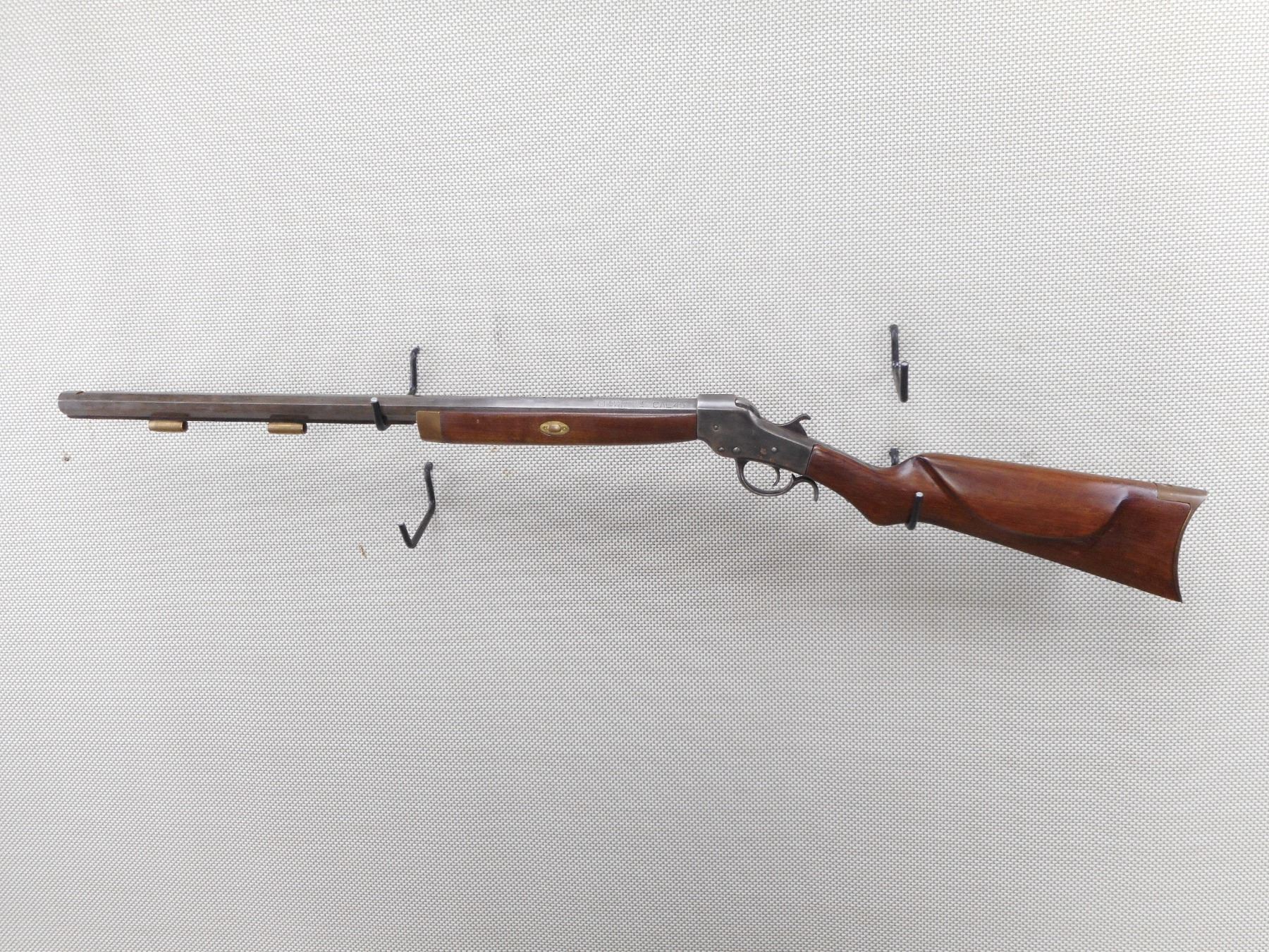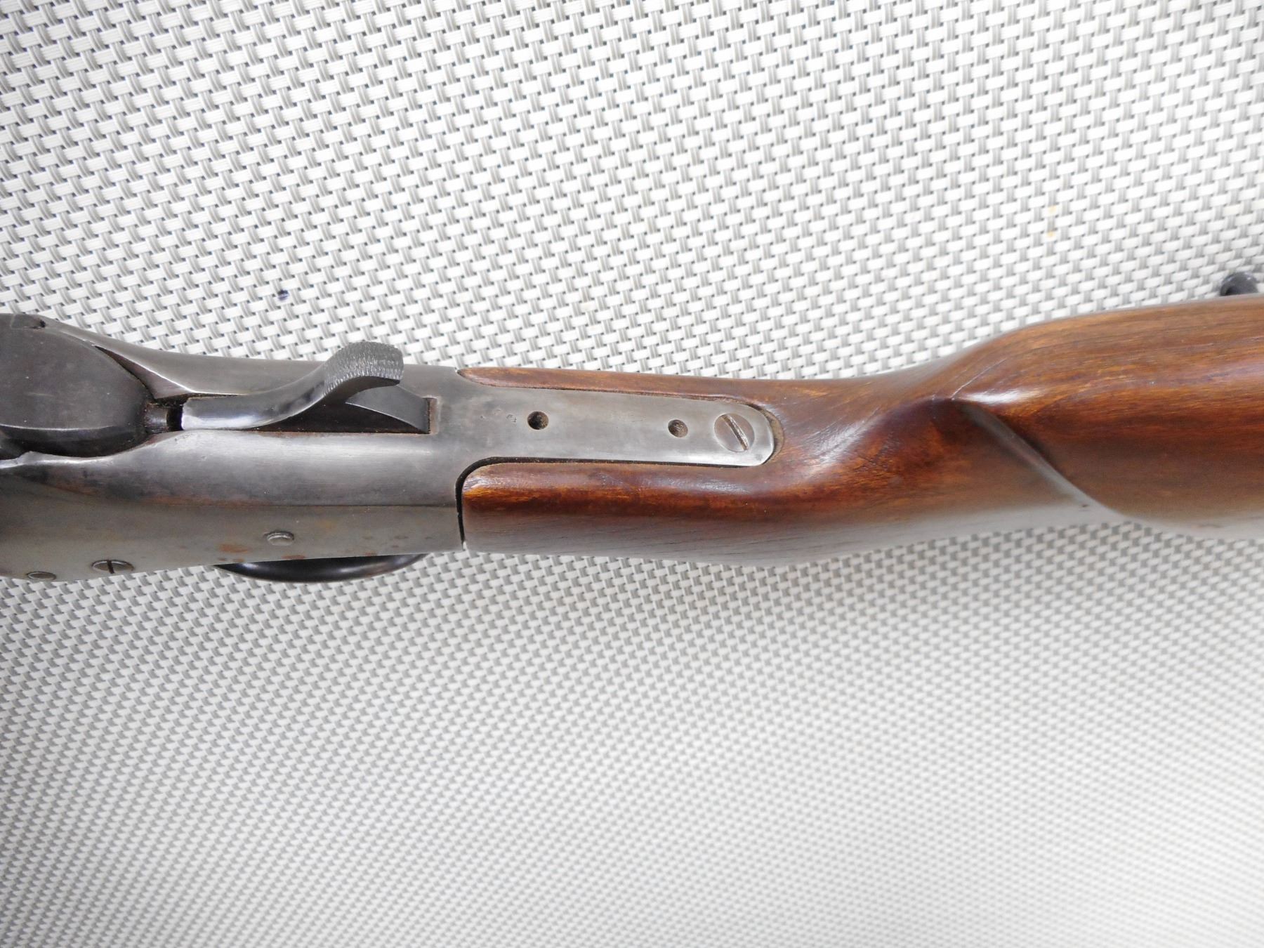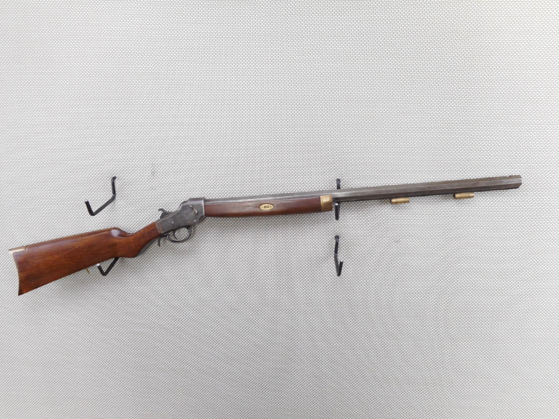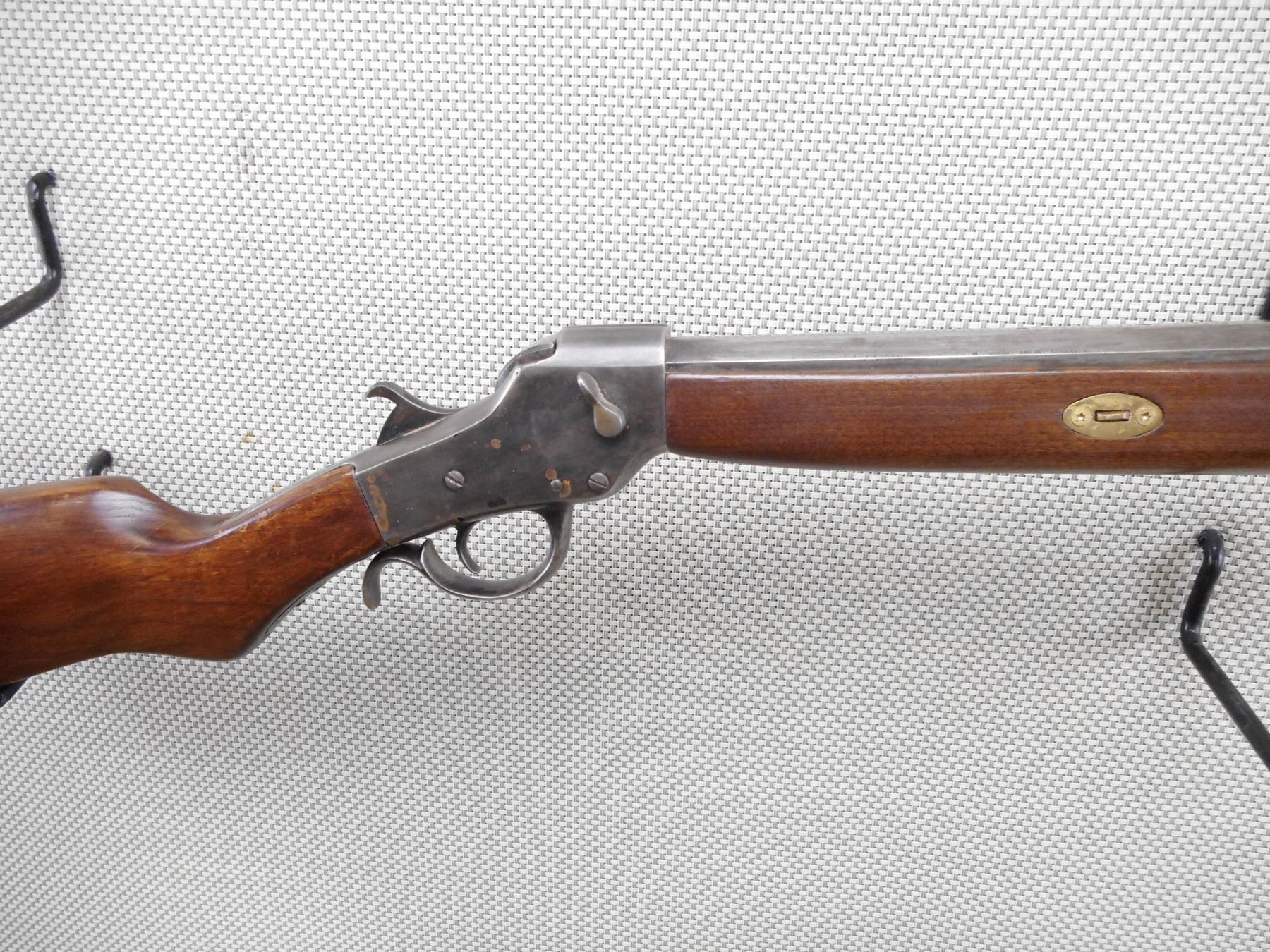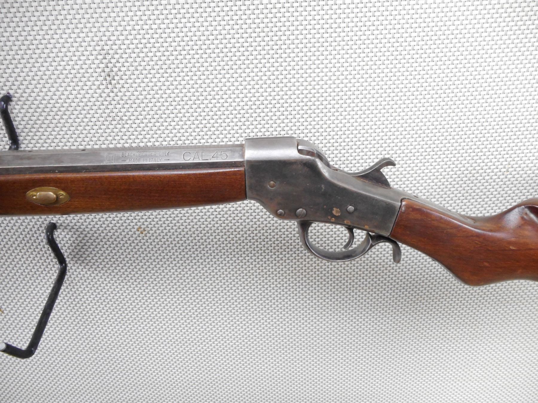 INVESTARMS , MODEL: SINGLE SHOT , CALIBER: 45 CAL PERC , BORE IS FAIR. NO SIGHTS ON AN OCTAGONAL BARREL. TWO PIECE HARDWOOD STOCK WITH BRASS FOREND CAP, CRESENT BUTT PLATE. SOME LIGHT SURFACE RUST. SHOWS SOME HANDLING MARKS. MISSING THE RAM ROD. FOREND IS LOOSE. ACTION: SINGLE SHOT MUZZLE LOADER , BARREL LENGTH: 26" , SERIAL # N/A , CONDITION: 5/10 , CLASS: CANADIAN NON RESTRICTED CLASS