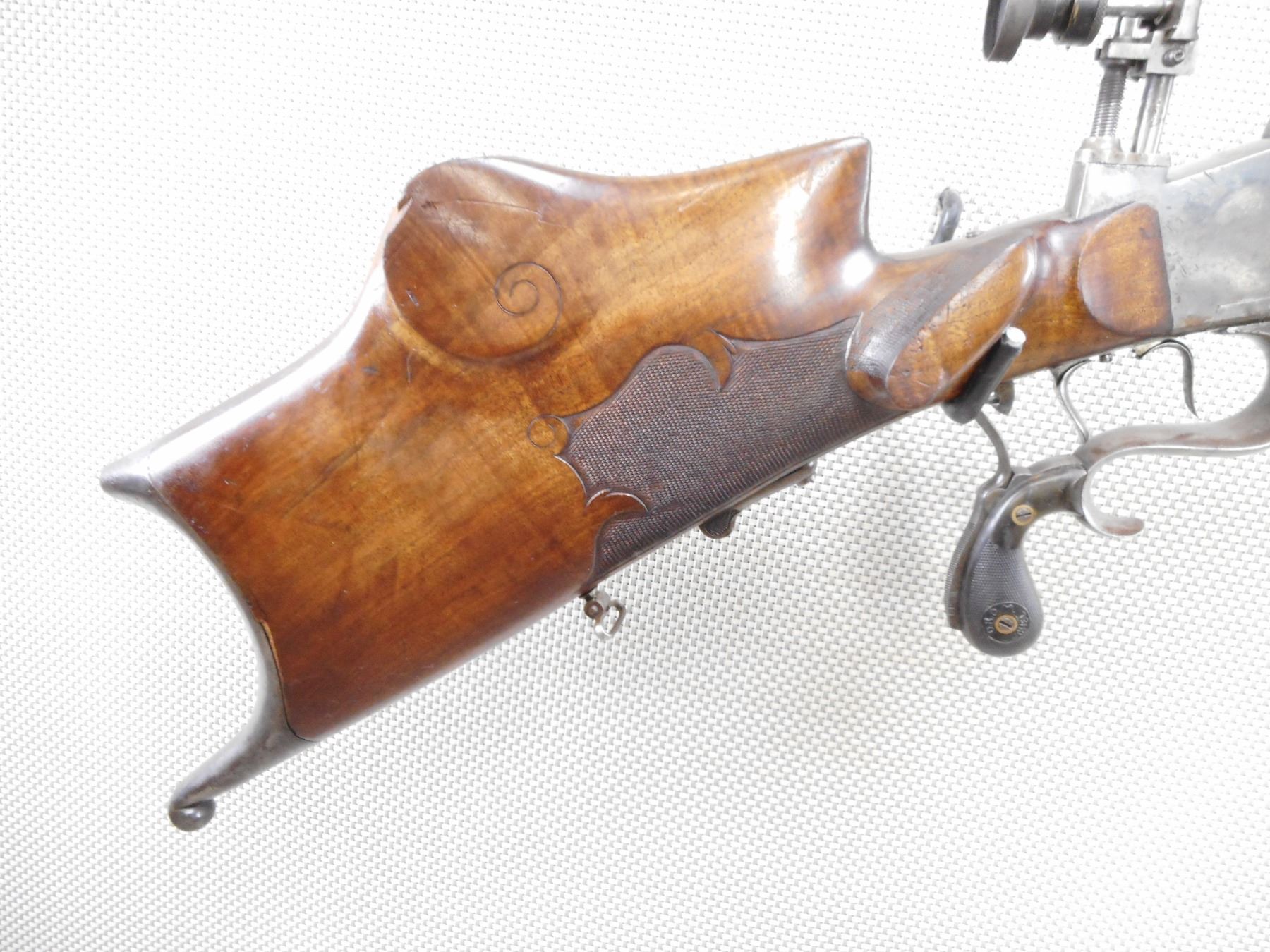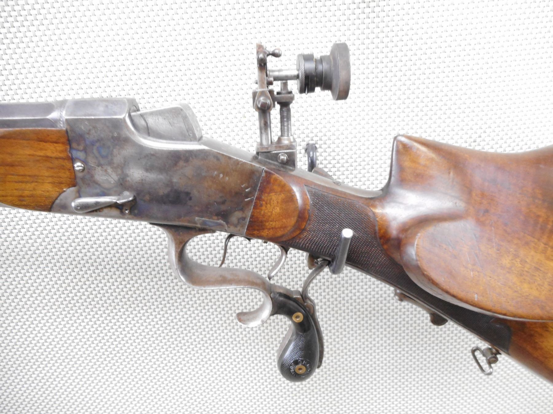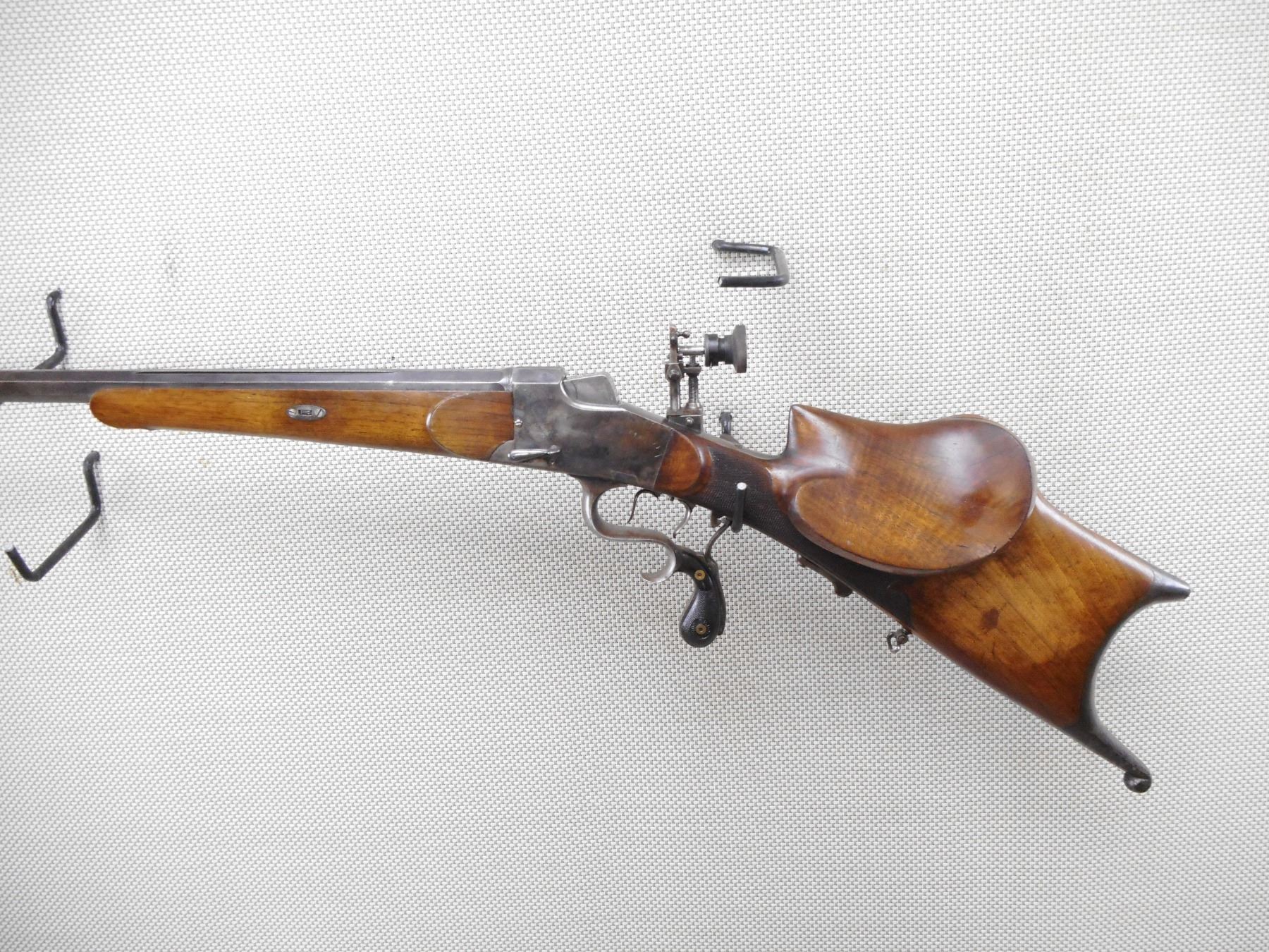 RARE, UNKNOWN GERMAN , MODEL: SINGLE SHOT SCHUTZEN , CALIBER: 8.15 X 46R , BORE IS VERY GOOD. SHROUDED FRONT SIGHT AND ADJUSTABLE PEEP REAR SIGHT. TWO PIECE HARDWOOD STOCK WITH FANCY SCHUTZEN BUTT. OCTAGONAL BARREL. RICHLY CASE HARDENED RECEIVER. MARKED DRGM ON NUMEROUS PARTS? SLING SWIVEL STUD ON THE FRONT OF THE BARREL WITH A LOOP ON THE BUTT STOCK. VERY FANCY CHEEK PIECE. SHOWS SOME HANDLING MARKS. ACTION: FALLING BLOCK , BARREL LENGTH: 31 1/2" , SERIAL # N/A , CONDITION: 6/10 , CLASS: CANADIAN NON RESTRICTED CLASS