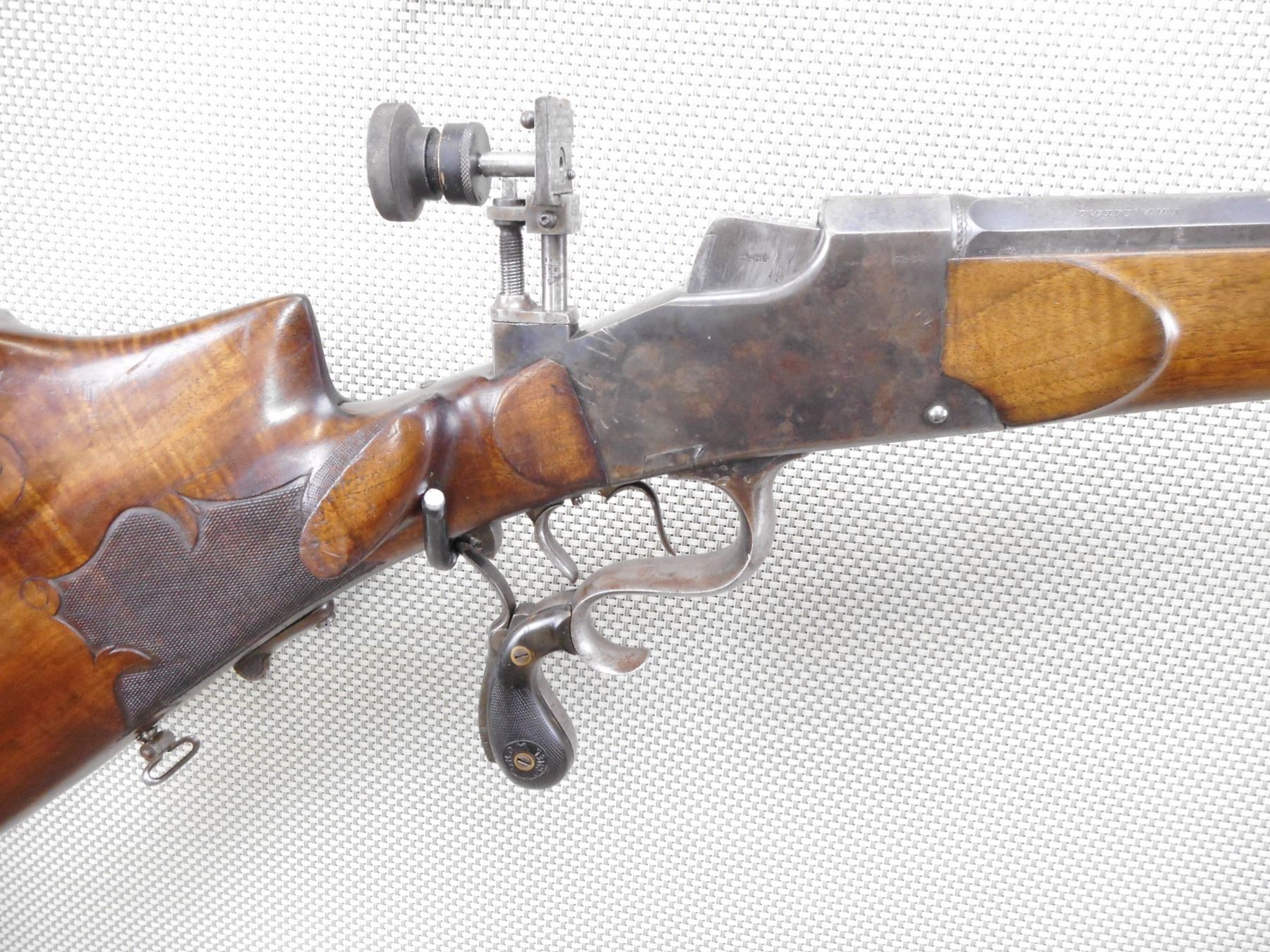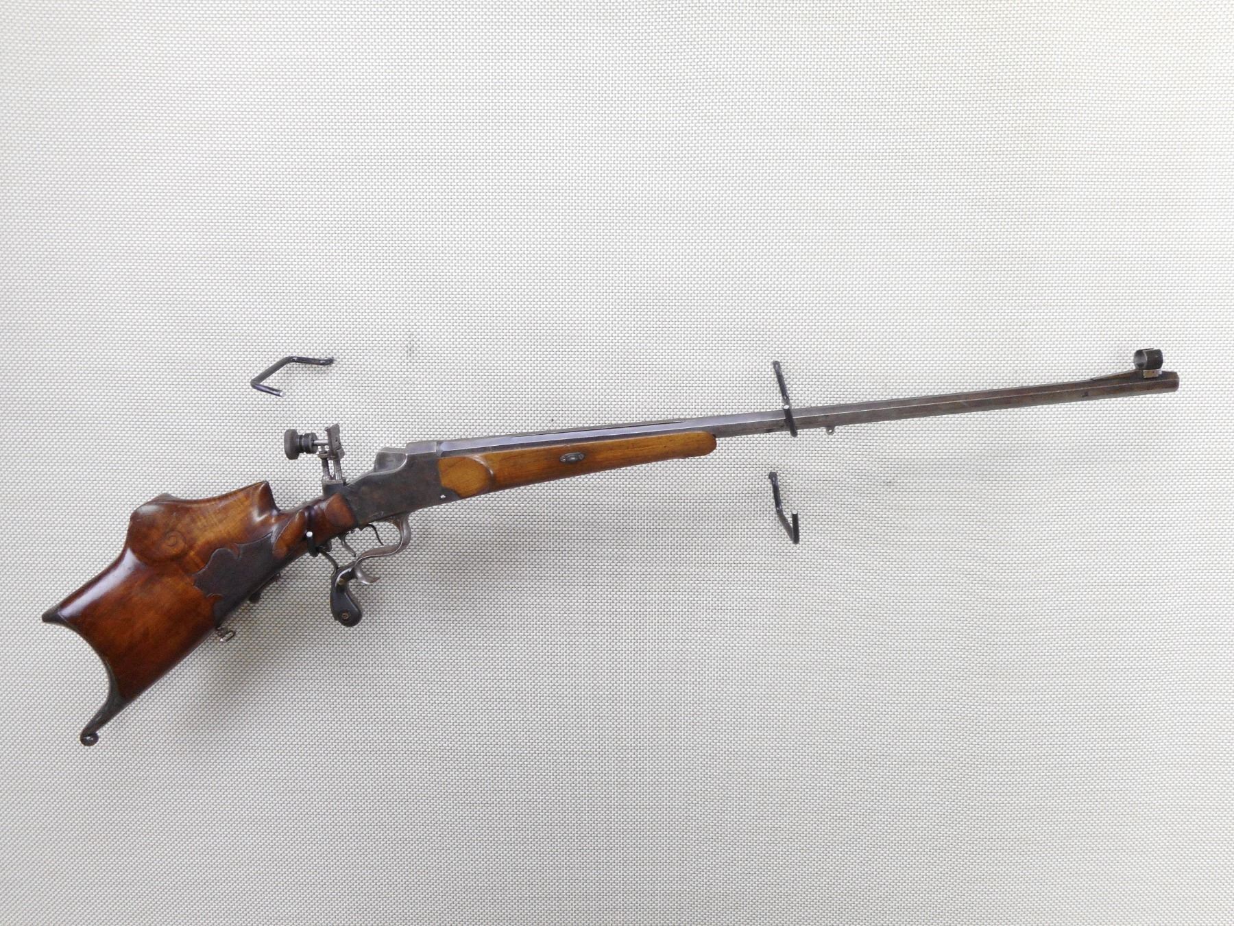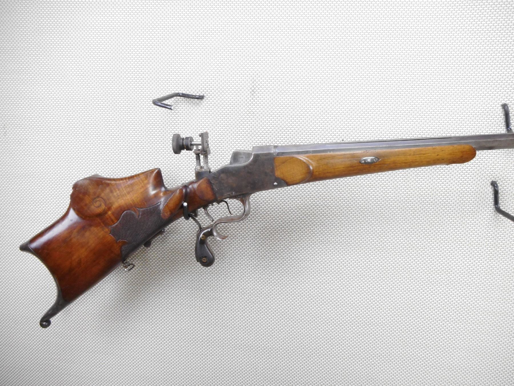 RARE, UNKNOWN GERMAN , MODEL: SINGLE SHOT SCHUTZEN , CALIBER: 8.15 X 46R , BORE IS VERY GOOD. SHROUDED FRONT SIGHT AND ADJUSTABLE PEEP REAR SIGHT. TWO PIECE HARDWOOD STOCK WITH FANCY SCHUTZEN BUTT. OCTAGONAL BARREL. RICHLY CASE HARDENED RECEIVER. MARKED DRGM ON NUMEROUS PARTS? SLING SWIVEL STUD ON THE FRONT OF THE BARREL WITH A LOOP ON THE BUTT STOCK. VERY FANCY CHEEK PIECE. SHOWS SOME HANDLING MARKS. ACTION: FALLING BLOCK , BARREL LENGTH: 31 1/2" , SERIAL # N/A , CONDITION: 6/10 , CLASS: CANADIAN NON RESTRICTED CLASS