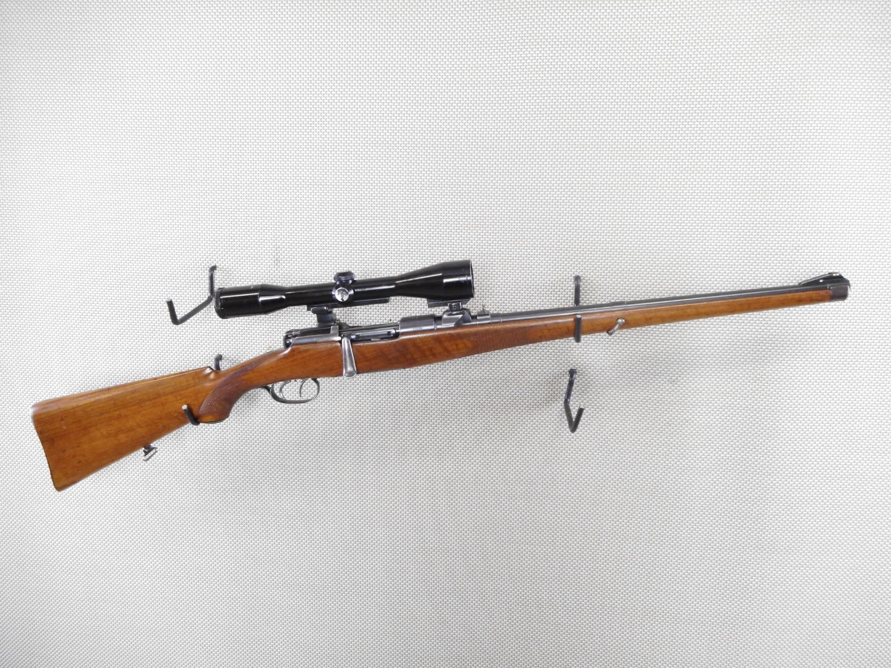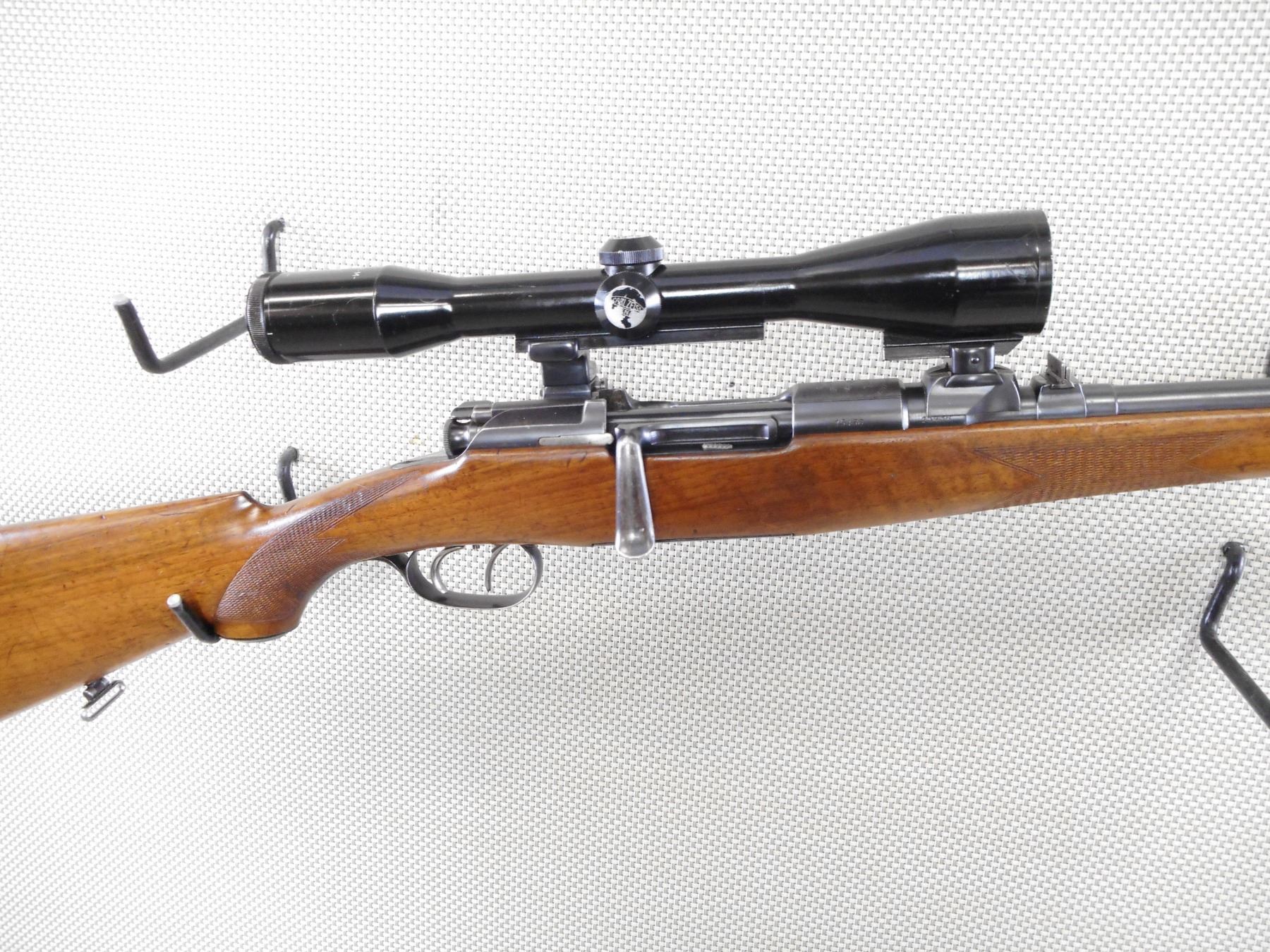 MANNLICHER SCHOENAUER , MODEL: M1908 , CALIBER: 8 X 56 MS , BORE IS VERY GOOD. RAMP FRONT AND EXPRESS REAR SIGHTS. FEATURES A ZF 6 X 42M SCOPE WITH CLAW MOUNTS. FULL LENGTH MANNLICHER STOCK WITH RAISED CHEEK PIECE AND STEEL BUTT PLATE. BUTTER KNIFE BOLT HANDLE. SET TRIGGERS. SLING LOOPS. SHOWS SOME HANDLING MARKS.ACTION: BOLT ACTION RIFLE, BARREL LENGTH: 20", SERIAL # 15436, CONDITION: 7/10, CLASS: CANADIAN NON RESTRICTED CLASS