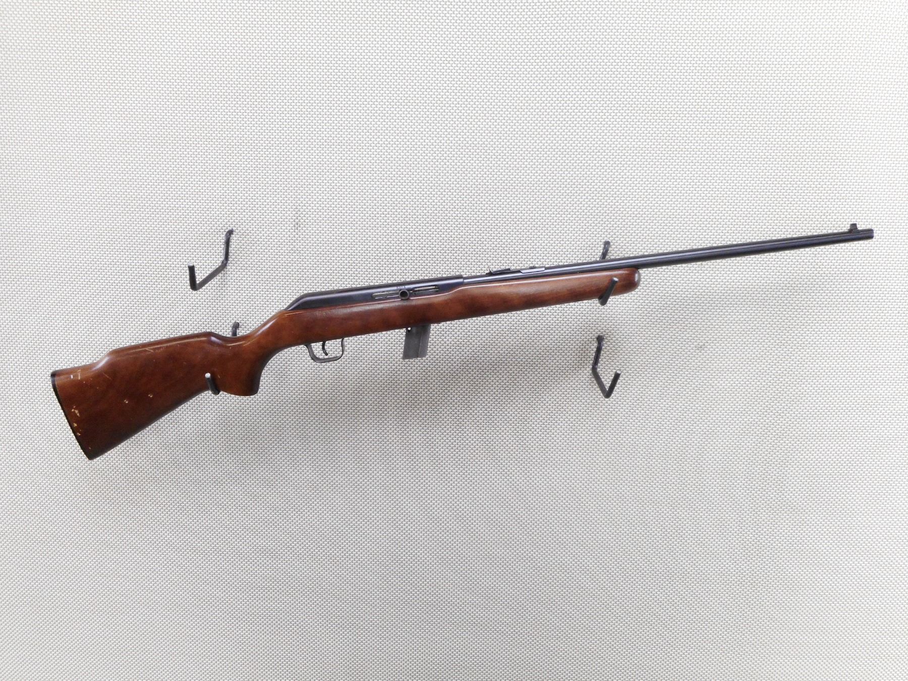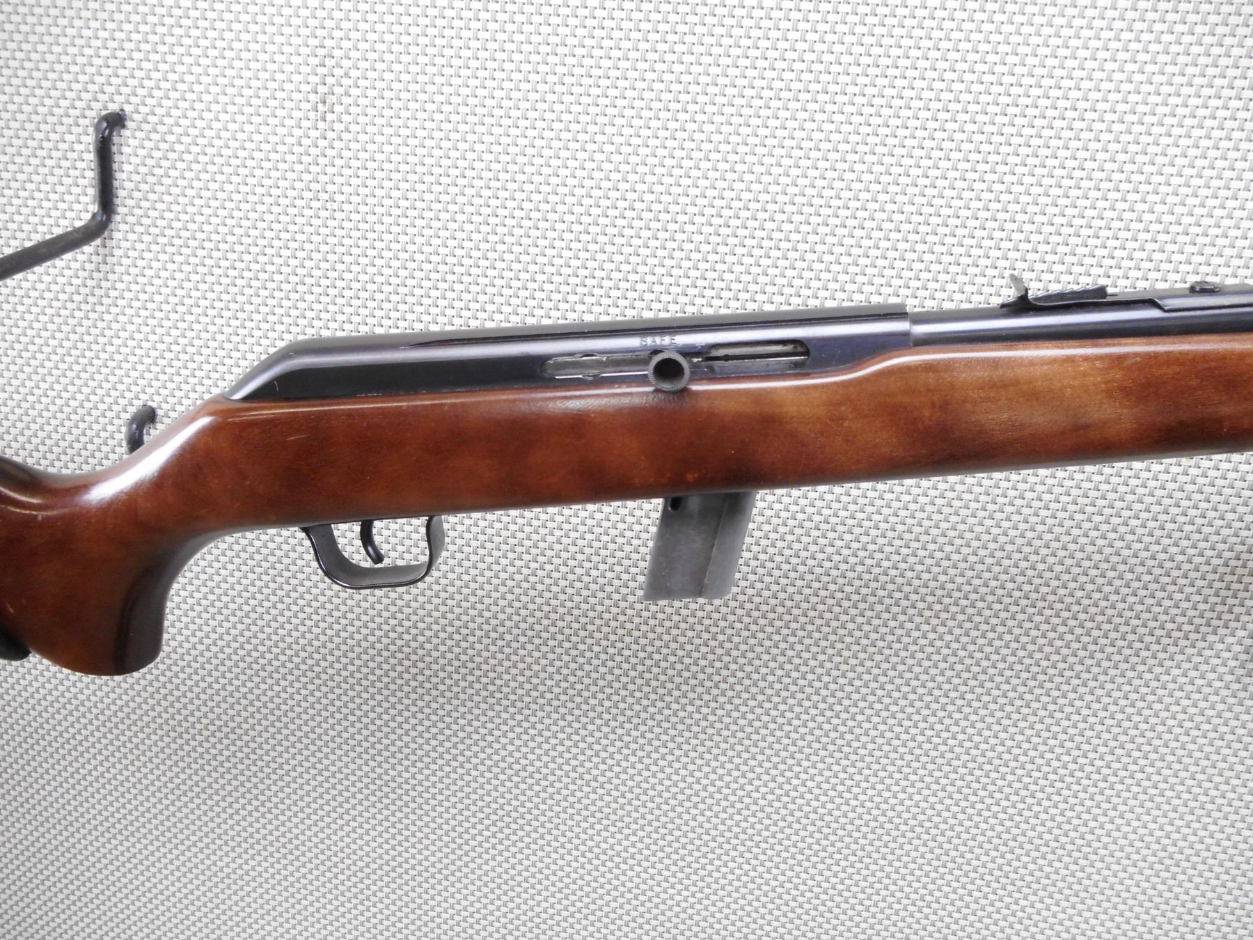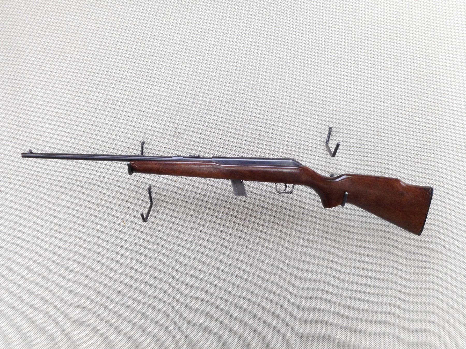 COOEY , MODEL: 64B , CALIBER: 22 LR , COMES WITH MAGAZINE. BORE IS EXCELLENT. BLADE FRONT SIGHT WITH ADJUSTABLE U NOTCH REAR SIGHT. BLUED FINISH ON METAL PARTS. SMOOTH WOOD STOCK WITH CHECKERED BLACK POLYMER BUTT PLATE. RECEIVER IS GROOVED FOR A SCOPE. SHOWS MINOR HANDLING MARKS AND WEAR. ACTION: SEMI AUTOMATIC RIFLE , BARREL LENGTH: 20" , SERIAL # CA127897 , CONDITION: 7/10 , CLASS: CANADIAN NON RESTRICTED CLASS