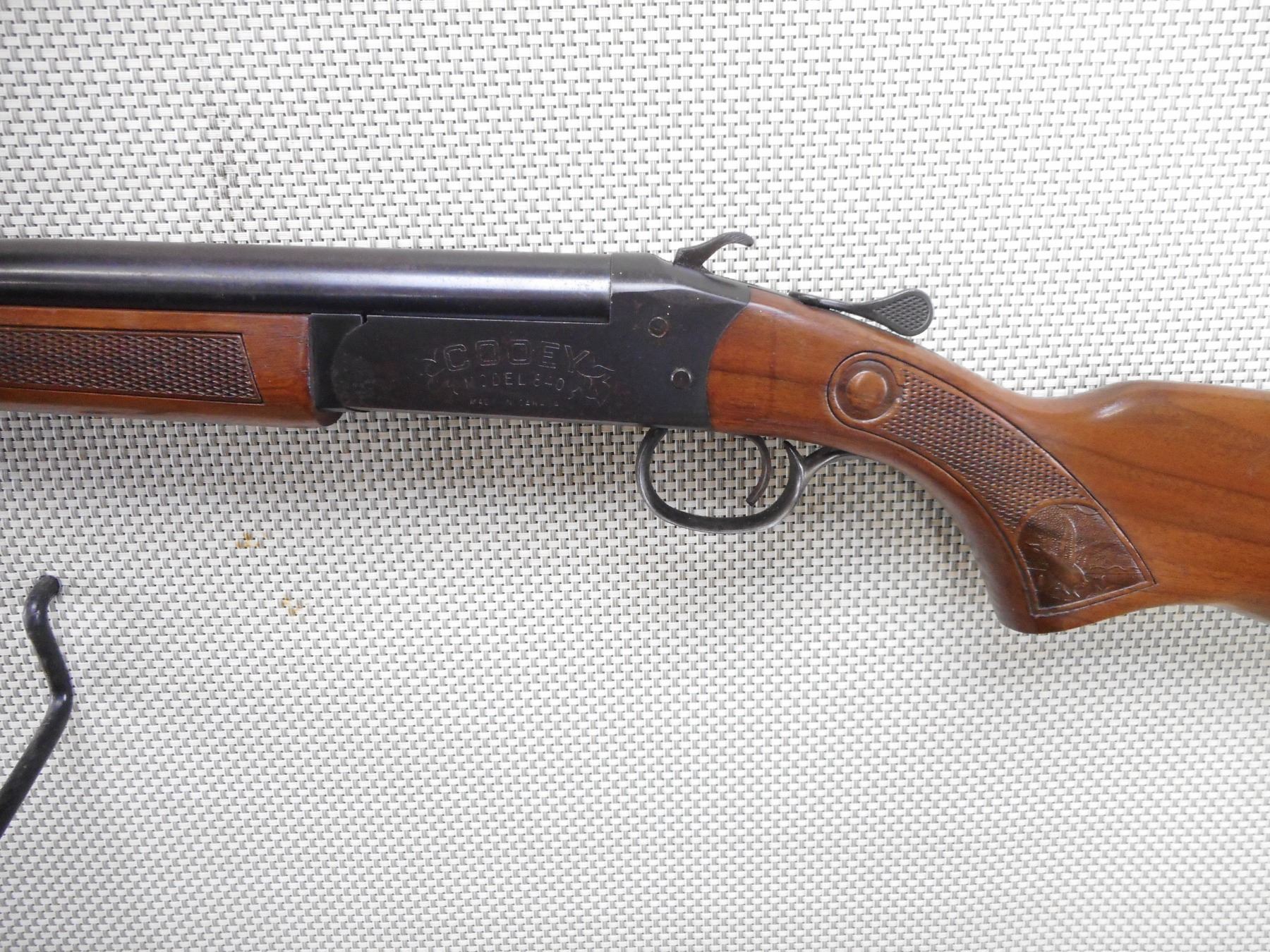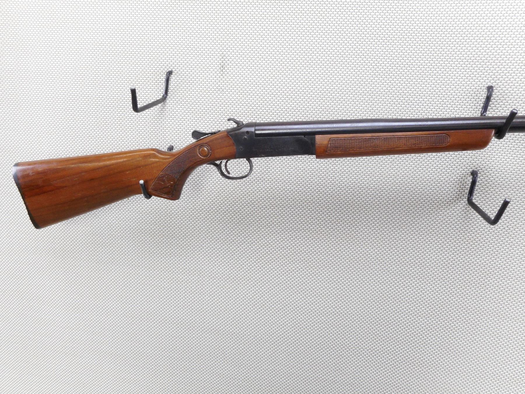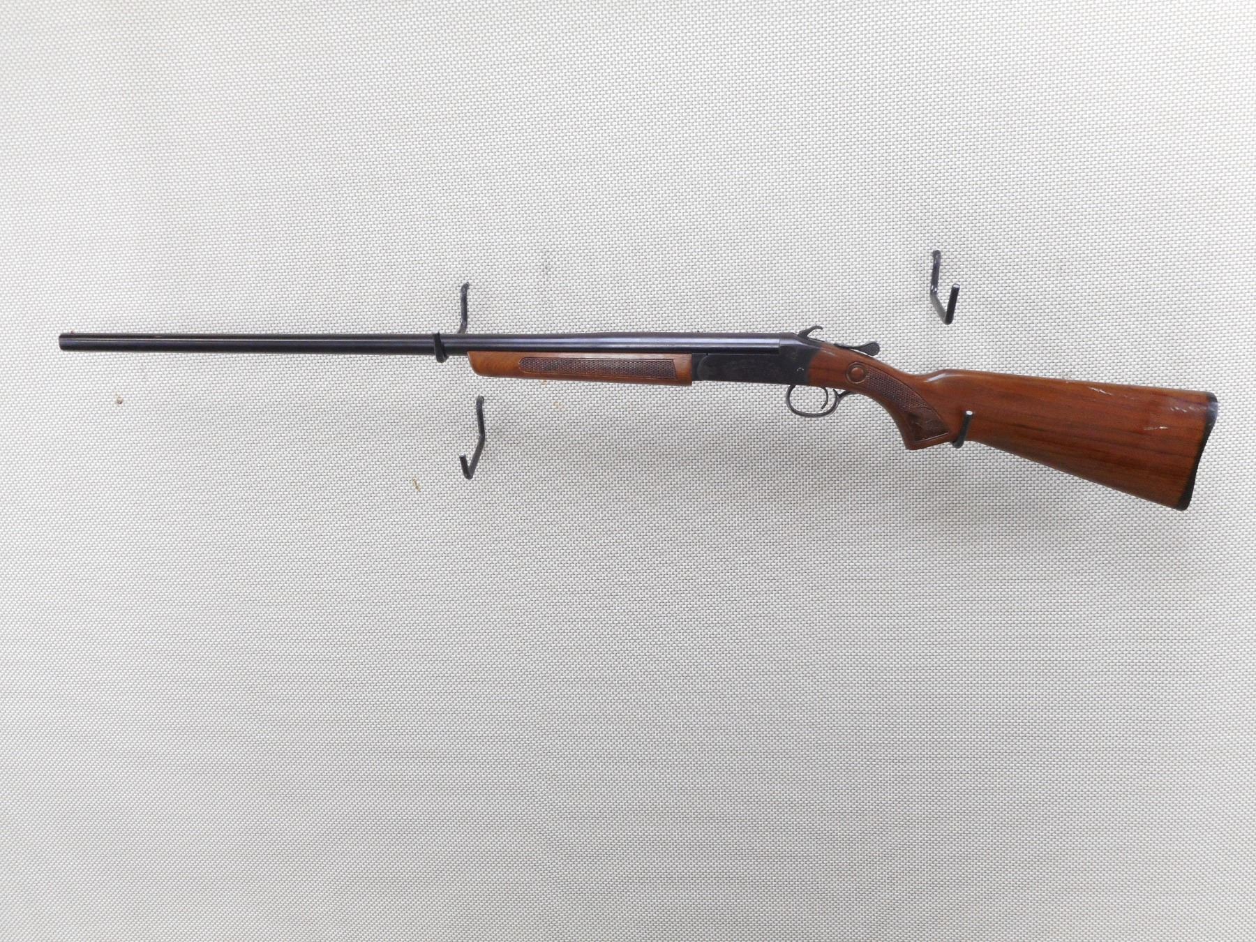 COOEY , MODEL: 840 , CALIBER: 12GA X 2 3/4" , BORE IS EXCELLENT. FIXED FULL CHOKE. BEAD FRONT SIGHT. BLUED FINISH ON METAL PARTS. CHECKERED WOOD FOREND AND BUTT STOCK. SERRATED BLACK POLYMER BUTT PLATE. SHOWS LIGHT RUST SPECKLING ON BOTTOM OF THE RECEIVER. MINOR HANDLING MARKS AND WEAR. ACTION: SINGLE SHOT BREAK ACTION SHOTGUN , BARREL LENGTH: 30" , SERIAL # 4C942 , CONDITION: 7/10 , CLASS: CANADIAN NON RESTRICTED CLASS