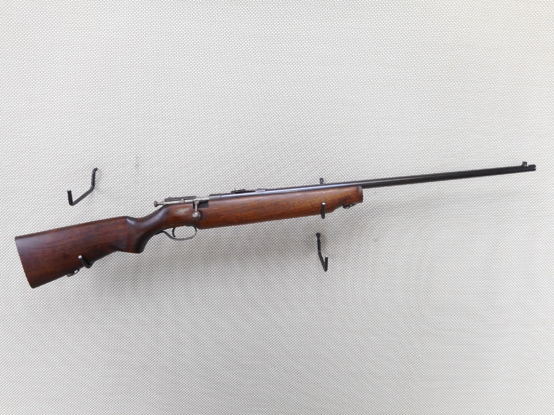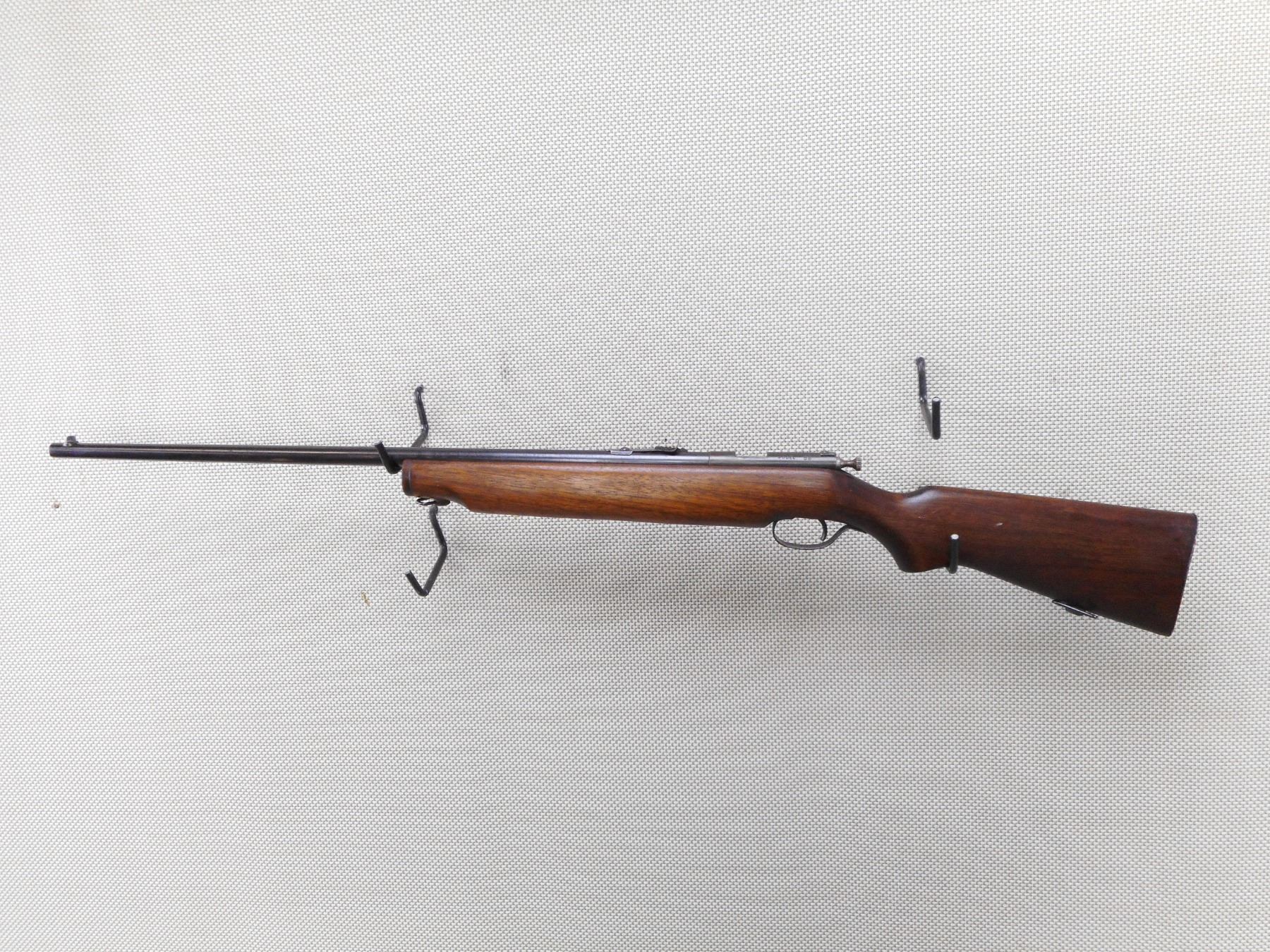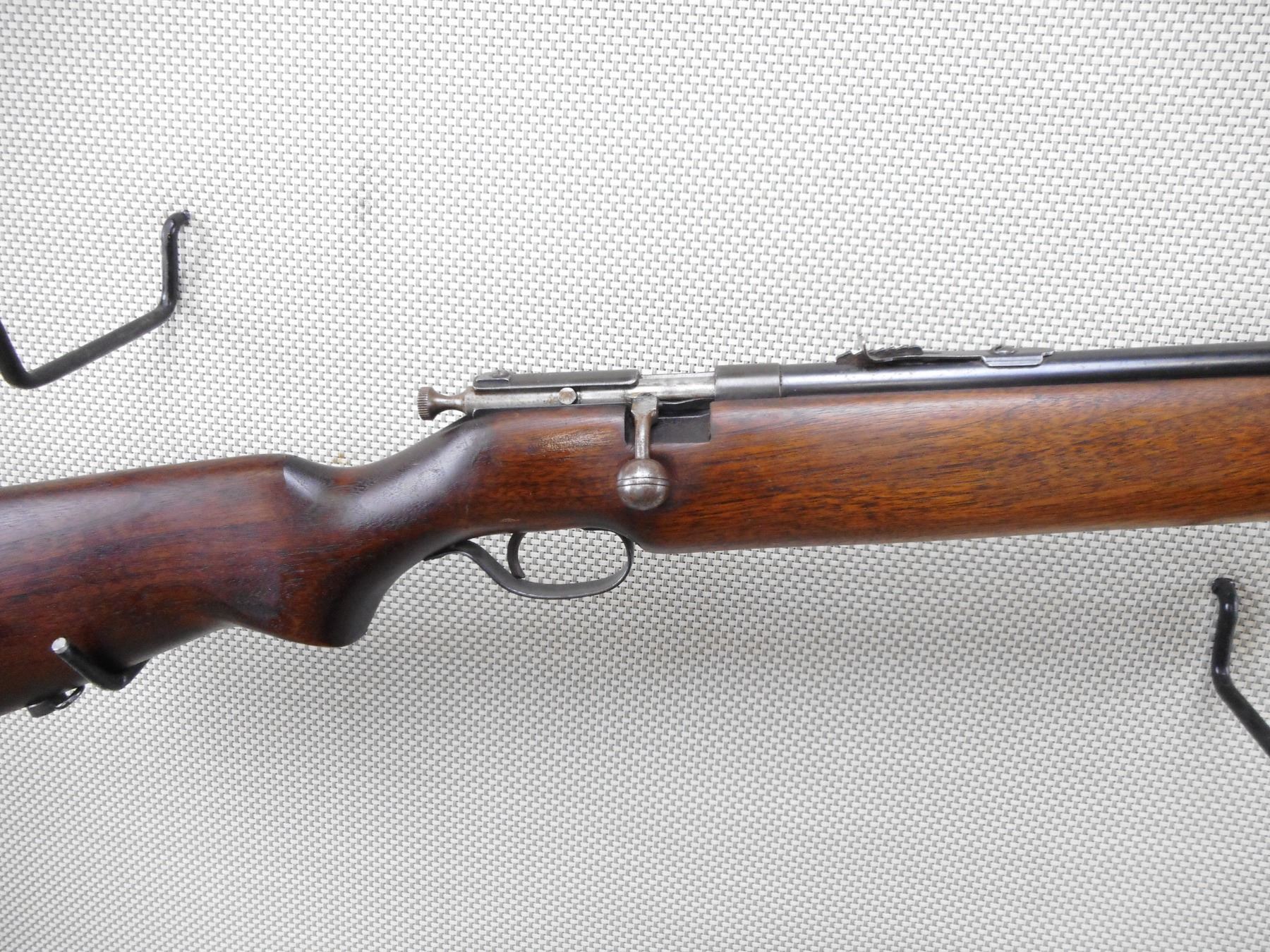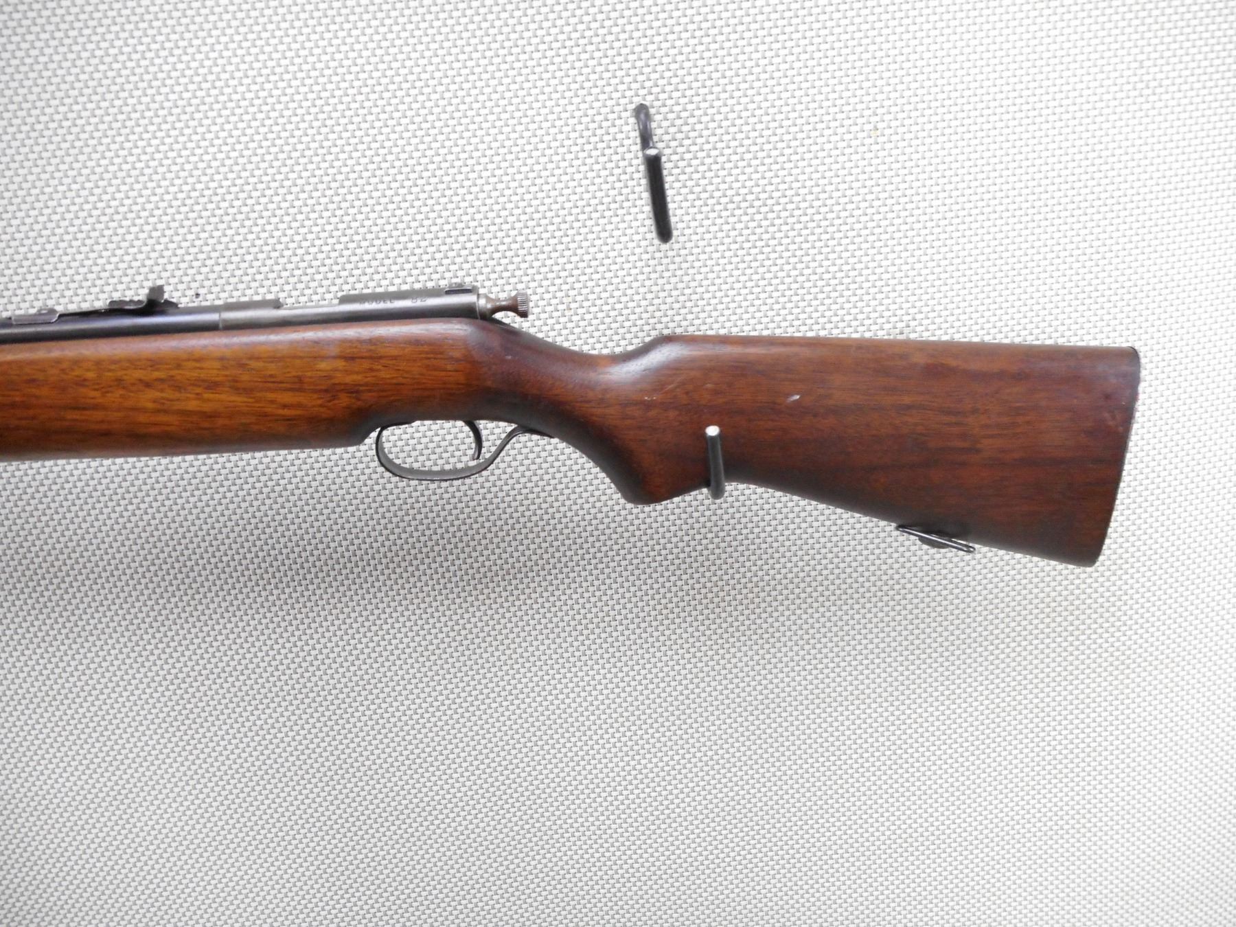COOEY , MODEL: 82 SPORTER , CALIBER: 22 LR , BORE IS EXCELLENT. BLADE FRONT SIGHT. ADJUSTABLE U NOTCH REAR SIGHT. BLUED FINISH ON METAL PARTS. MISSING THE FRONT WOOD AND BARREL BANDS. HAS A SMOOTH WOOD STOCK WITH BUTT PLATE THAT HAS BEEN PAINTED RED. SLING LOOPS. SHOWS SOME HANDLING MARKS AND WEAR. ACTION: BOLT ACTION RIFLE , BARREL LENGTH: 27" , SERIAL # N/A , CONDITION: 6/10 , CLASS: CANADIAN NON RESTRICTED CLASS