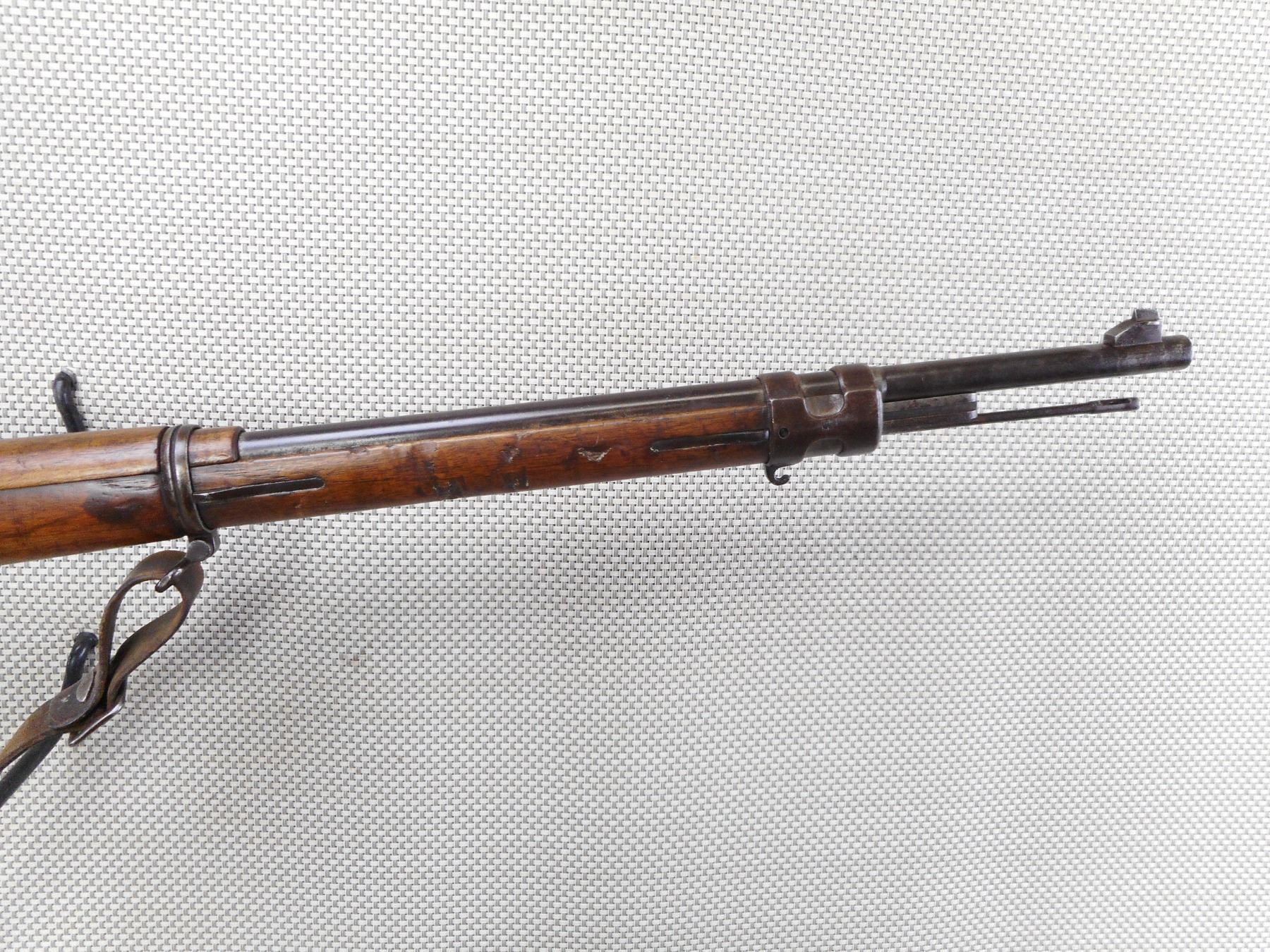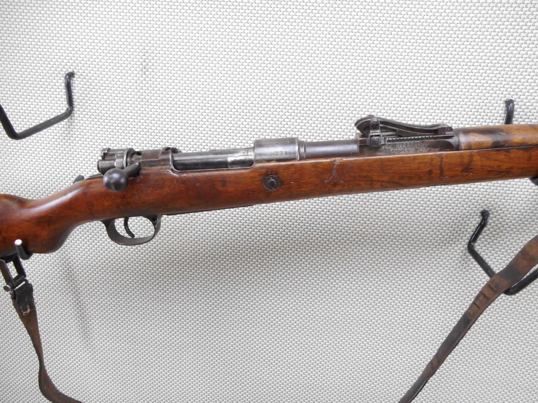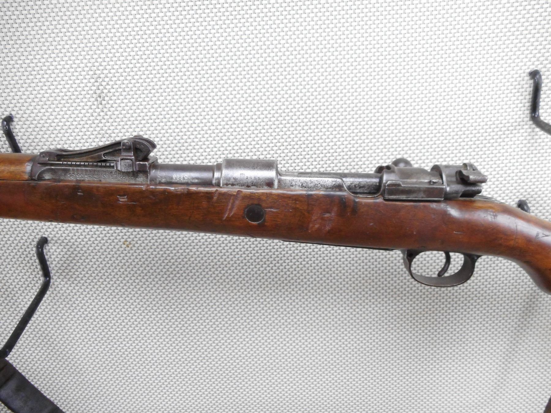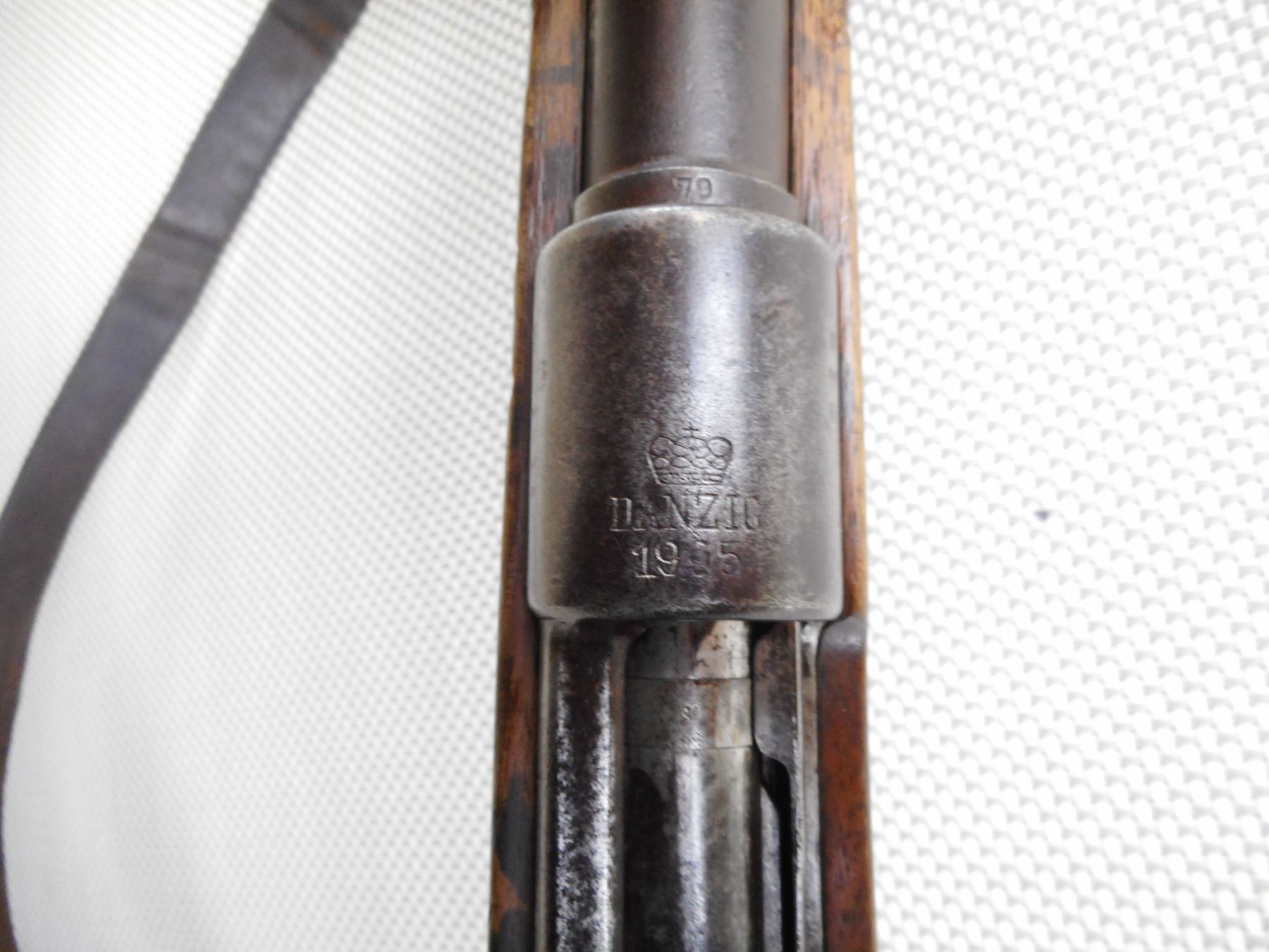 DANZIG , MODEL: GEW 98 , CALIBER: 8MM MAUSER , DANZIG 1905. BOLT HAS BEEN RENUMBERD TO MATCH BY SERIAL#. ARSENAL REPAIR TO THE BUTT. BORE IS POOR DARK AND PITTED. ORIGINAL SLING. BARLEY CORN FRONT SIGHT. ADJUSTABLE U NOTCH REAR SIGHT. CLEANING ROD. METAL FINISH IS TURNING BROWN. LIGHT RUST SPECKLING AND SILVER PATCHES. FULL LENGTH MILITARY STOCK. STEEL BUTT PLATE. SHOWS NUMEROUS CHIPS, DENTS AND HANDLING MARKS. ACTION: BOLT ACTION RIFLE , BARREL LENGTH: 29 1/2" , SERIAL # 1015 , CONDITION: 5/10 , CLASS: CANADIAN NON RESTRICTED CLASS