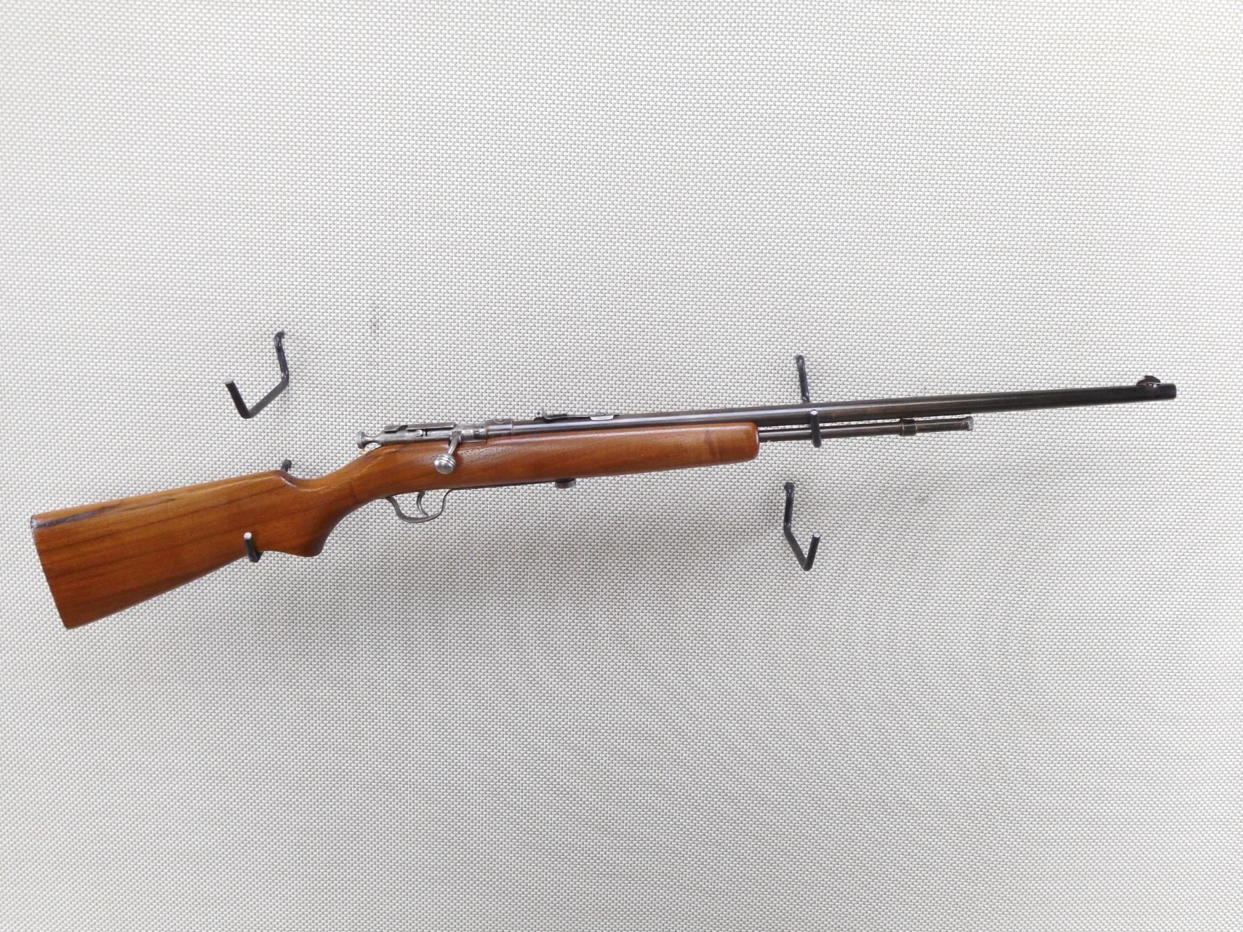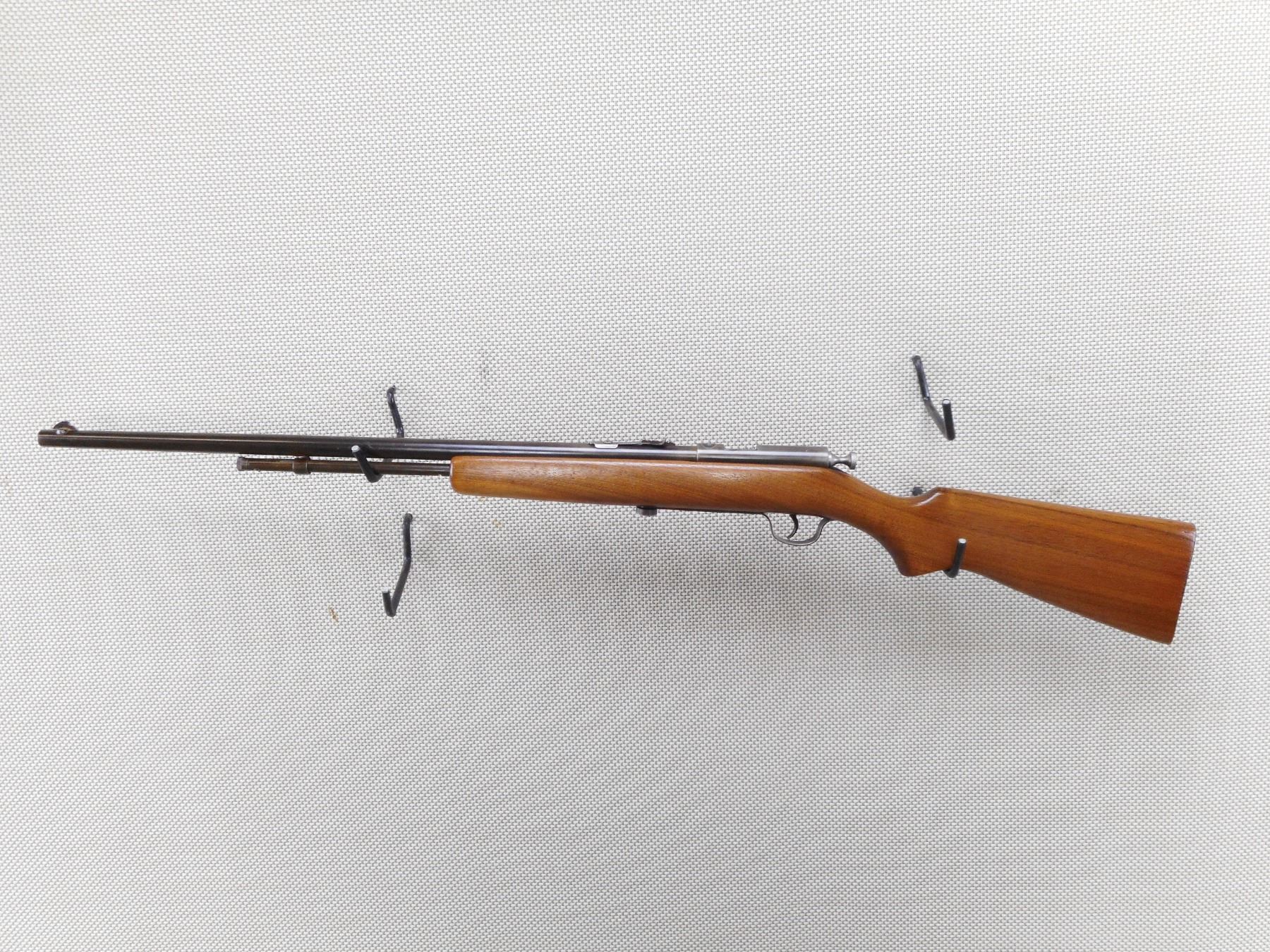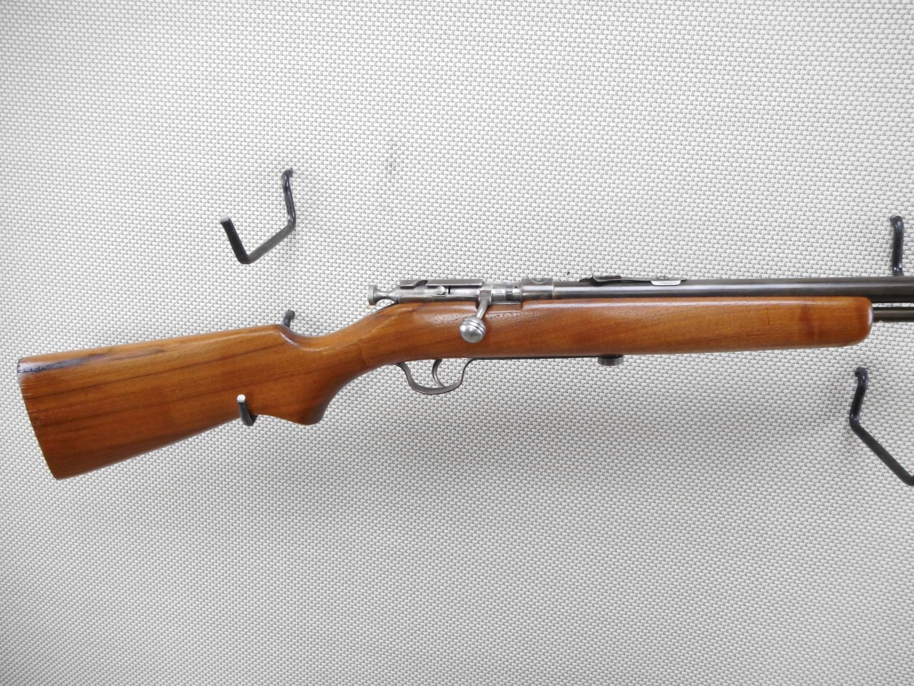 COOEY , MODEL: 60 , CALIBER: 22 LR , BORE IS EXCELLENT. BLADE FRONT SIGHT. ADJUSTABLE U NOTCH REAR SIGHT. BLUED FINISH ON METAL PARTS. SMOOTH WOOD STOCK WITH STEEL BUTT PLATE. MINOR WEAR TO THE BLUEING. SLIGHT HANDLING MARKS .ACTION: BOLT ACTION RIFLE , BARREL LENGTH: 24" , SERIAL # N/A , CONDITION: 7/10 , CLASS: CANADIAN NON RESTRICTED CLASS