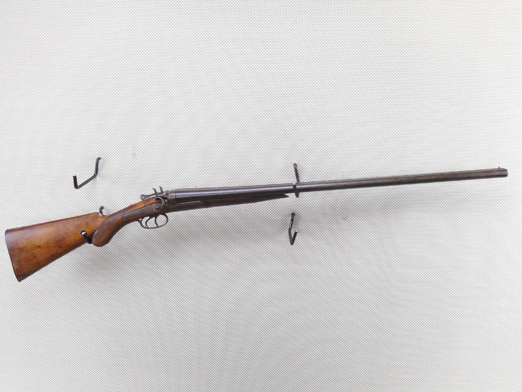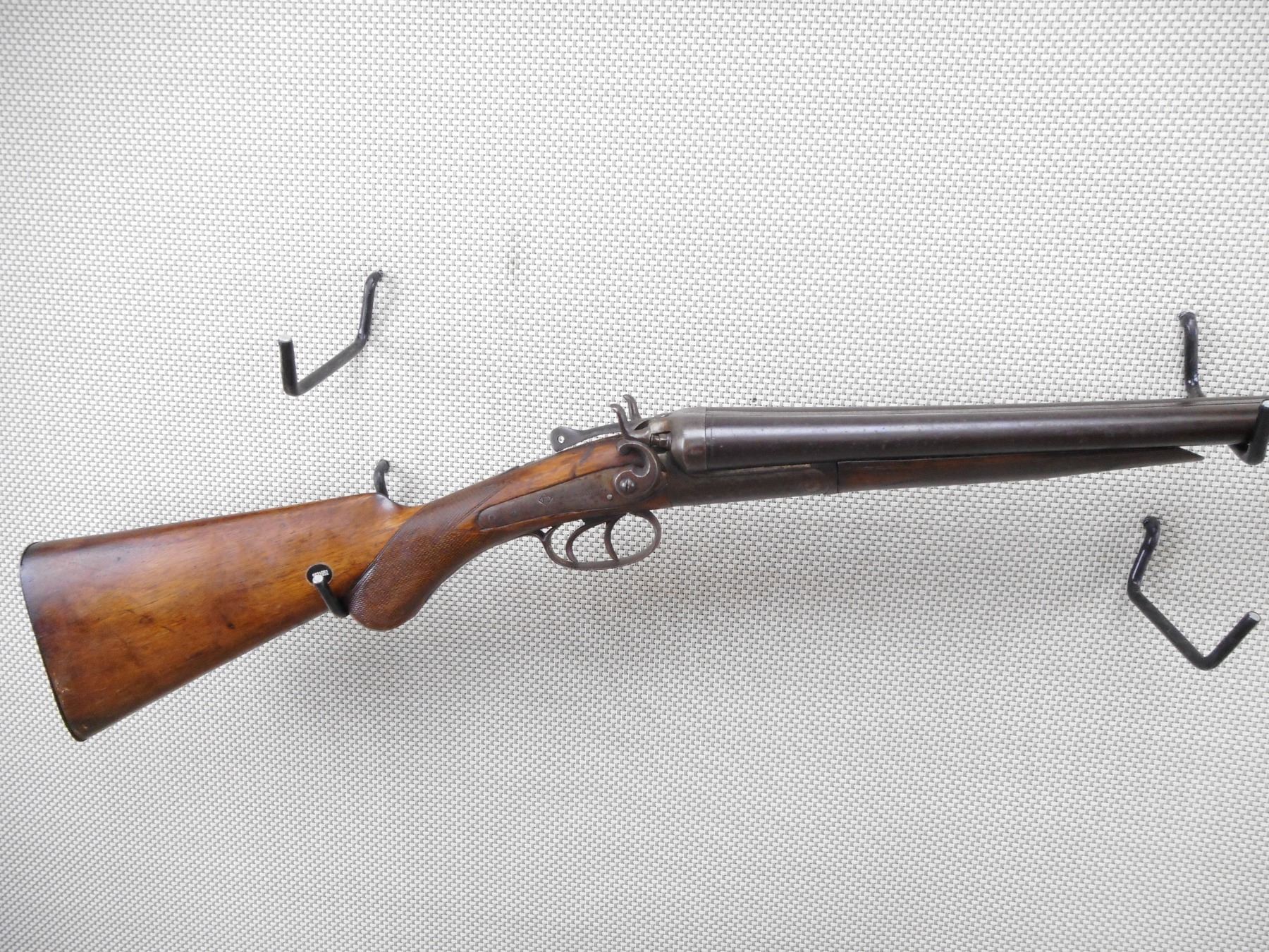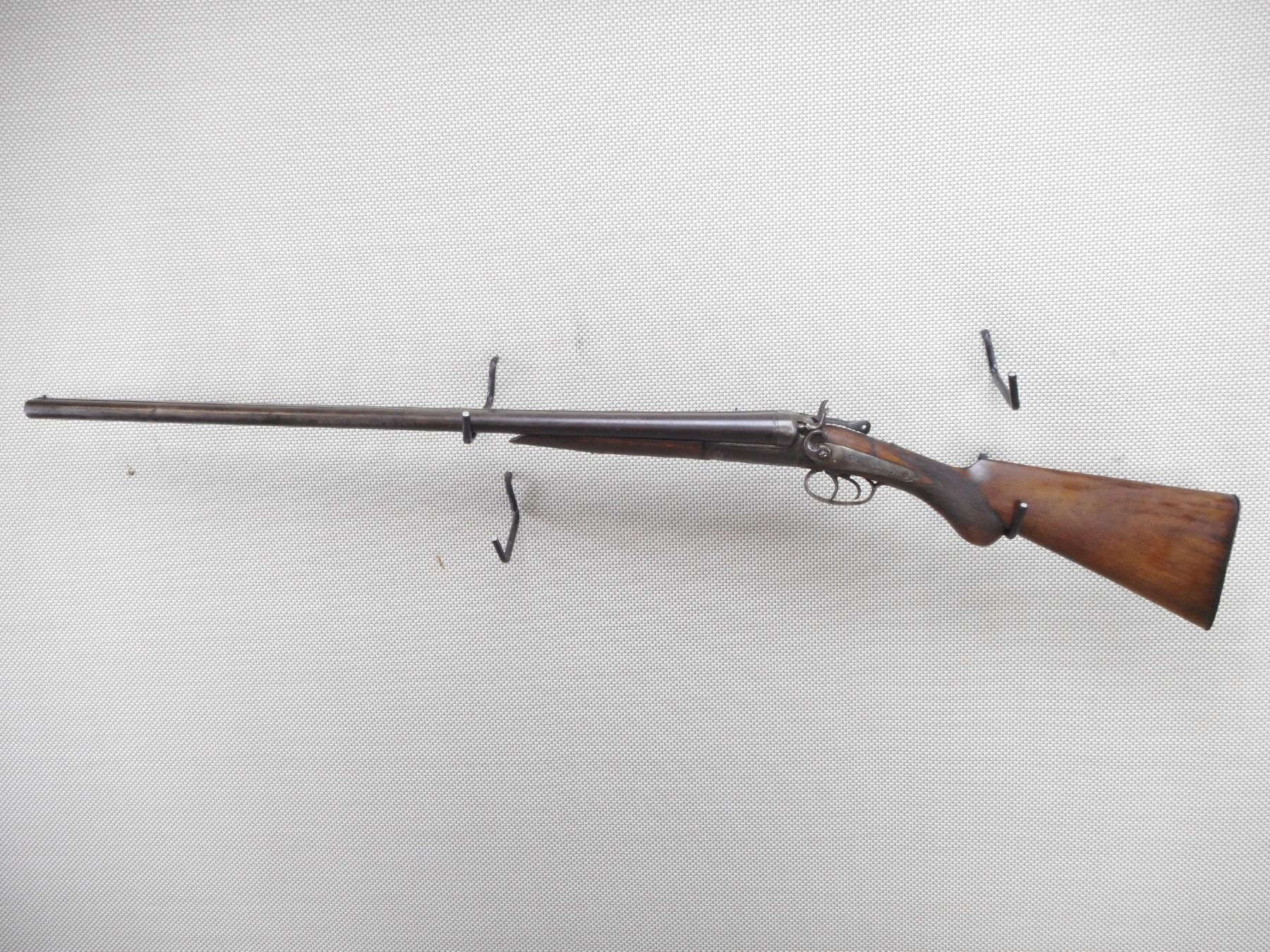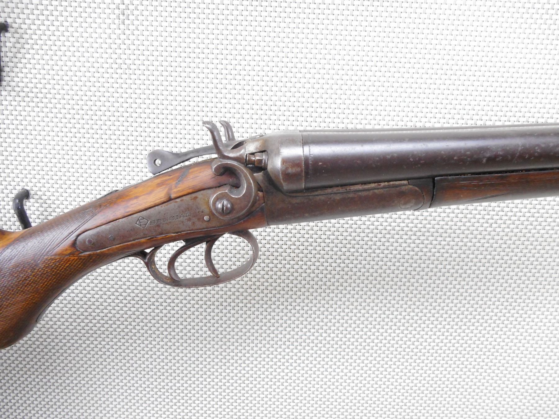 EATONIA , MODEL: SPECIAL , CALIBER: 12GA X 2 3/4" , FIXED MODIFIED CHOKES. WITH GOOD BORES. LEFT HAMMER WILL NOT STAY IN THE COCKED POSITION. BEAD FRONT SIGHT. CHECKERED TWO PIECE HARDWOOD STOCK WITH STEEL BUTT PLATE. LARGE CHIP OUT OF THE WRIST. CRACKED FOREND. SHOWS EXTENSIVE HANDLING MARKS.ACTION: BREAK ACTION SIDE BY SIDE SHOTGUN , BARREL LENGTH: 30" , SERIAL # N/A , CONDITION: 5/10 , CLASS: CANADIAN NON RESTRICTED CLASS