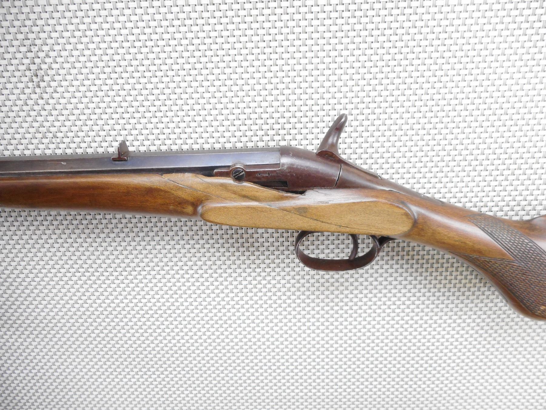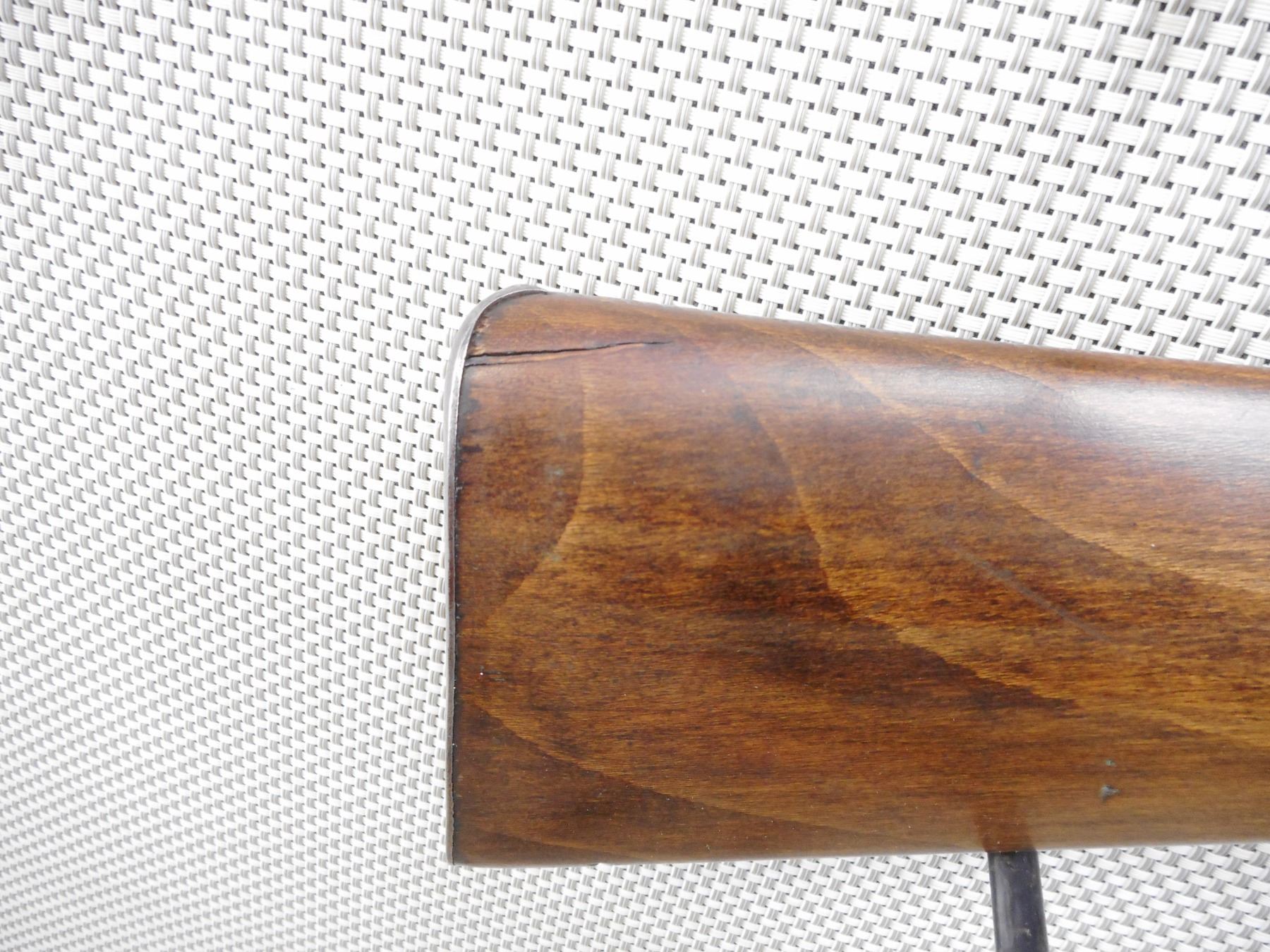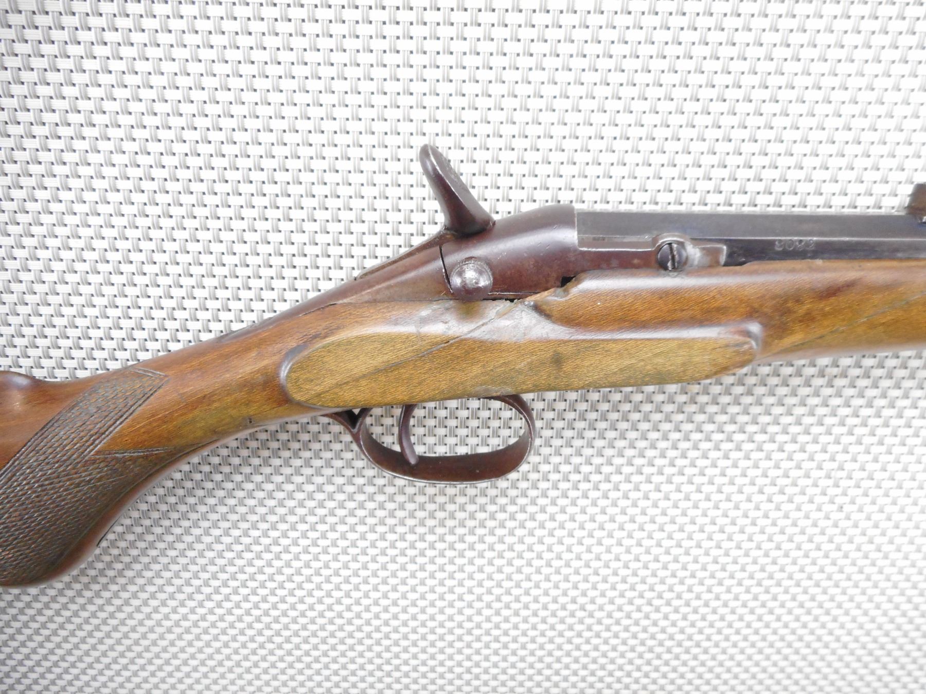 FLOBERT , MODEL: SINGLE SHOT , CALIBER: 6MM FLOBERT , BORE IS GOOD. BLADE FRONT AND FIXED REAR SIGHTS. CRACKED AND SPLIT FOREND. STEEL BUTT PLATE. CHIPS AT THE TOE. SHOWS EXTENSIVE HANDLING MARKS. ACTION: SINGLE SHOT RIFLE , BARREL LENGTH: 22" , SERIAL # 8082 , CONDITION: 5/10 , CLASS: CANADIAN NON RESTRICTED CLASS