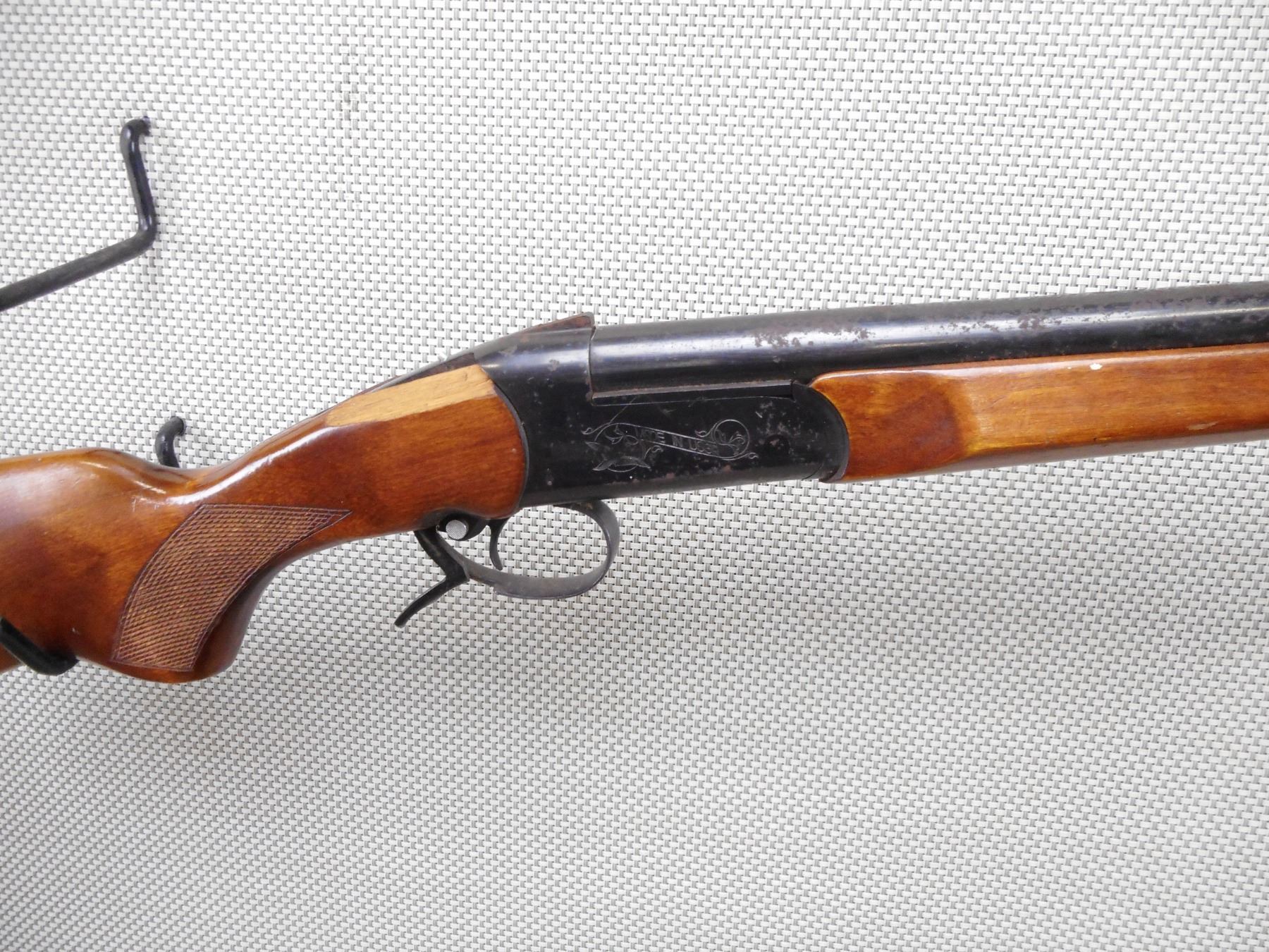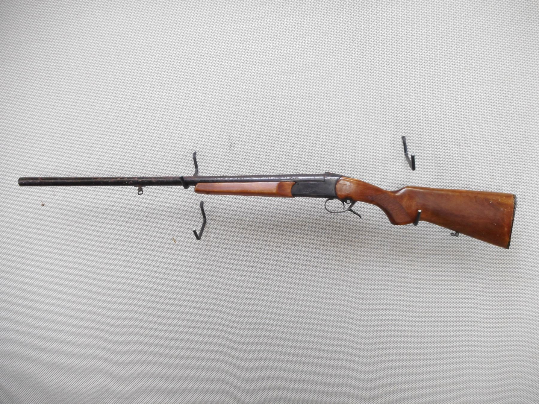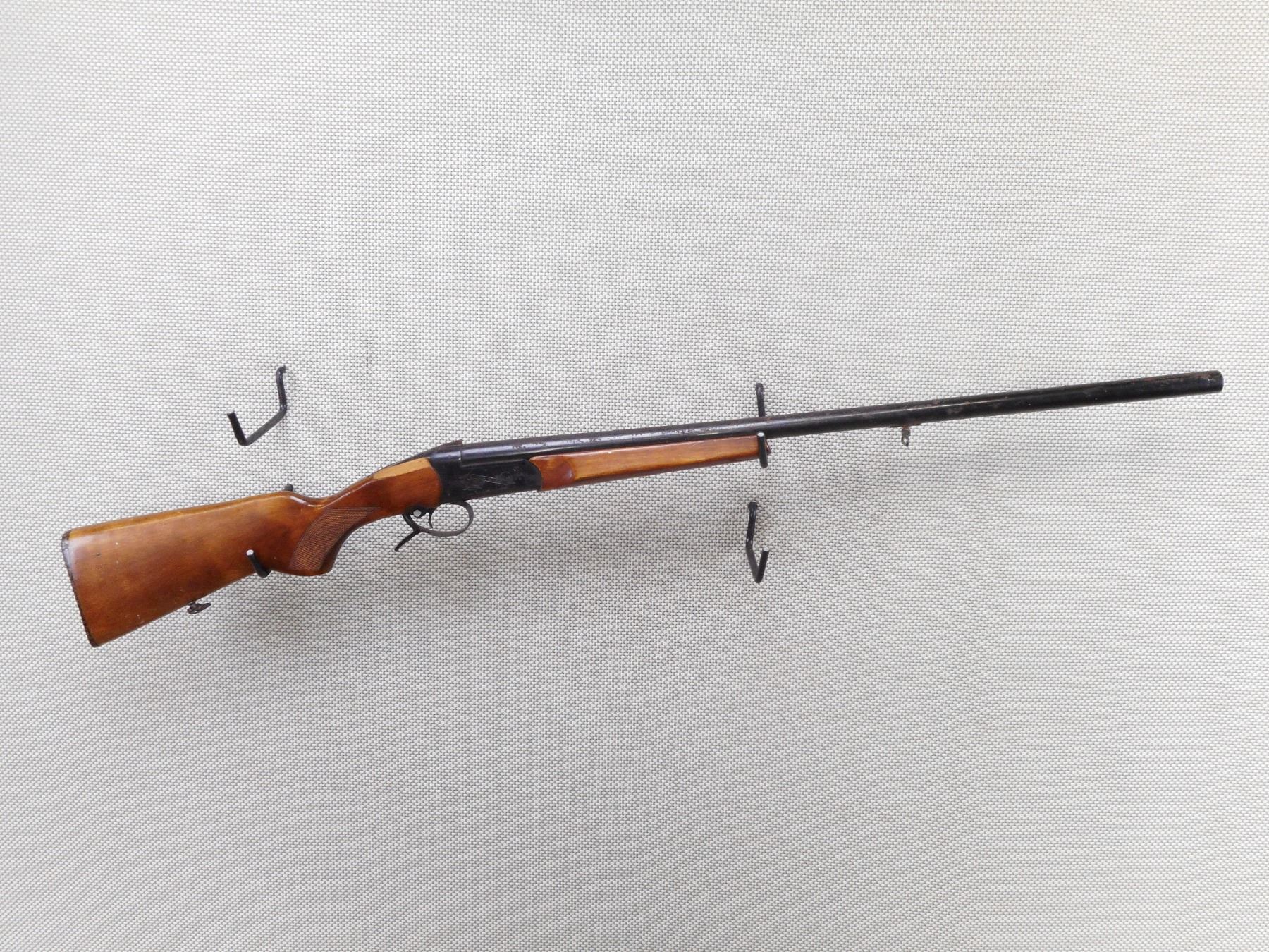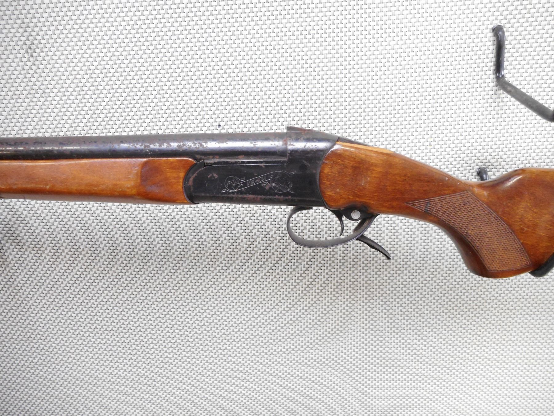BAIKAL , MODEL: IJ18M , CALIBER: 12GA X 2 3/4" , BORE IS DARK. FIXED FULL CHOKE. MISSING THE BEAD FRONT SIGHT. TWO PIECE HARDWOOD STOCK THAT IS CRACKED AND CHIPPED. THERE ARE LARGE CRACKS AND CHIPS AT THE WRIST. BUTT STOCK IS LOOSE. PLASTIC BUTT PLATE. SLING SWIVEL LOOPS. ALL METAL PARTS ARE DEEPLY COVERED IN RUST.ACTION: SINGLE SHOT BREAK ACTION SHOT GUN , BARREL LENGTH: 28 1/2" , SERIAL # N/A , CONDITION: 3/10 , CLASS: CANADIAN NON RESTRICTED CLASS