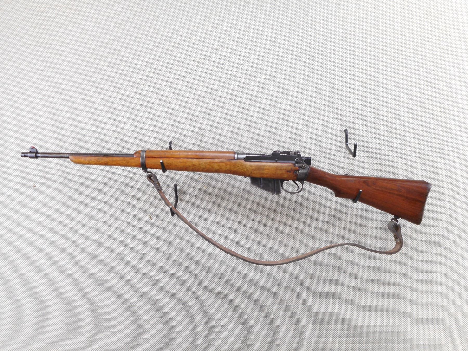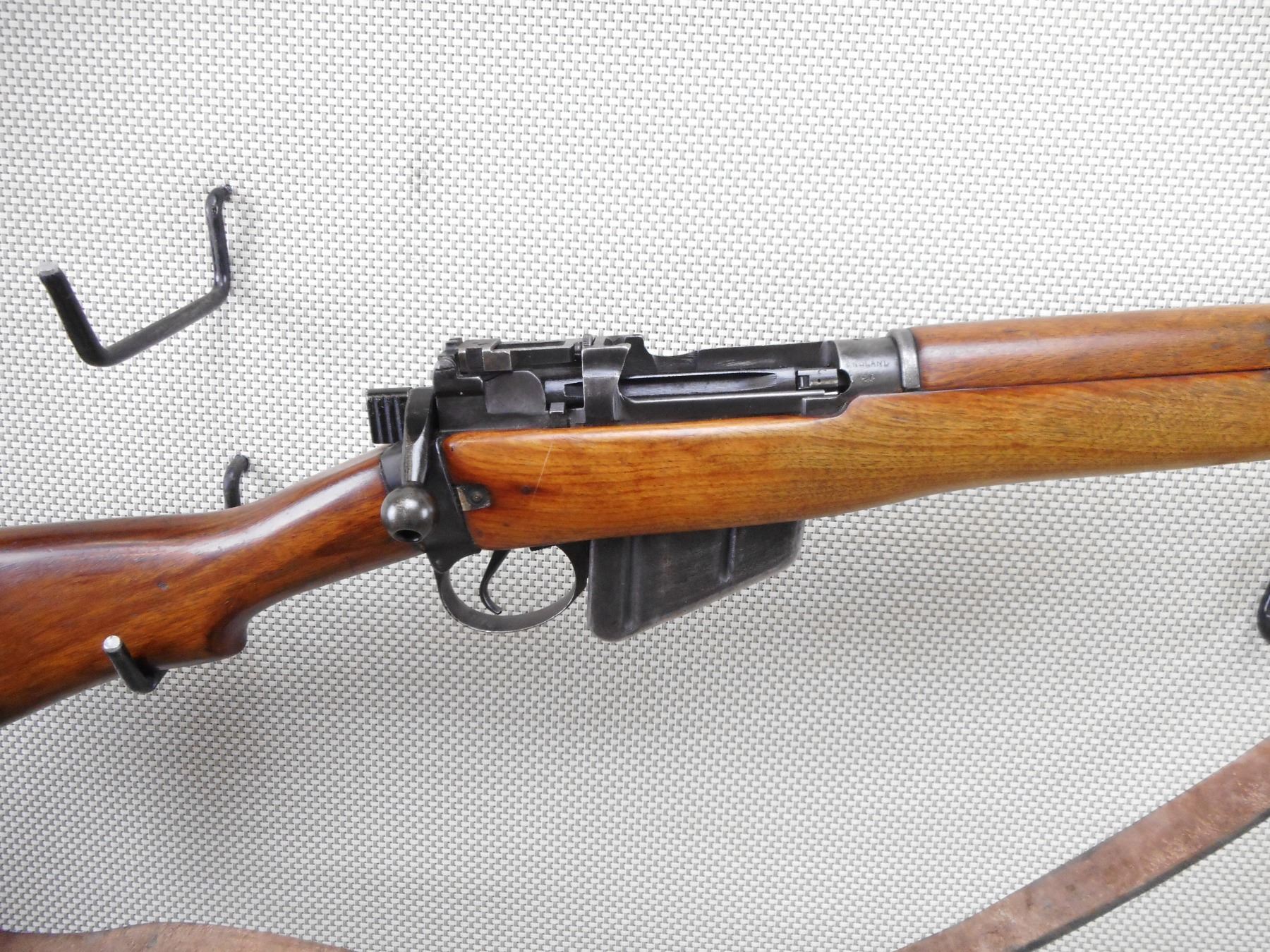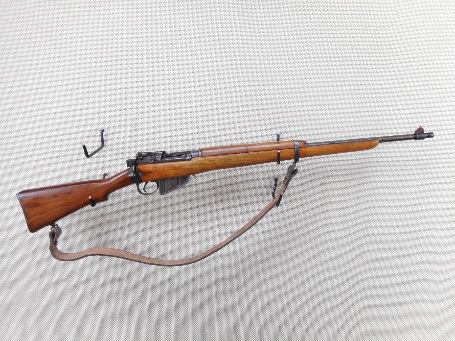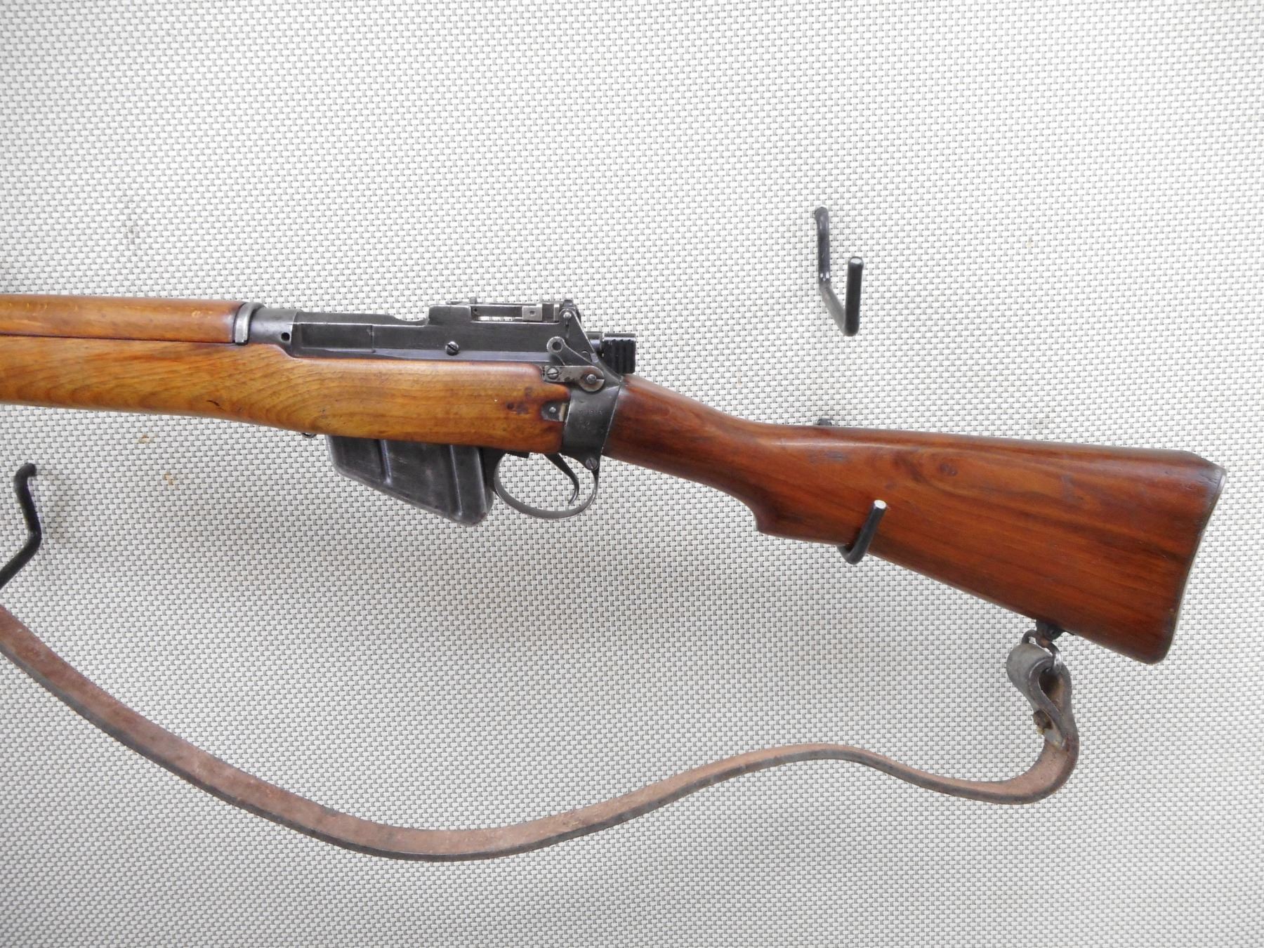 LEE ENFIELD , MODEL: NO4 MKI , CALIBER: 303 BR , COMES WITH MAGAZINE. DATED 1943. BOLT AND RECEIVER DON'T MATCH BY SERIAL #. BARREL IS CUT OFF AT THE BAYONET LUGS. BLADE FRONT SIGHT. MILLED REAR PEEP SIGHT. BATTLE SIGHT CUT OFF. RECEIVER IS DRILLED AND TAPPED. FOREND IS CUT DOWN. HAS ONE BARREL BAND. WOOD BUTT STOCK WITH BRASS BUTT PLATE. SLING SWIVELS WITH LEATHER SLING. SHOWS NUMEROUS HANDLING MARKS AND WEAR. ACTION: BOLT ACTION RIFLE , BARREL LENGTH: 24" , SERIAL # B117727 , CONDITION: 4/10 , CLASS: CANADIAN NON RESTRICTED CLASS