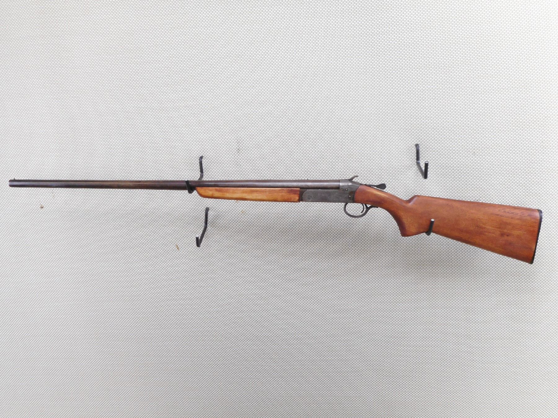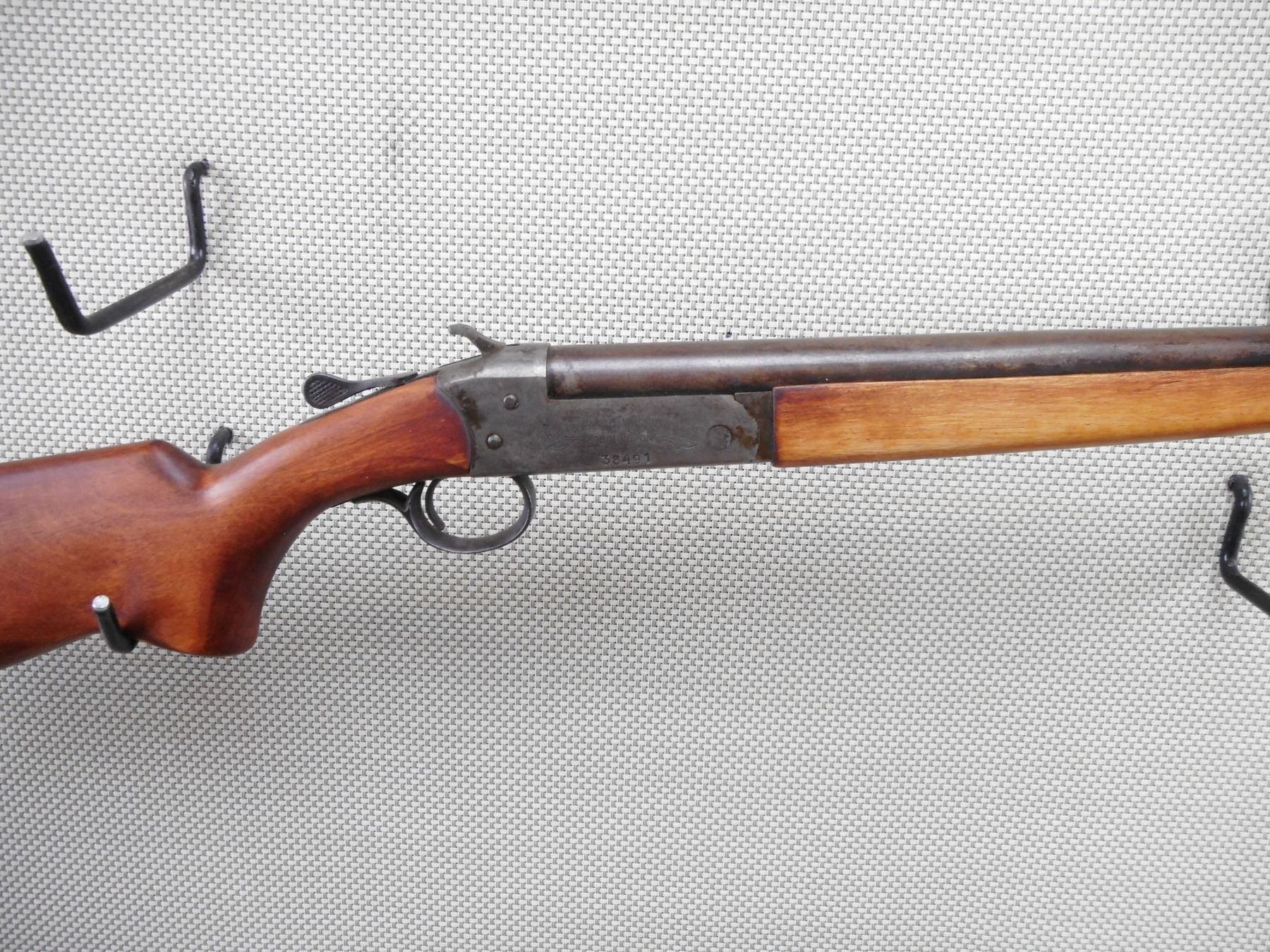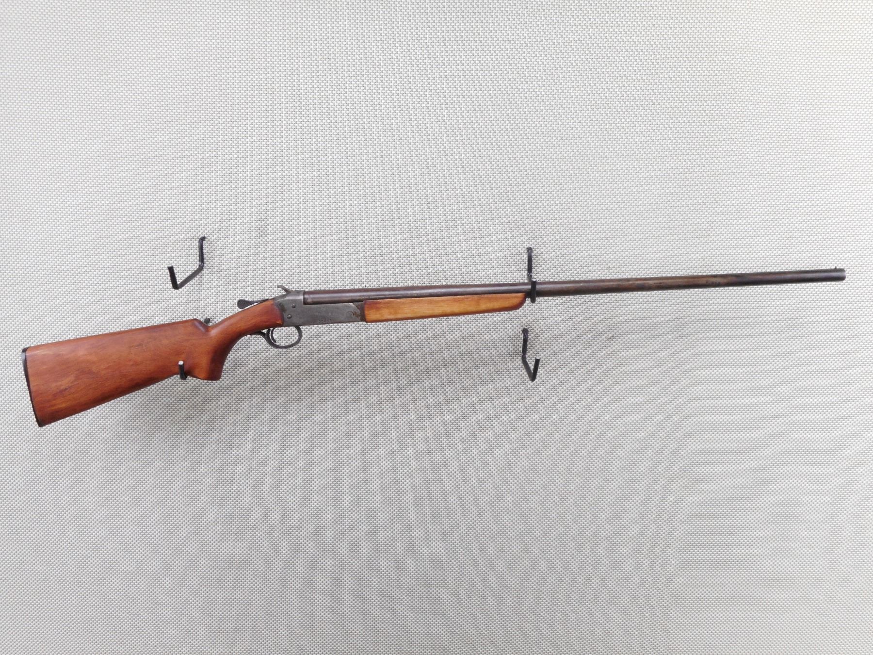 COOEY , MODEL: SINGLE SHOT , CALIBER: 16GA X 2 3/4" , MADE IN COBURG ONTARIO. BORE IS VERY GOOD. FIXED FULL CHOKE. BRASS BEAD FRONT SIGHT. SMOOTH WOOD FORESTOCK. PISTOL GRIP FORESTOCK WITH GROOVED BLACK POLYMER BUTT PLATE MADE BY ITHICA. METAL FINISH TURNING GREY SILVER BROWN. LIGHT RUST PITTING. NUMEROUS HANDLING MARKS AND WEAR. ACTION: SINGLE SHOT SHOTGUN , BARREL LENGTH: 30" , SERIAL # 38491 , CONDITION: 4/10 , CLASS: CANADIAN NON RESTRICTED CLASS
