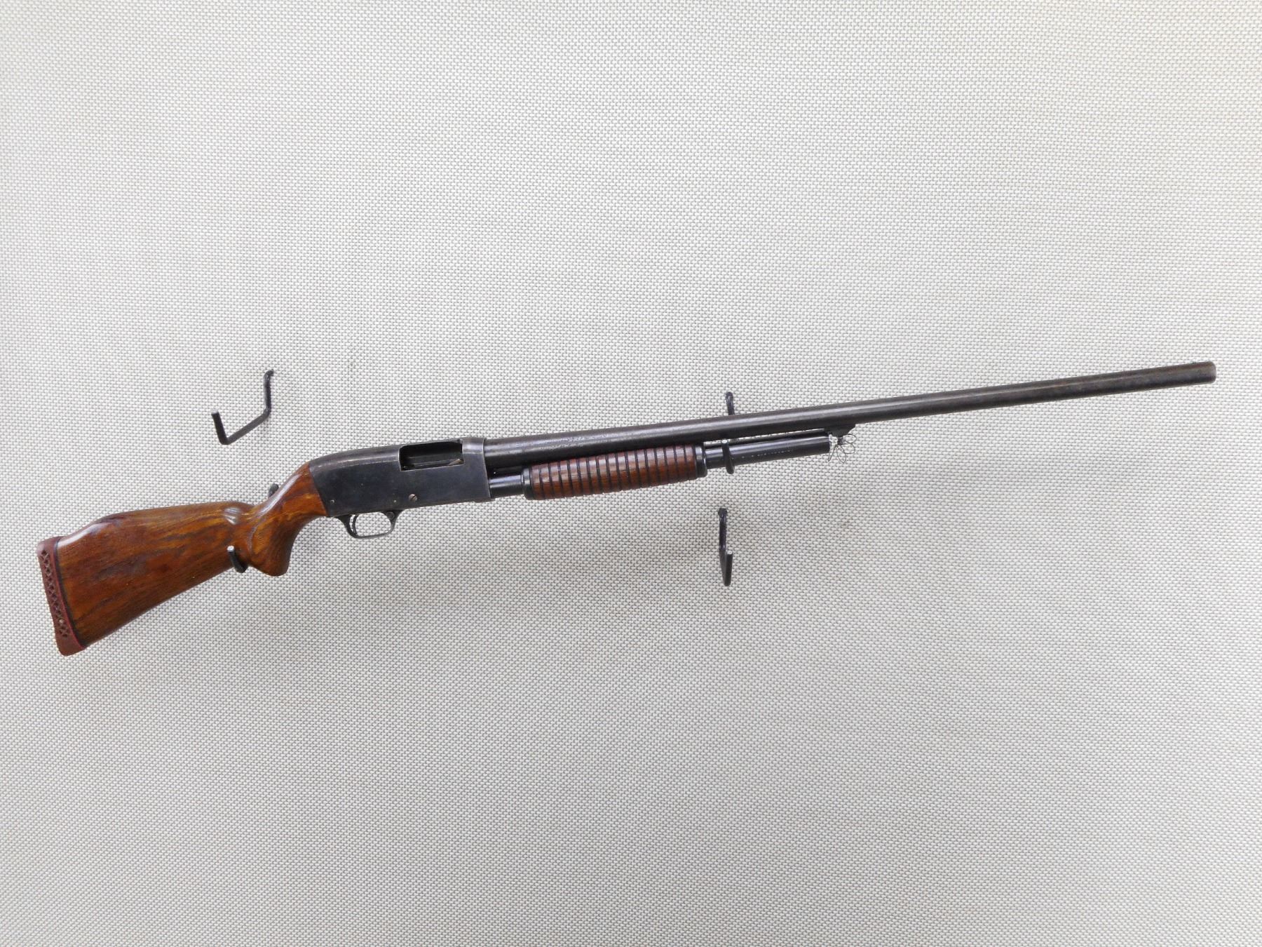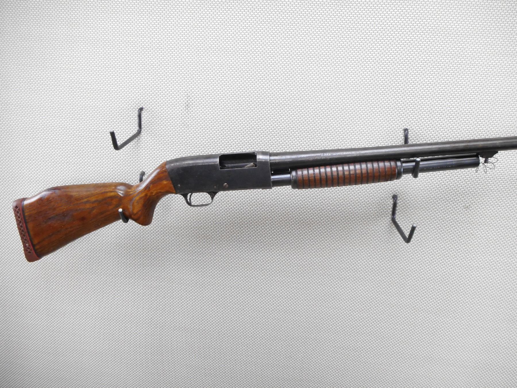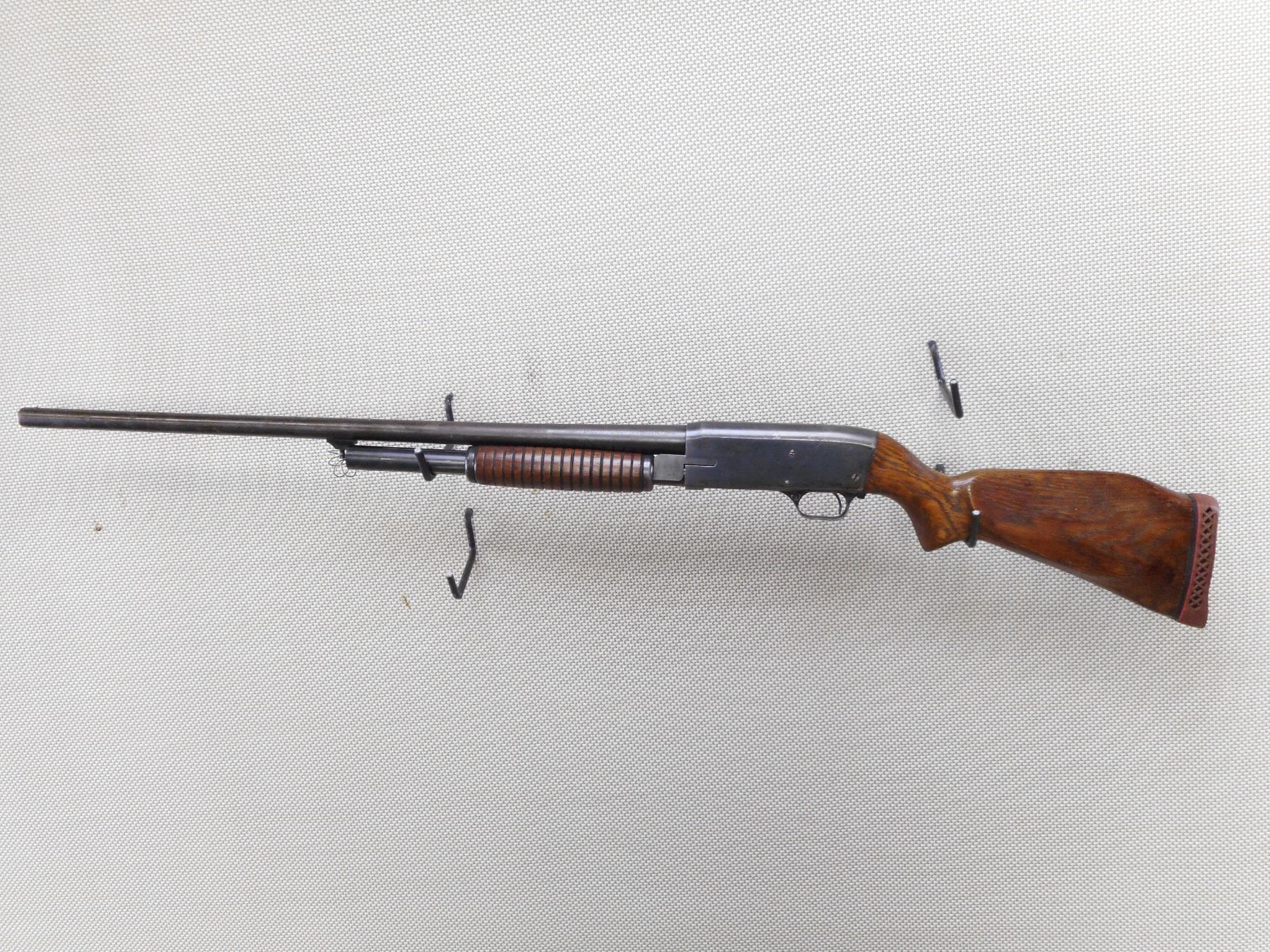 STEVENS , MODEL: 820B , CALIBER: 12GA X 2 3/4" , BORE IS VERY GOOD. FIXED FULL CHOKE. SILVER BEAD FRONT SIGHT. ROUND BARREL. GROOVED WOOD FOREND. HOME MADE LAMINATE PISTOL GRIP BUTT STOCK. RED VENTED RUBBER RECOIL PAD. MISSING THE MAGAZINE TUBE CAP. NUMEROUS HANDLING MARKS AND WEAR. ACTION: PUMP ACTION SHOTGUN , BARREL LENGTH: 28" , SERIAL # N/A , CONDITION: 3/10 , CLASS: CANADIAN NON RESTRICTED CLASS