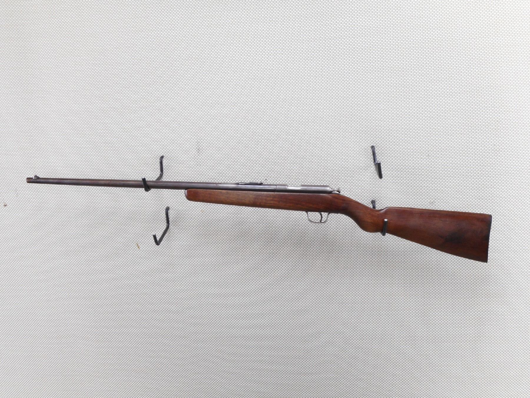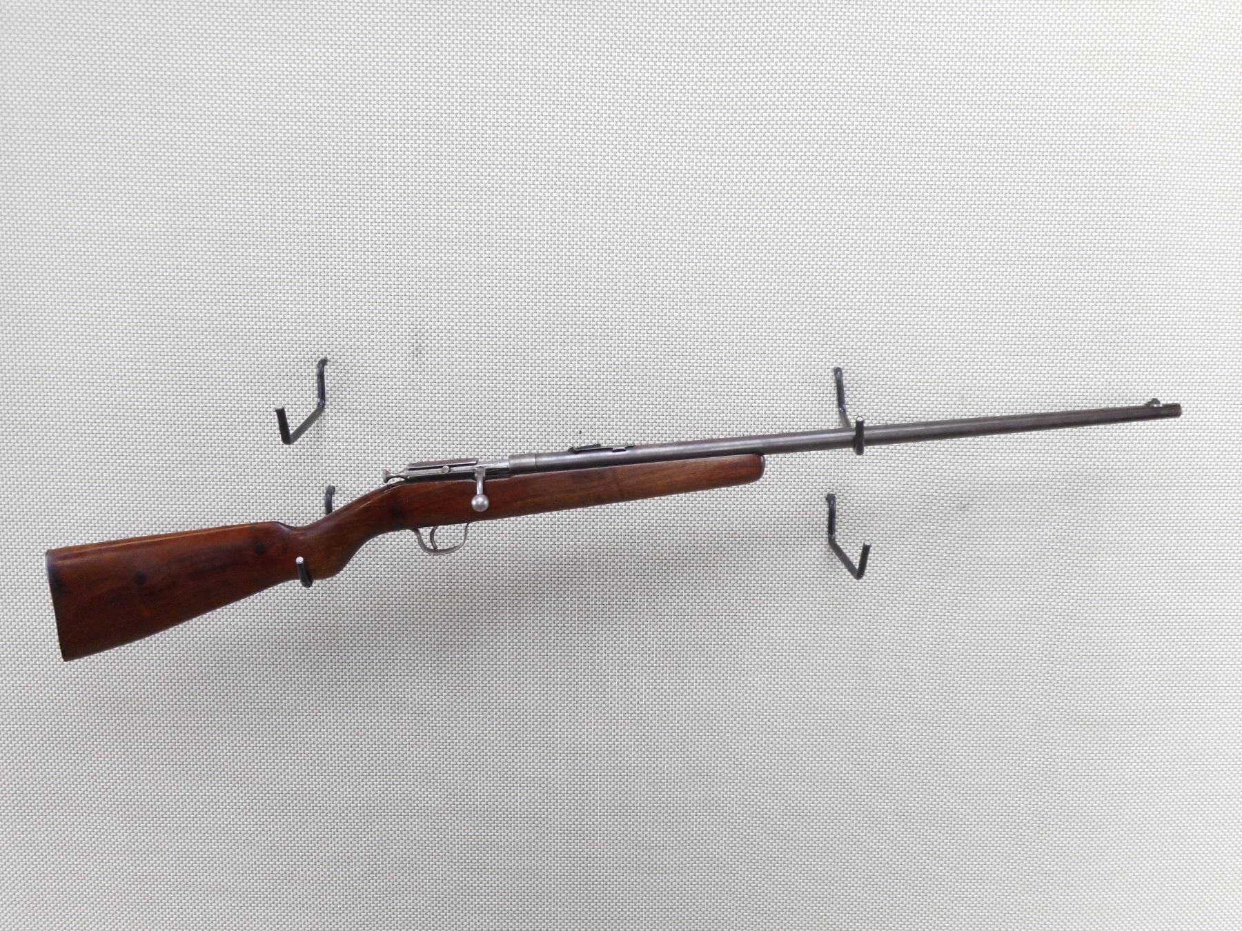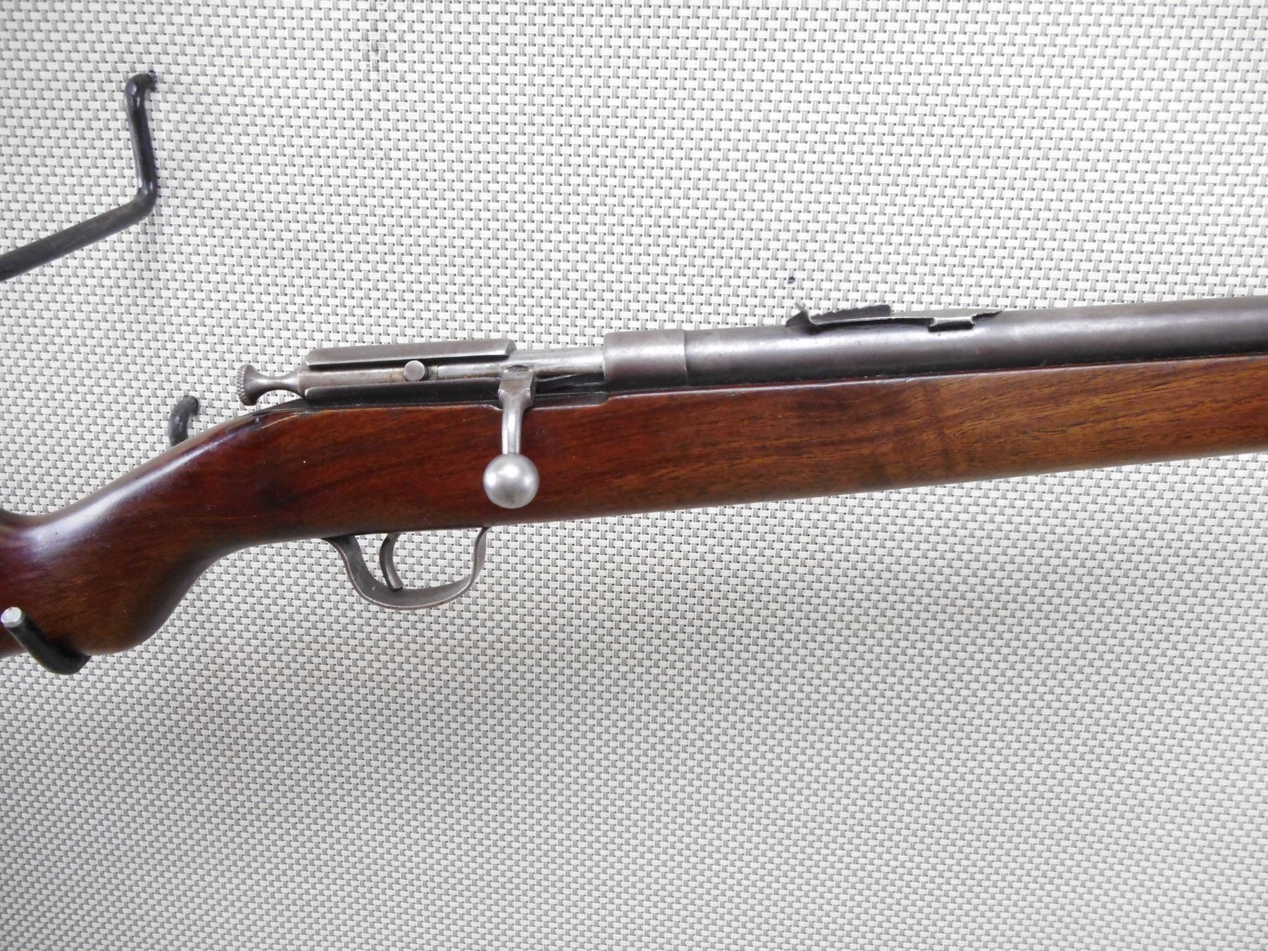 EATONIA , MODEL: SENIOR , CALIBER: 22 LR , BORE IS VERY GOOD. BLADE FRONT SIGHT. ADJUSTABLE U NOTCH REAR SIGHT WHICH IS BENT. METAL FINISH IS TURNING SILVER GREY WITH LIGHT PITTING. SMOOTH WOOD STOCK WITH STEEL BUTT PLATE. STOCK HAS BEEN REFINISHED. CRACK ON THE LEFT SIDE. SHOWS NUMEROUS HANDLING MARKS AND WEAR. ACTION: BOLT ACTION RIFLE , BARREL LENGTH: 23 1/2" , SERIAL # N/A , CONDITION: 5/10 , CLASS: CANADIAN NON RESTRICTED CLASS