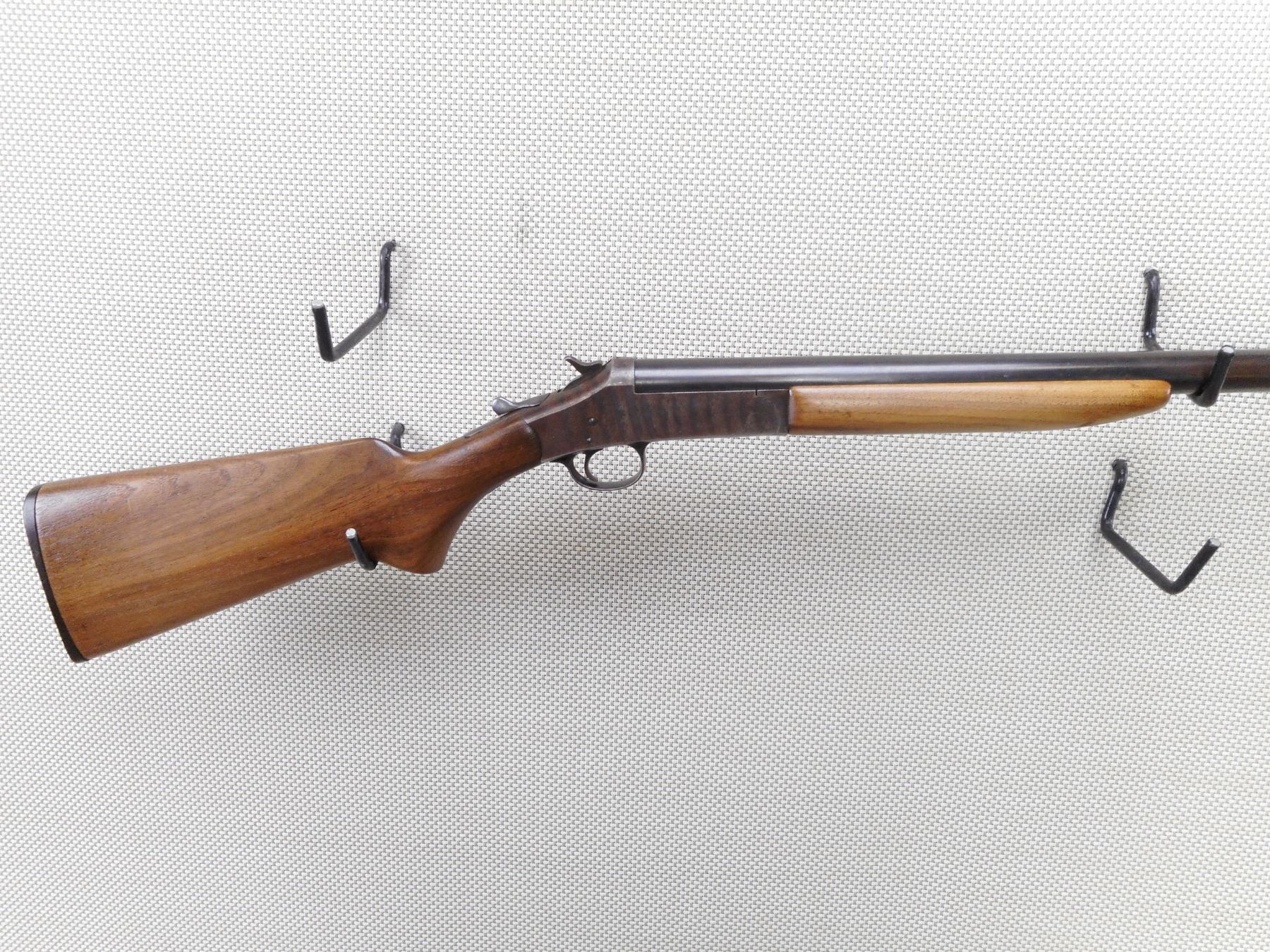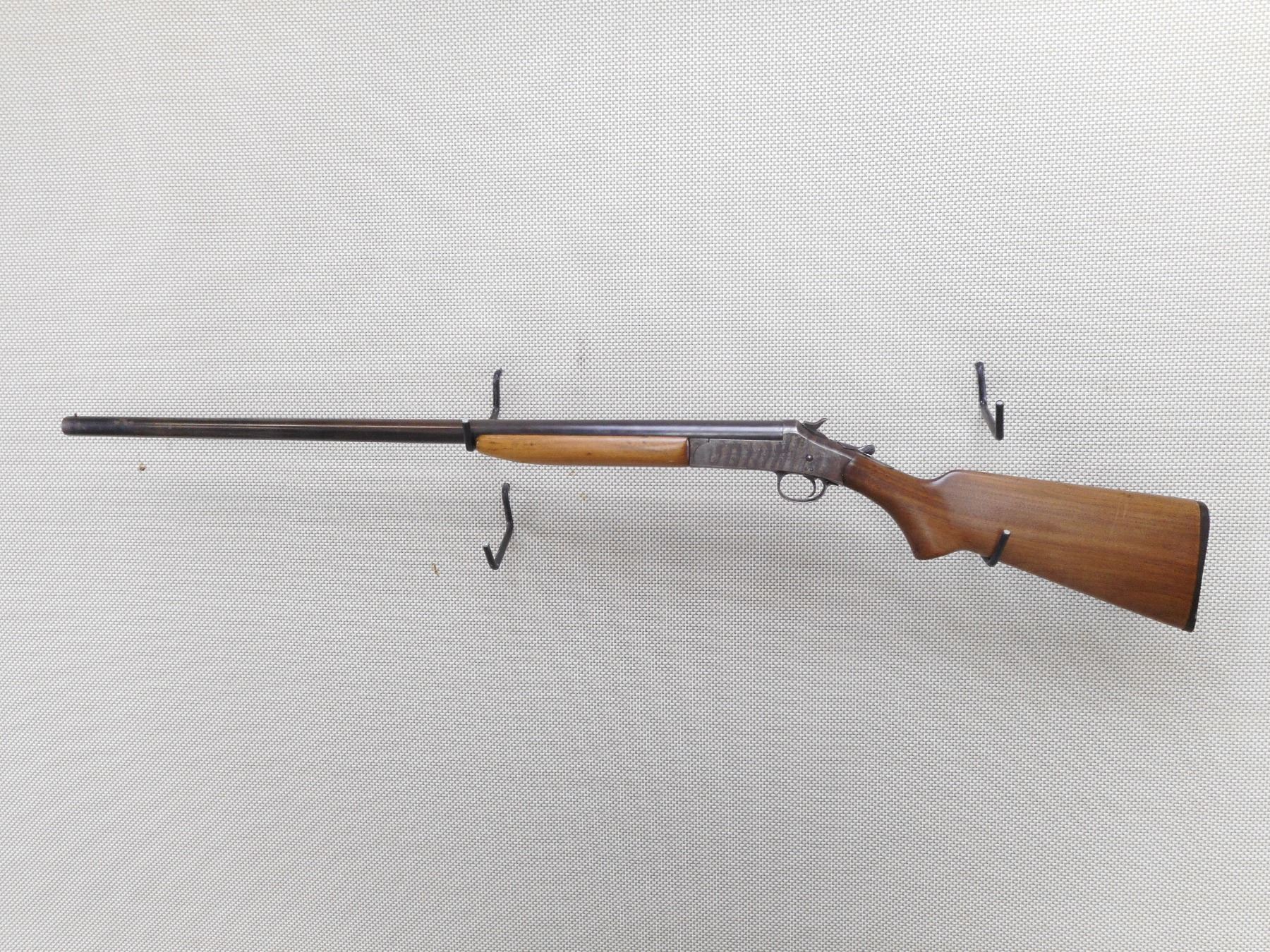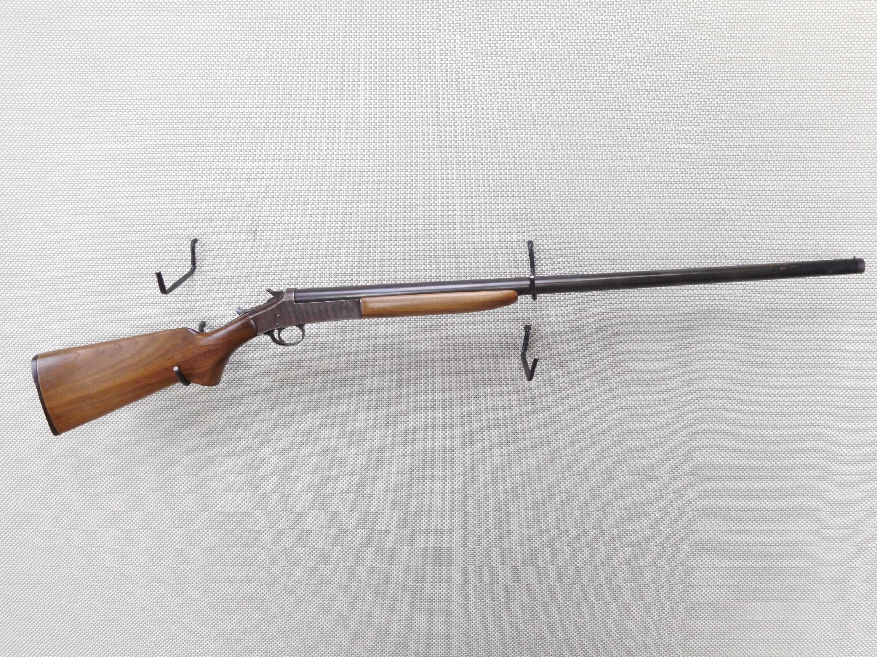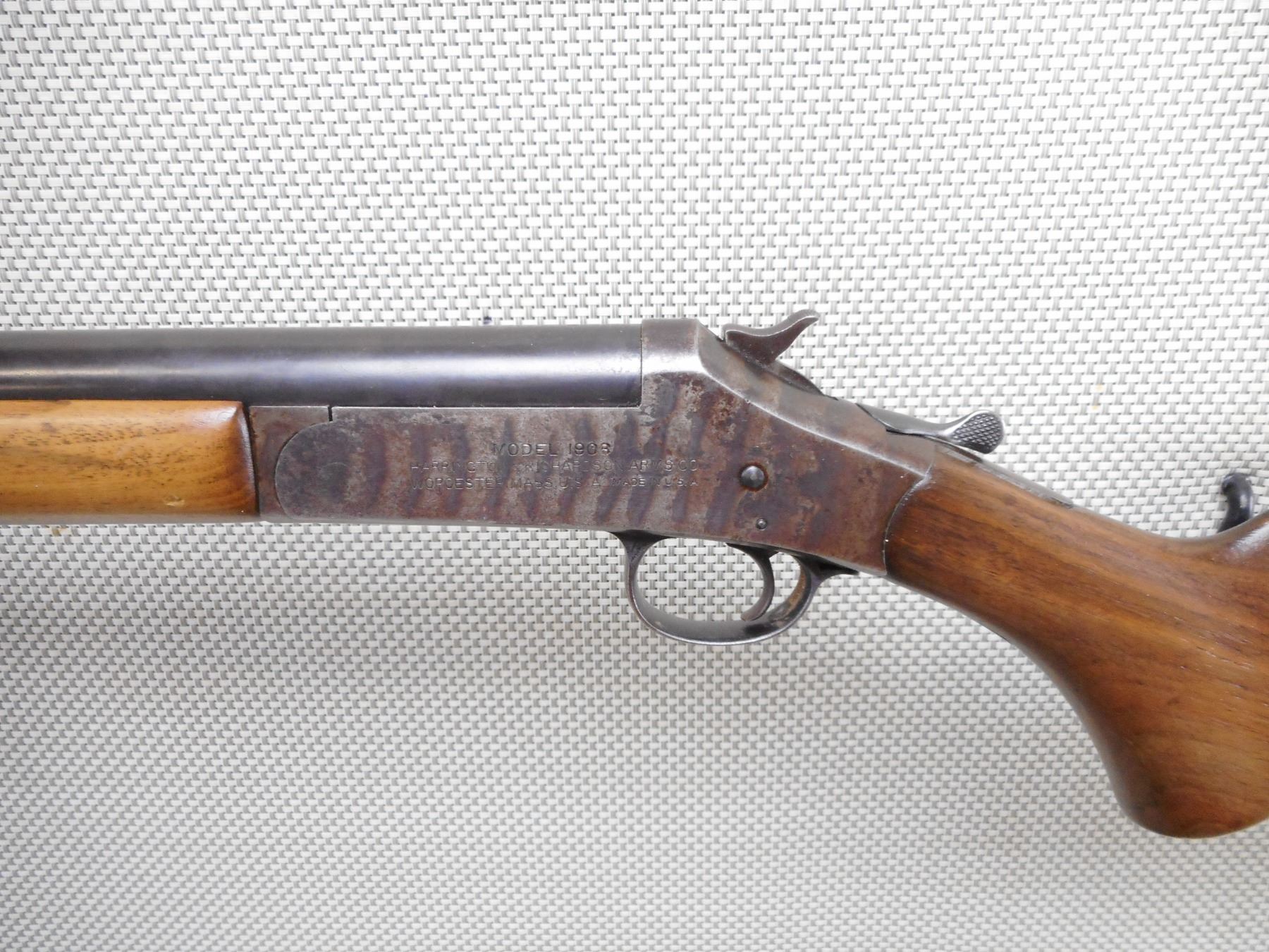 HARRINGTON & RICHARDSON , MODEL: 1903 , CALIBER: 12GA X 2 3/4" , BORE IS EXCELLENT. FIXED FULL CHOKE. BRASS BEAD FRONT SIGHT. BLUED FINISH ON BARREL IS TURNING GREY. COLOUR CASE HARDENED RECEIVER. SMOOTH WOOD FOREND. BUTT STOCK WITH PISTOL GRIP. ALL THE WOOD HAS BEEN REFINISHED. H&R LOGO BUTT PLATE. STOCK IS LOOSE. SHOWS NUMEROUS HANDLING MARKS AND WEAR.ACTION: SINGLE SHOT BREAK ACTION SHOT GUN , BARREL LENGTH: 30" , SERIAL # A489522 , CONDITION: 4/10 , CLASS: CANADIAN NON RESTRICTED CLASS