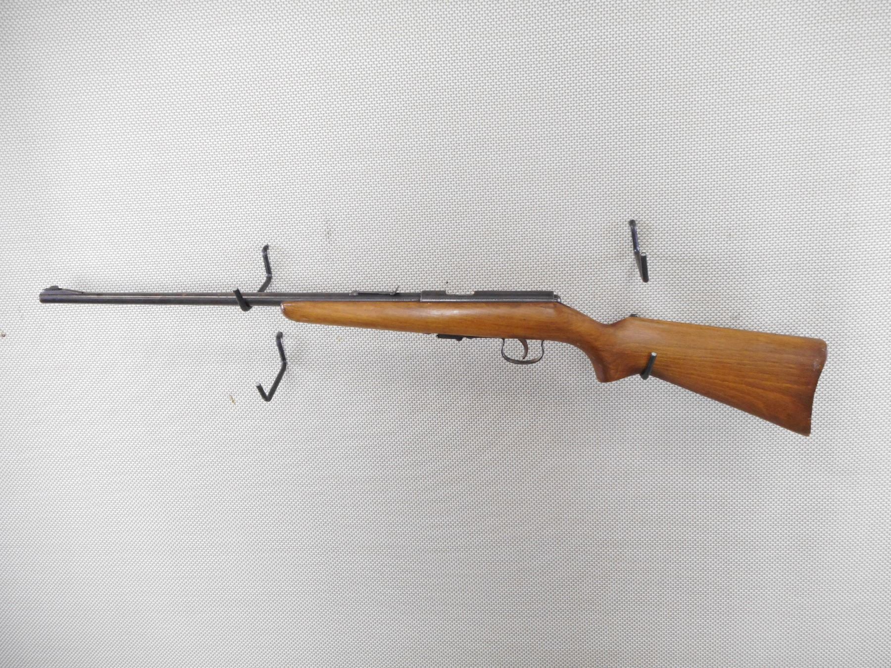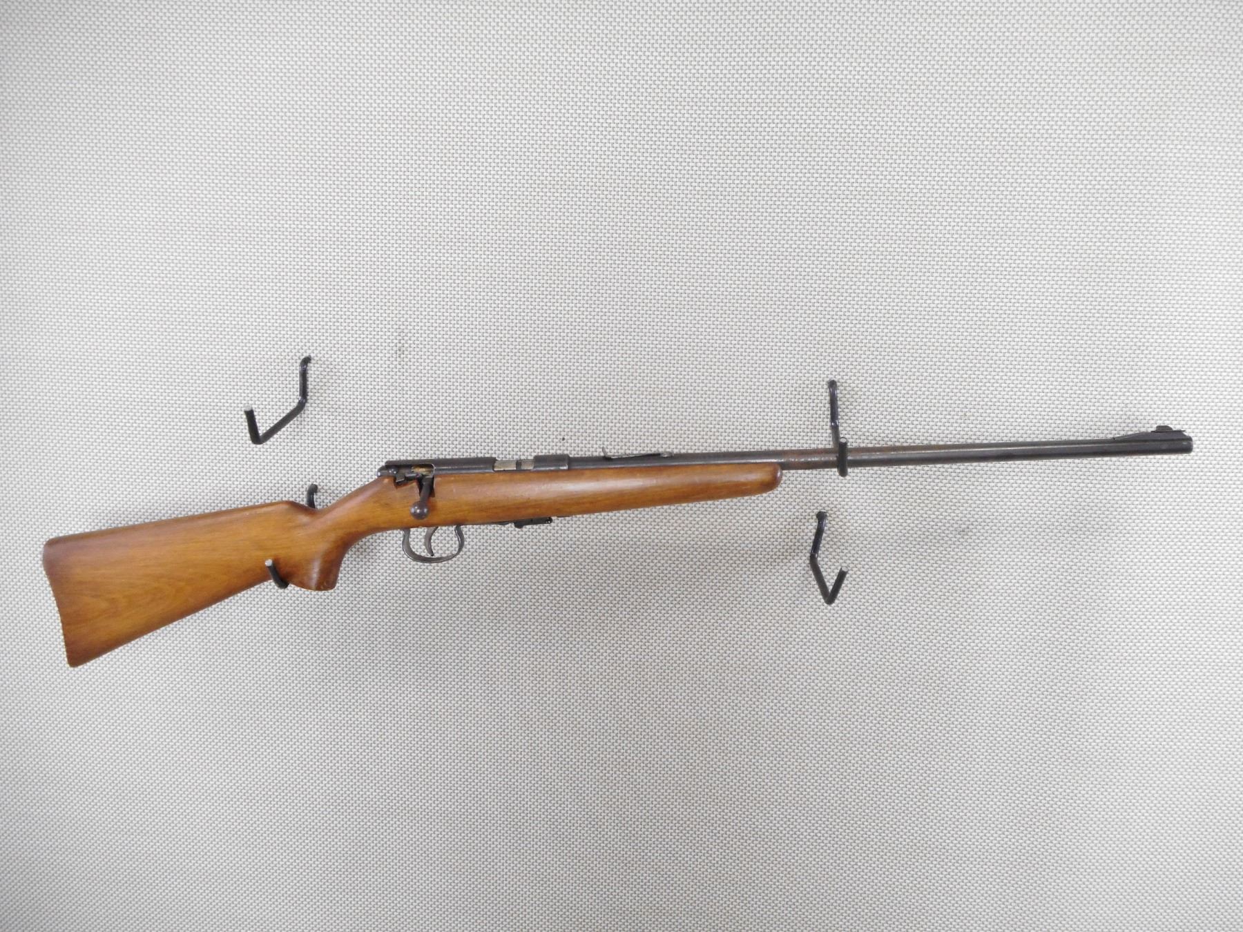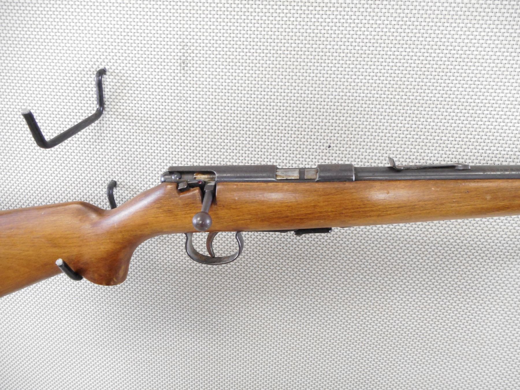 ANSCHUTZ , MODEL: REPEATER , CALIBER: 22 LR , COMES WITH MAGAZINE. BORE IS VERY GOOD. BLADE FRONT SIGHT WITH RAMP. U NOTCH REAR SIGHT MISSING THE ELEVATOR. METAL PARTS SHOW PITTING AND LIGHT RUST. SMOOTH WOOD STOCK. NO BUTT PLATE. 9 DIGIT # STENCILED ON THE RIGHT SIDE OF THE BARREL. NUMEROUS HANDLING MARKS AND WEAR. ACTION: BOLT ACTION RIFLE , BARREL LENGTH: 21 1/2" , SERIAL # 0117169 , CONDITION: 4/10 , CLASS: CANADIAN NON RESTRICTED CLASS